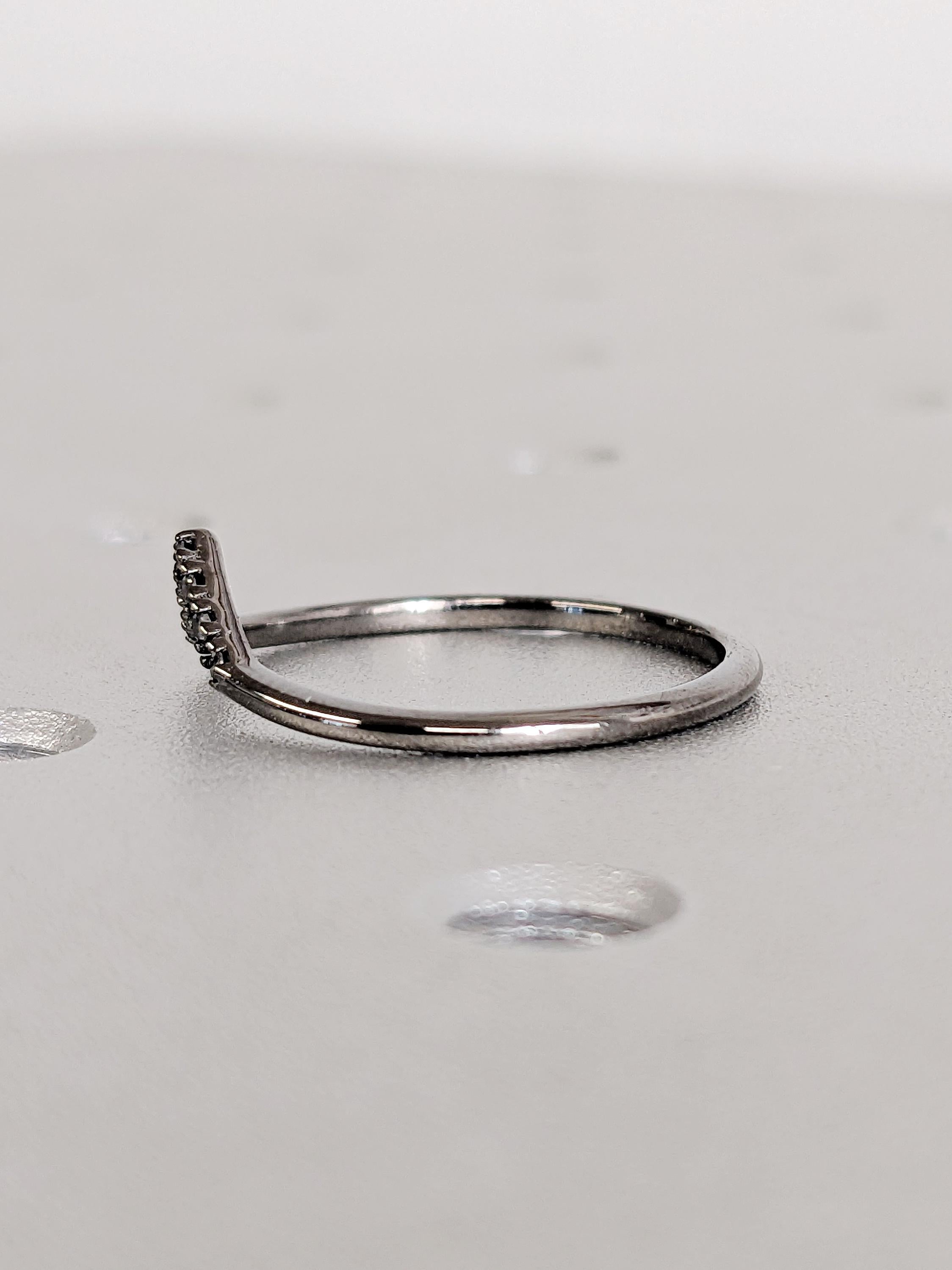 This elegant chevron ring is adorned with pavé set black diamond accents, offering a sleek look that shines on its own or stacks effortlessly with your favorite bands. Perfect for everyday sophistication, this piece brings a contemporary edge to any collection.