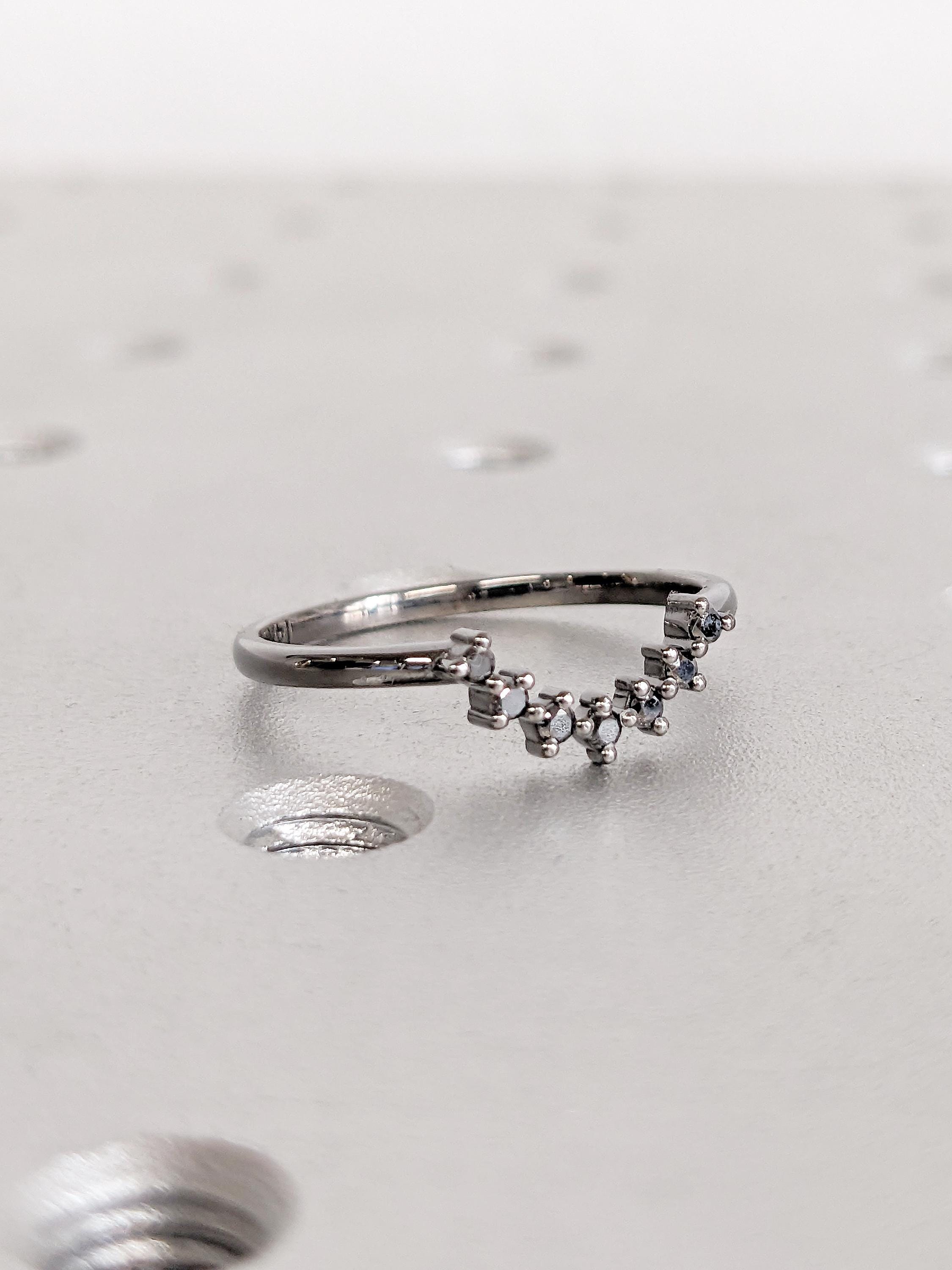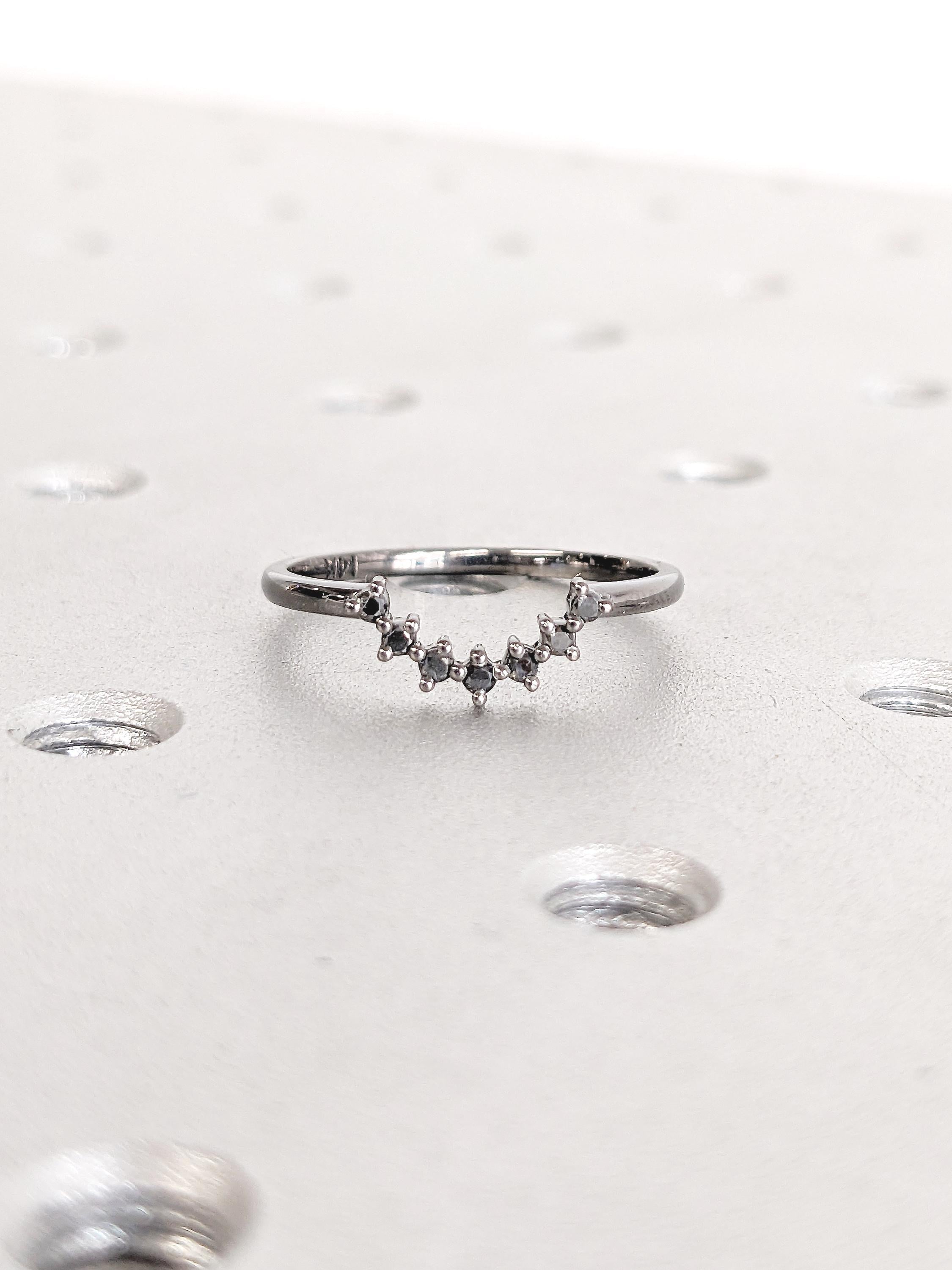 This unique curved wedding band is adorned with a row of shimmering round Black Diamond accents, gracefully set along the slender band. Its subtle curve is designed to complement an engagement ring beautifully, while the striking black diamonds bring a modern yet timeless touch to its vintage-inspired charm.