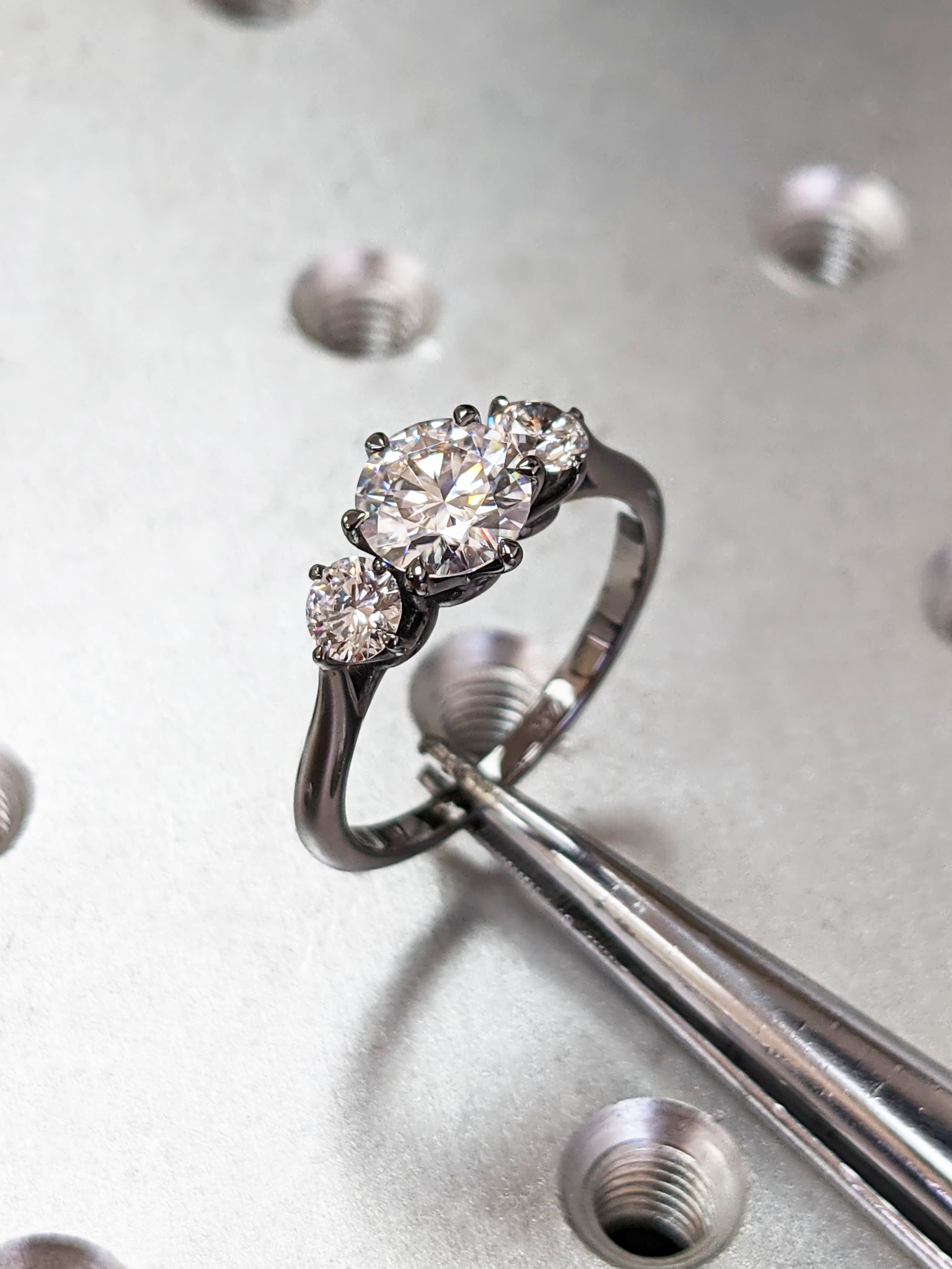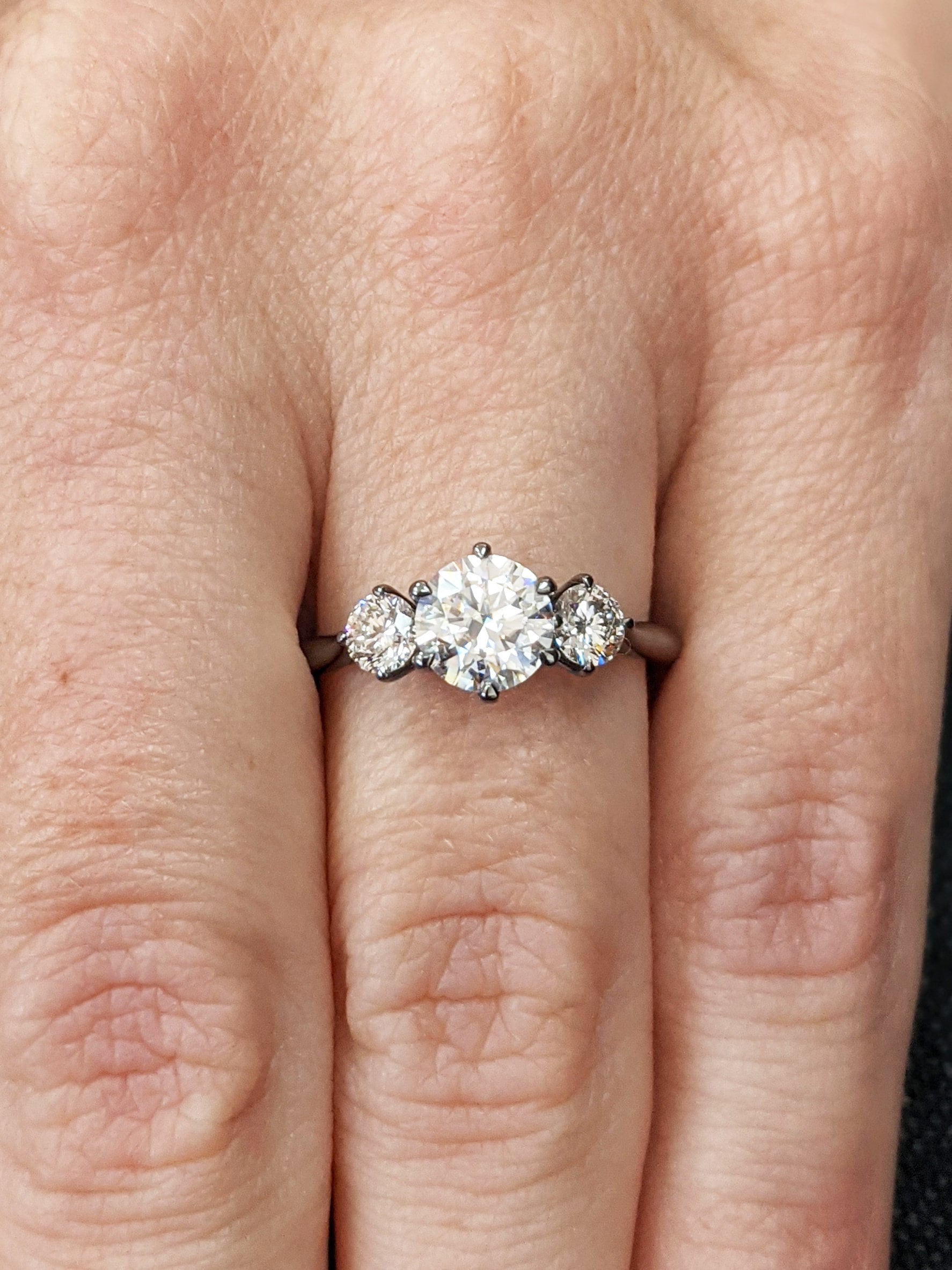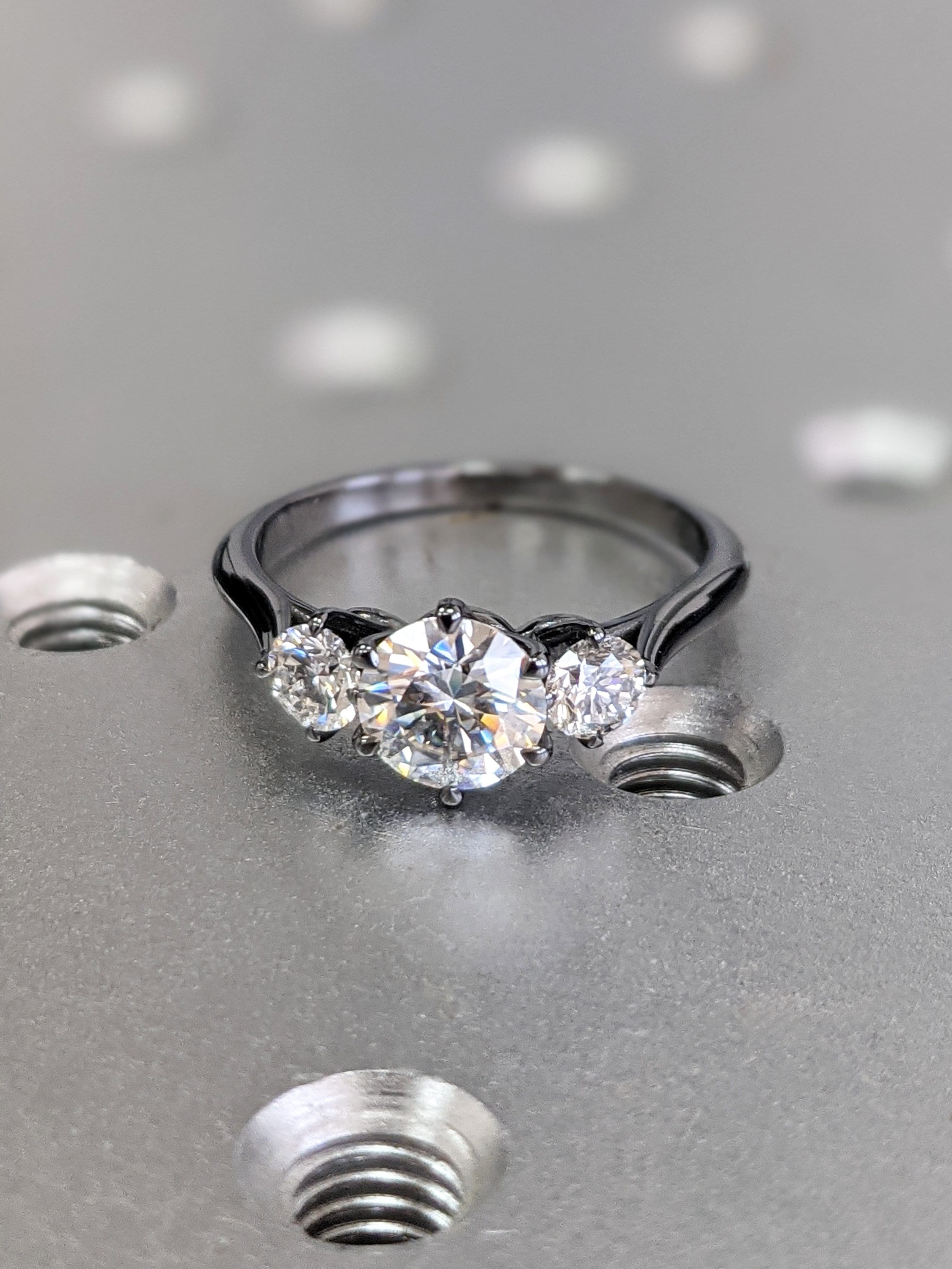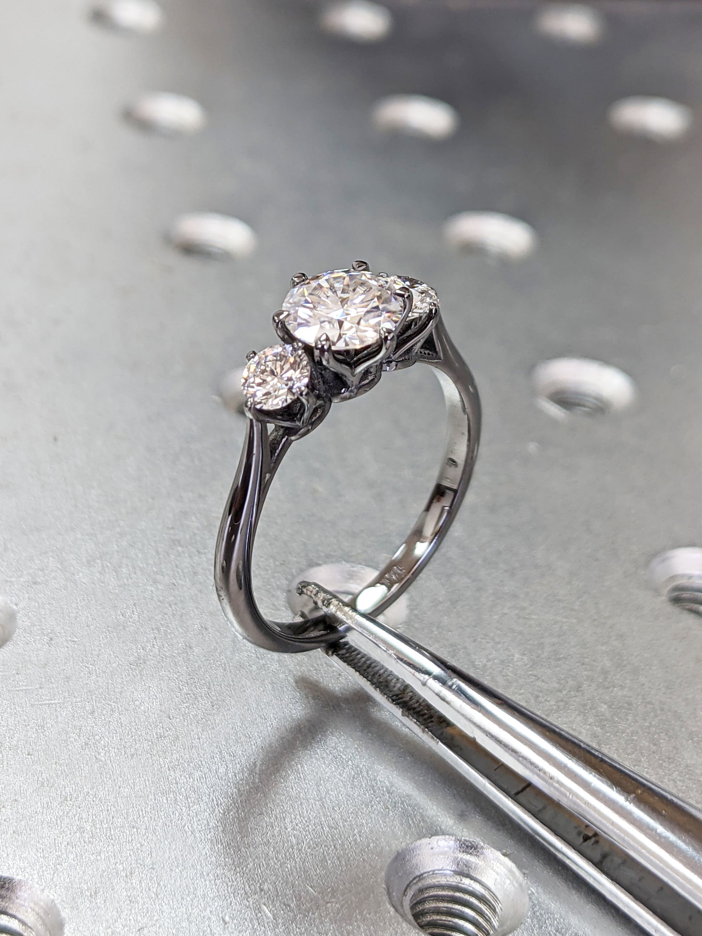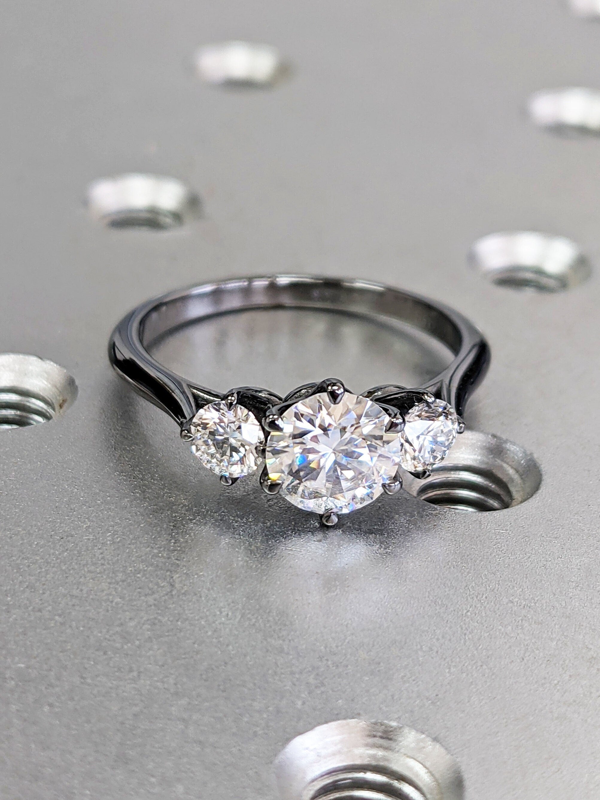 14K Black Gold Three Stone Moissanite Engagement Ring, three stone ring, Anniversary gift for her, White Moissanite Diamond Engagement Ring