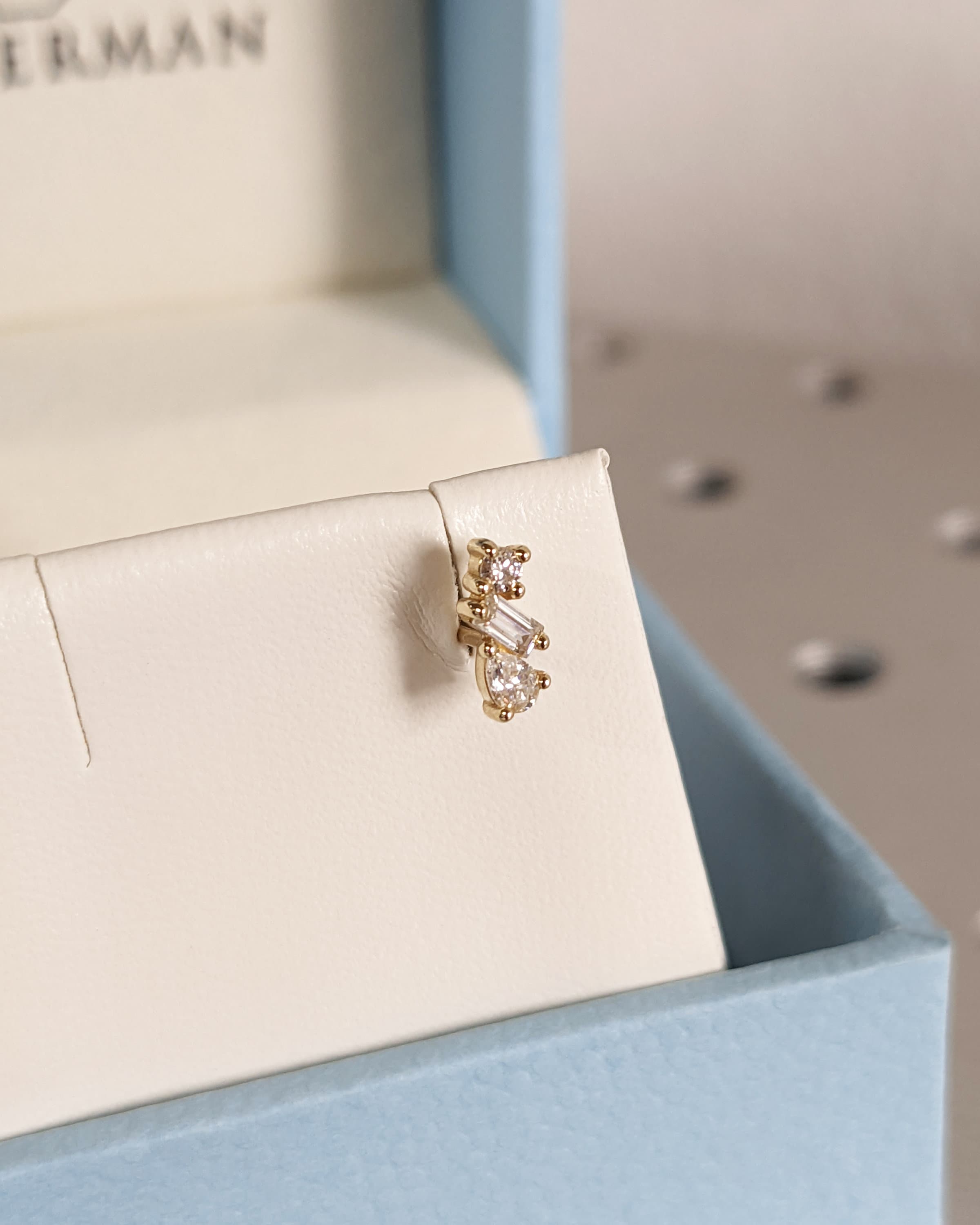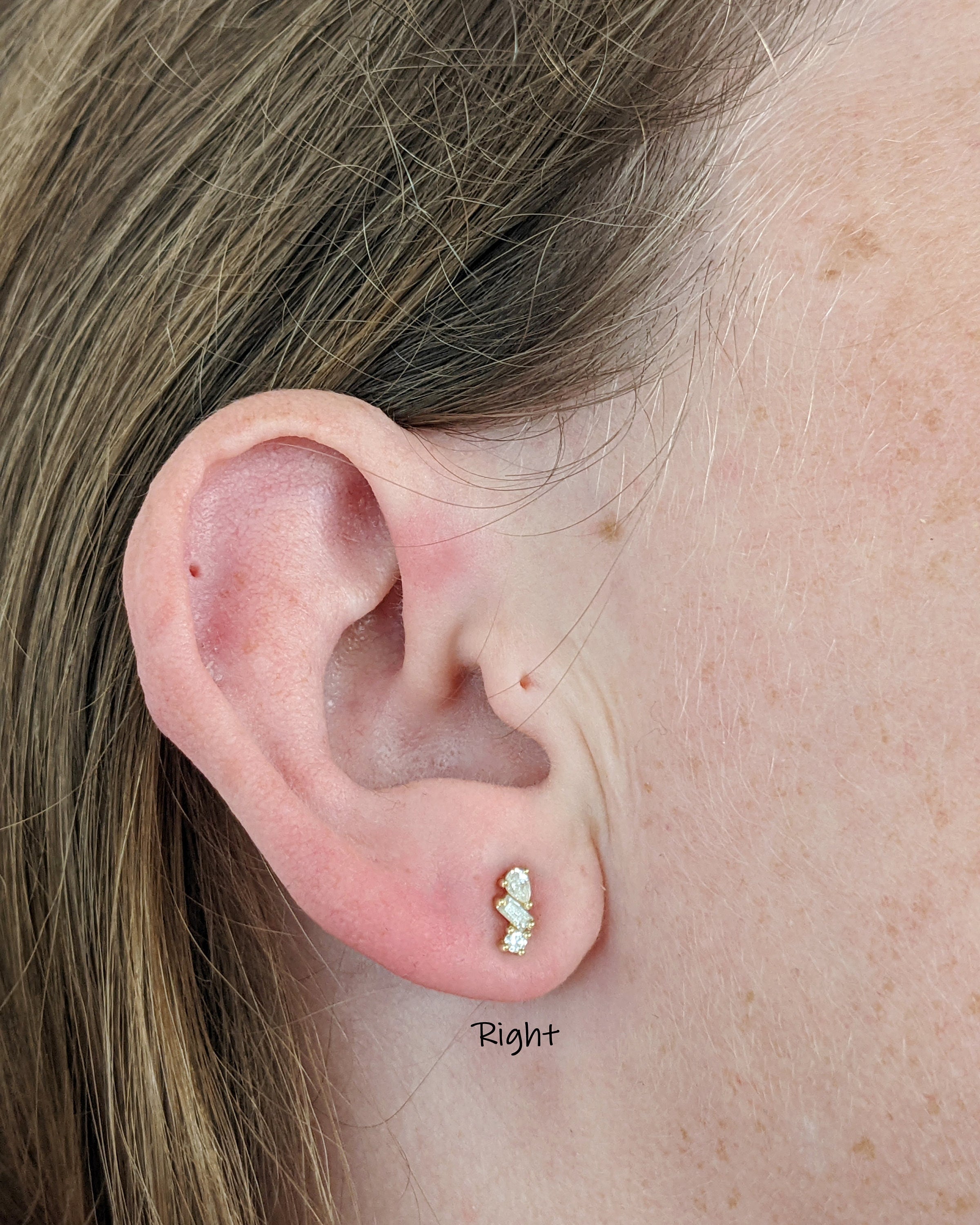 Elevate your style with our enchanting three-stone solid gold earrings, featuring a delicate cluster of tiny pear, baguette, and round Moissanites. Whether you opt for a single earring or a pair, these earrings effortlessly combine classic charm with modern sophistication for an exquisite addition to your jewelry ensemble.