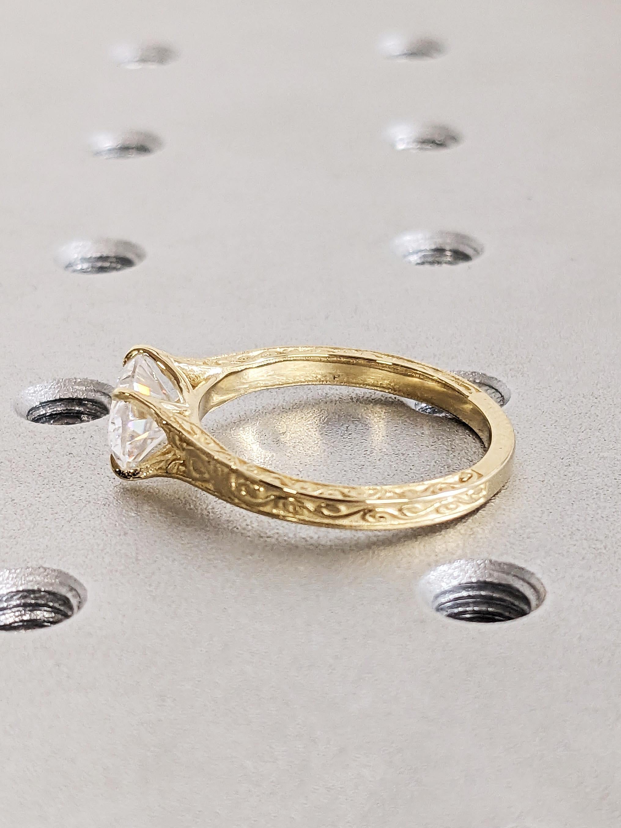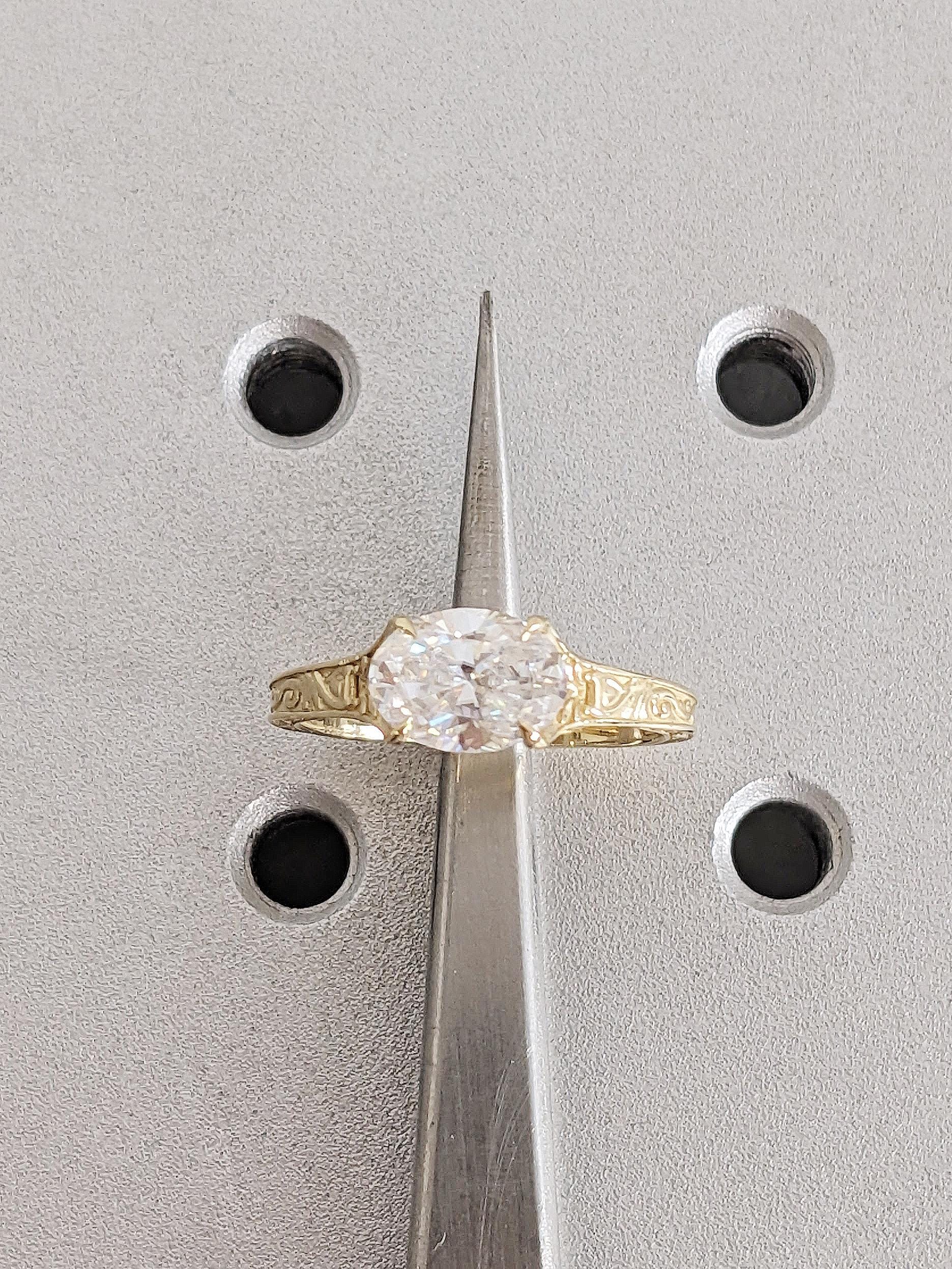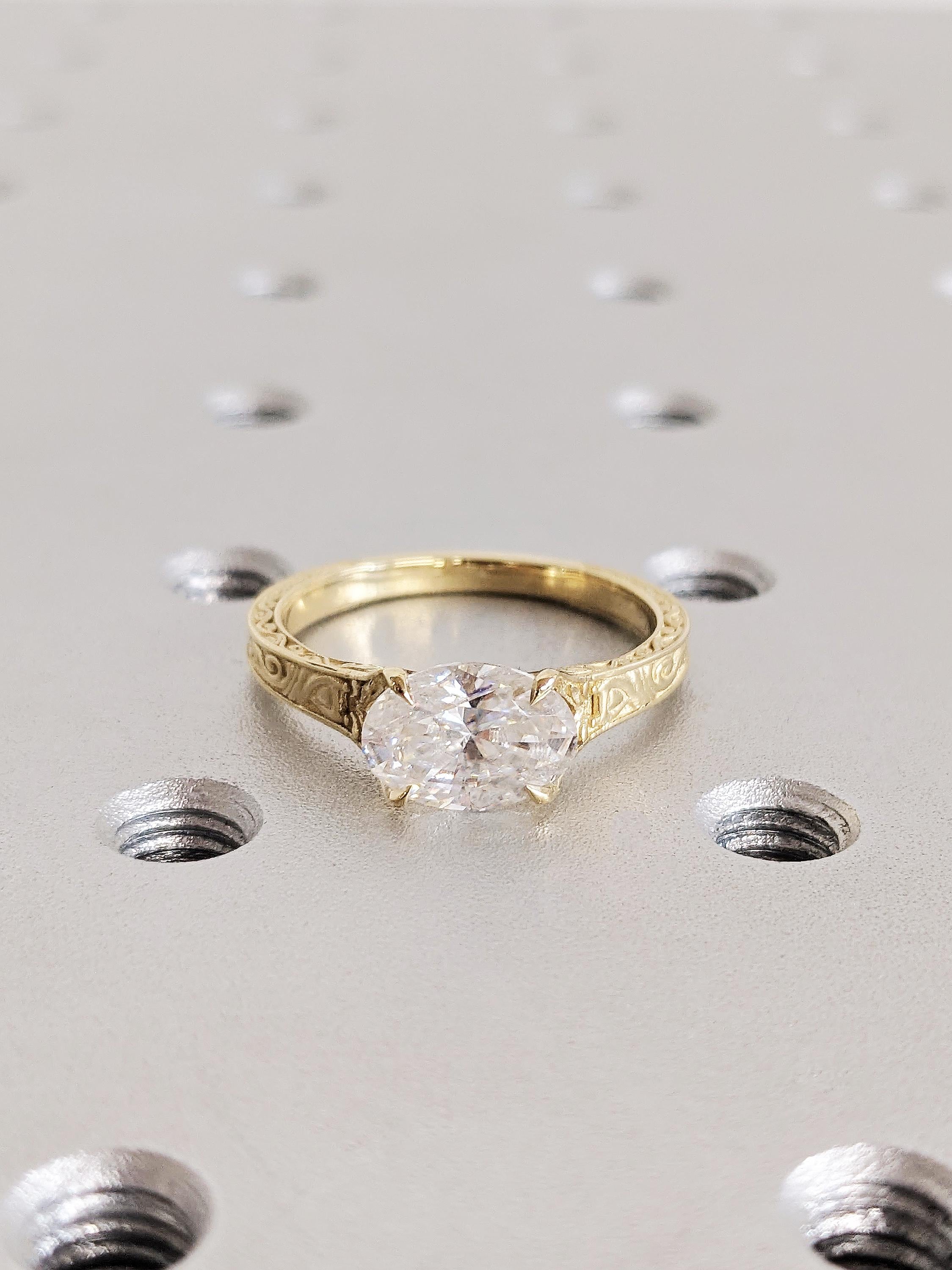 This vintage engagement ring features a brilliant oval Moissanite set in an elegant east west setting and secured with refined talon prongs, creating a graceful silhouette. The band is adorned with intricate filigree engraving, adding depth, texture and an antique charm to the design.