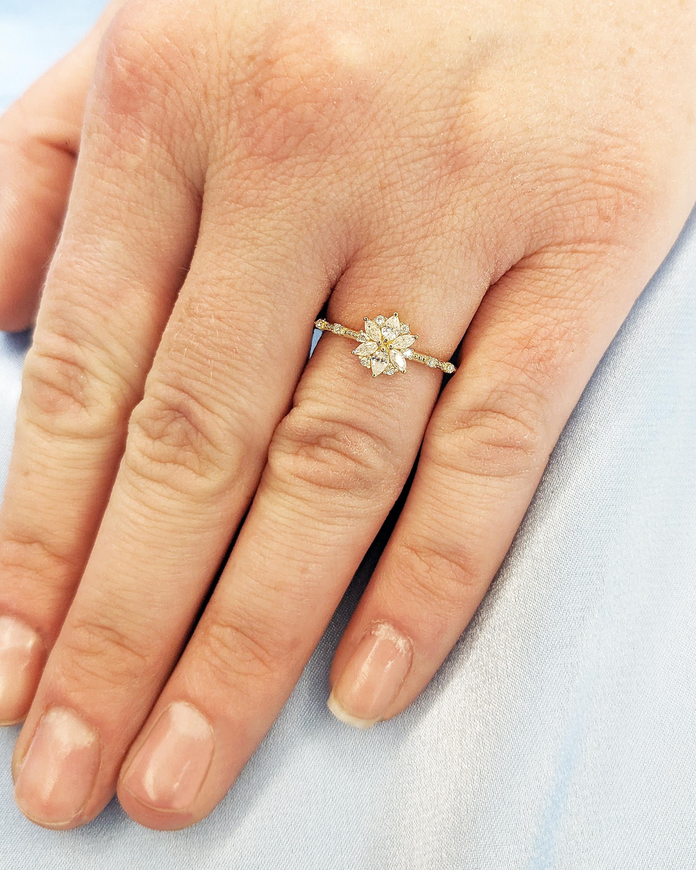 Embrace the essence of nature with this breathtaking floral-inspired ring. The center arrangement of marquise, pear, and round-cut stones creates a blooming flower, symbolizing love in full flourish. Small round stones gracefully accent the dainty band like dewdrops on delicate petals, enhancing the organic charm of this nature-inspired design. Reminiscent of spring’s sweet air and wild beauty, this ring captures the essence of harmony and renewal, making it a dreamy and romantic choice for those who adore floral elegance in their jewelry.