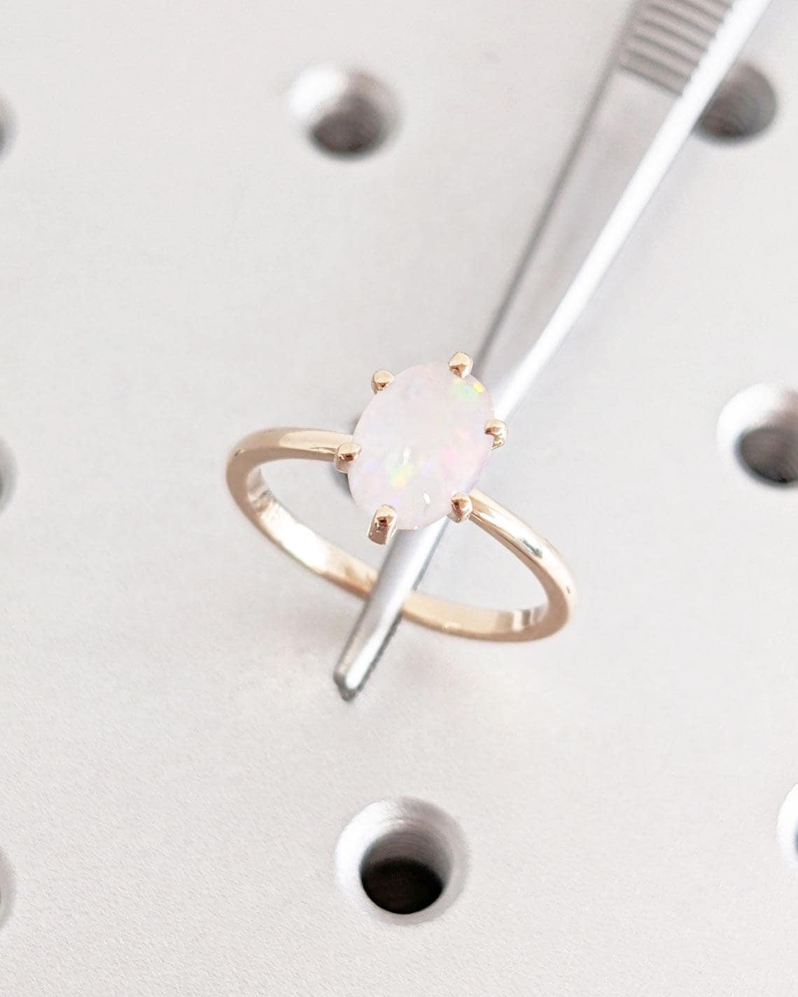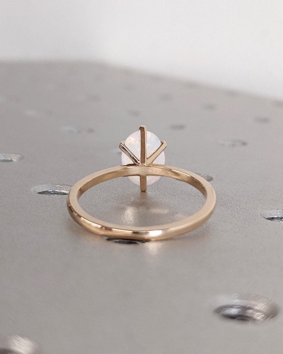 A classic solitaire ring features an oval cut Opal focal stone, held elegantly by a six prong setting. Minimalist and timeless, this ring is the perfect gift for her on any occasion.