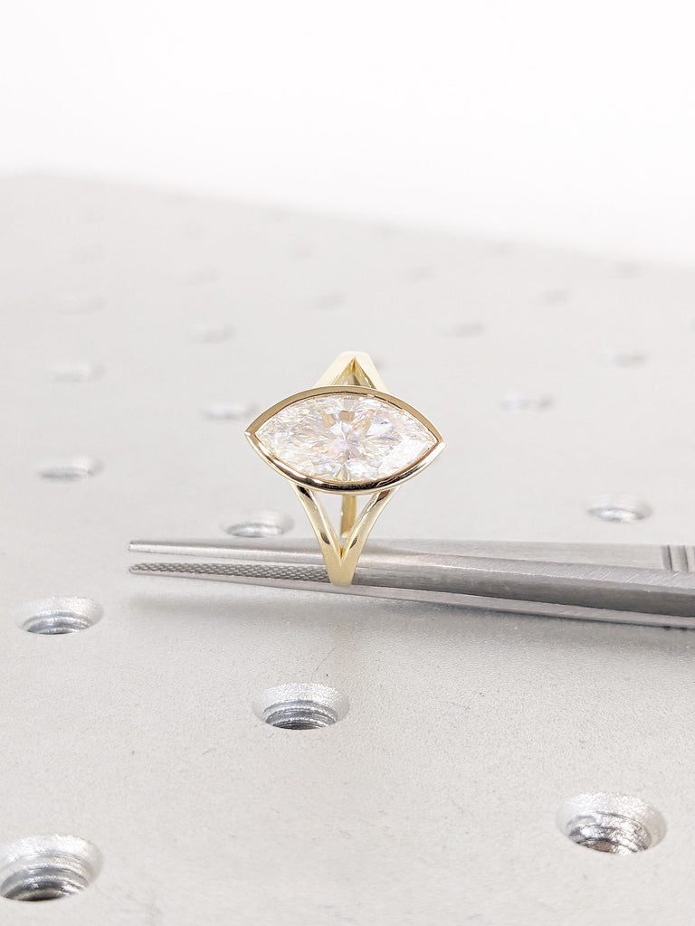 This elegant engagement ring features a bezel set marquise cut Lab Grown Diamond on a split shank gold band. The bezel setting offers a sleek, modern look while enhancing durability and brilliance. Perfect for those who love timeless beauty with a unique twist.