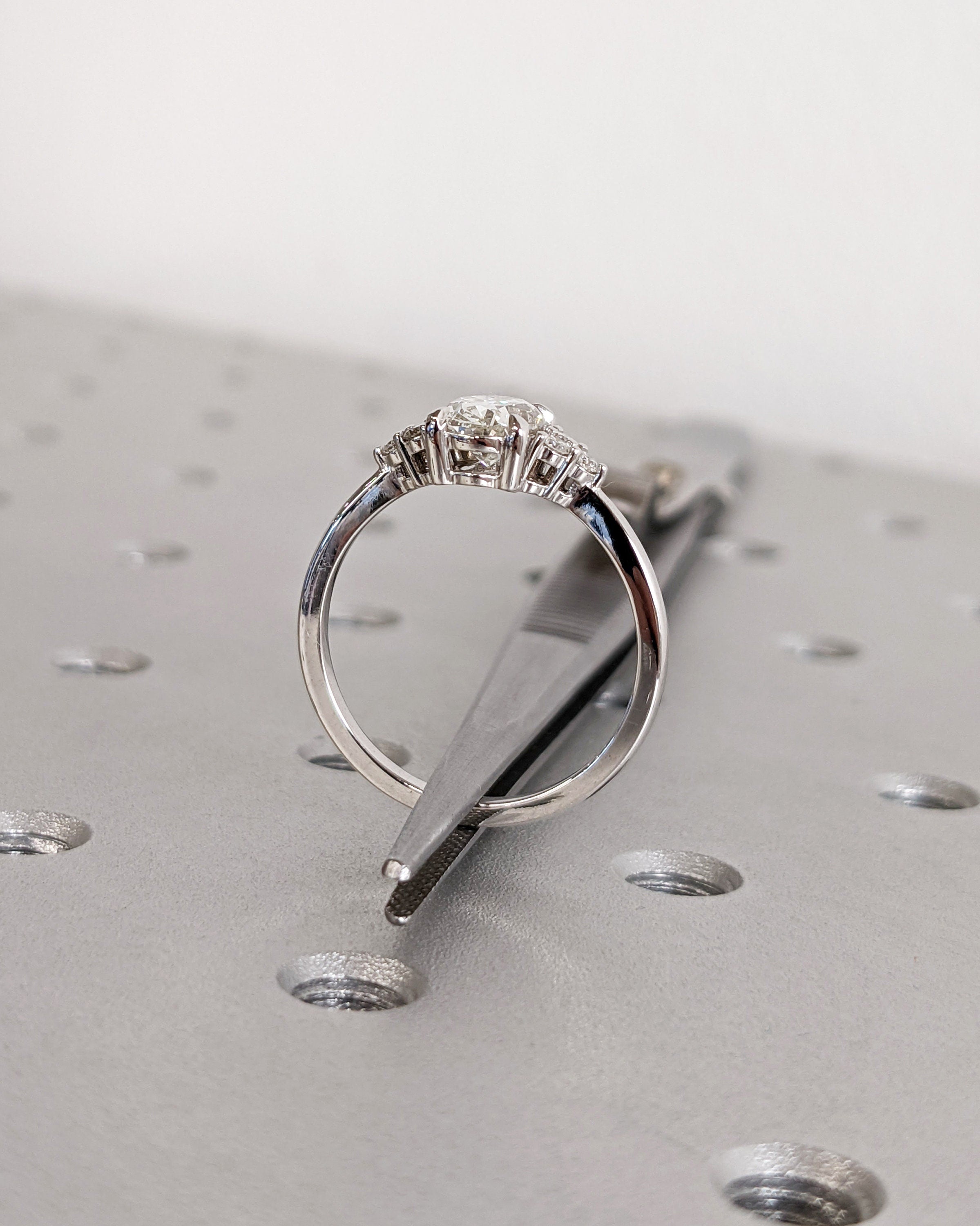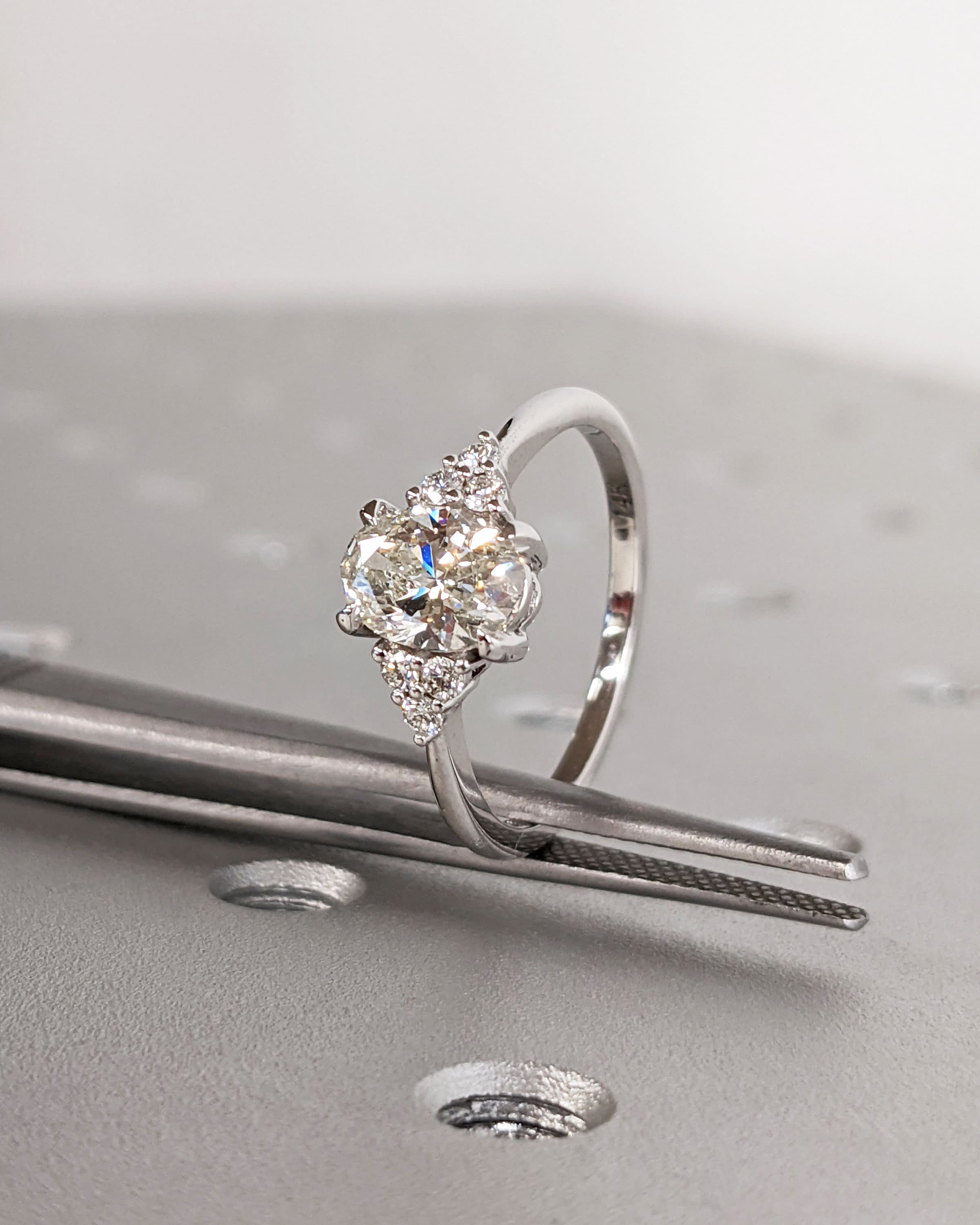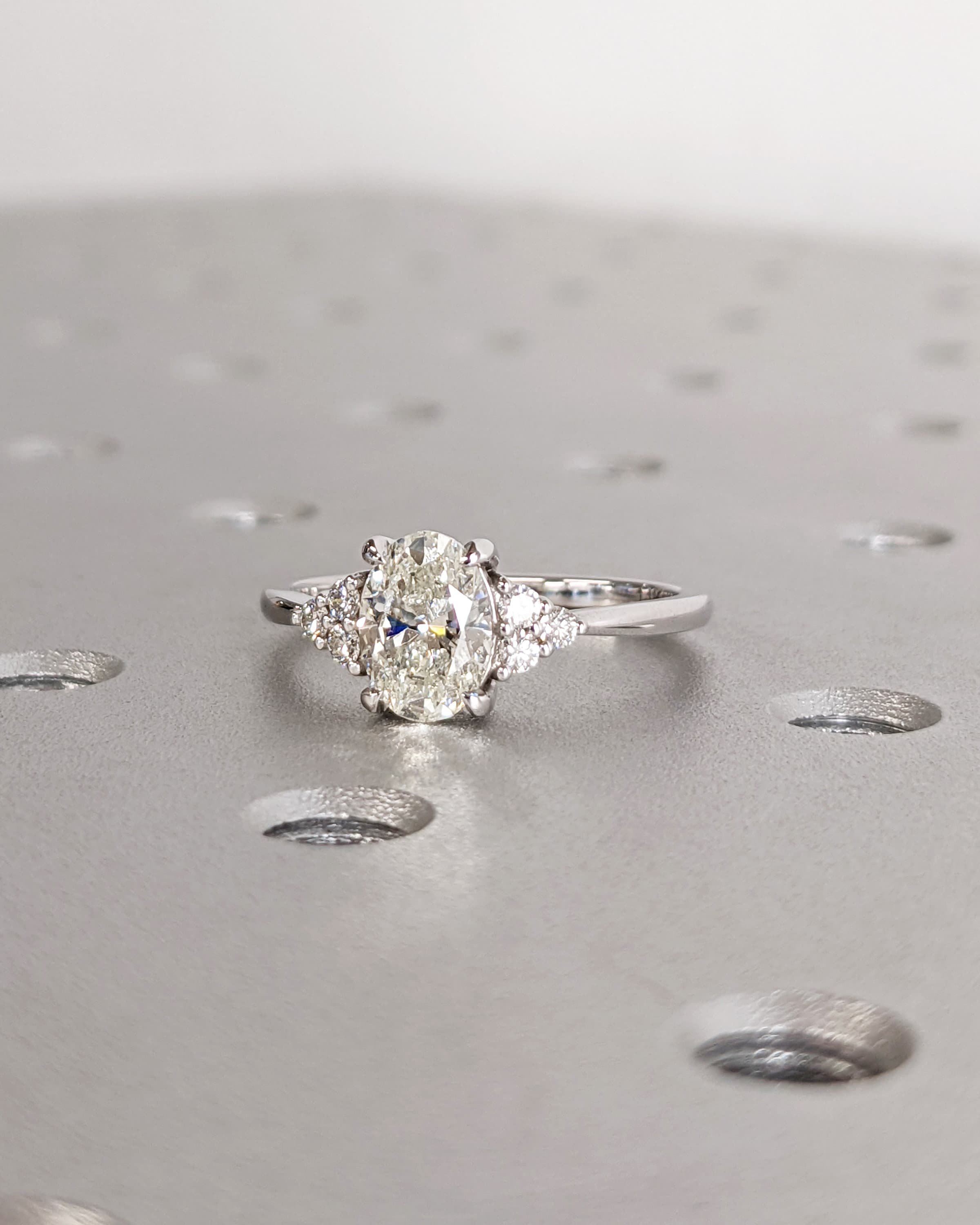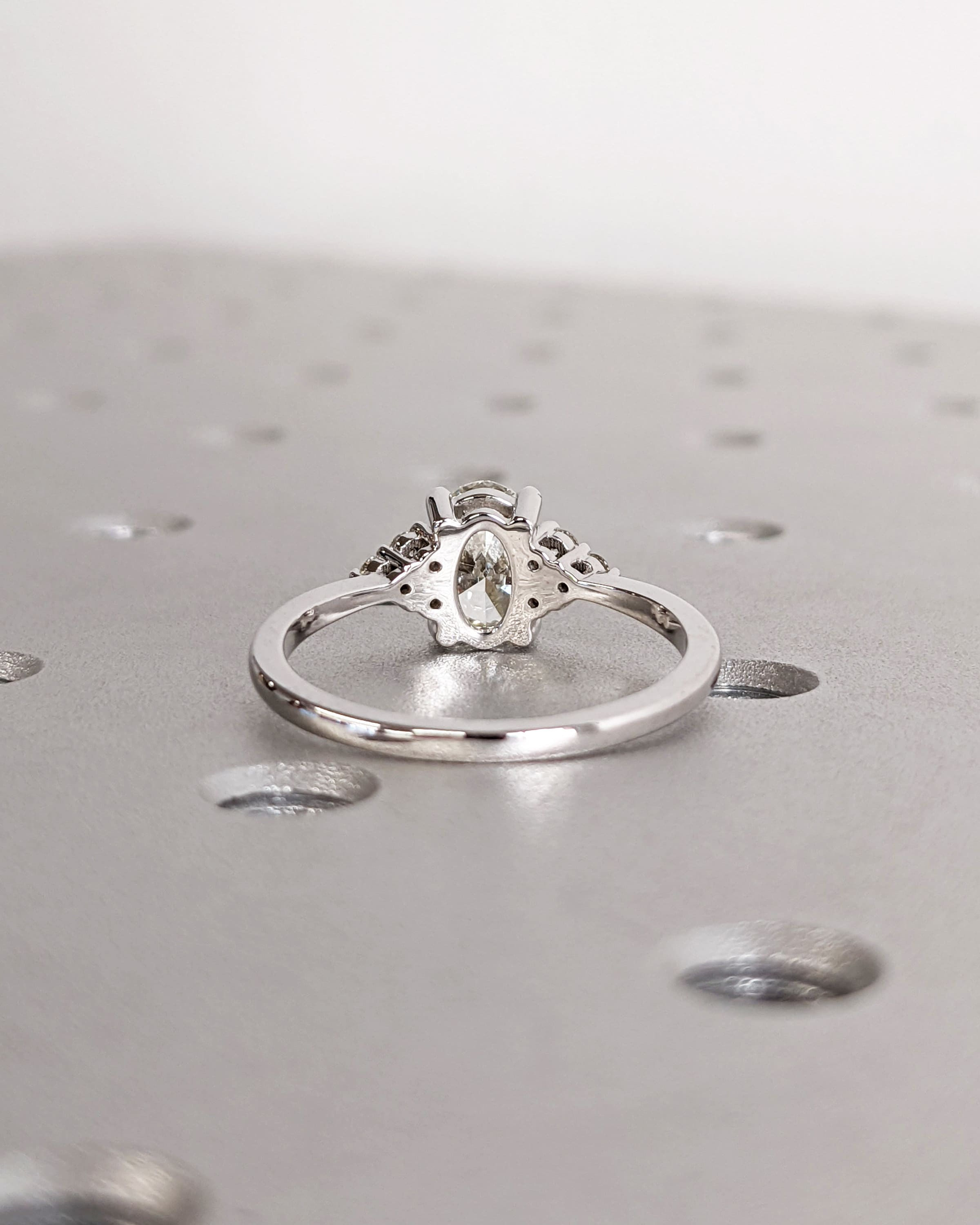 A classic piece of handmade jewelry, this dainty ring features an oval cut Moissanite center, accented by cluster of round cut side stones in your choice of natural diamonds, man made diamonds or moissanites. Its slender 1.6mm width band gives it a refined appearance, elegant for any special occasion.