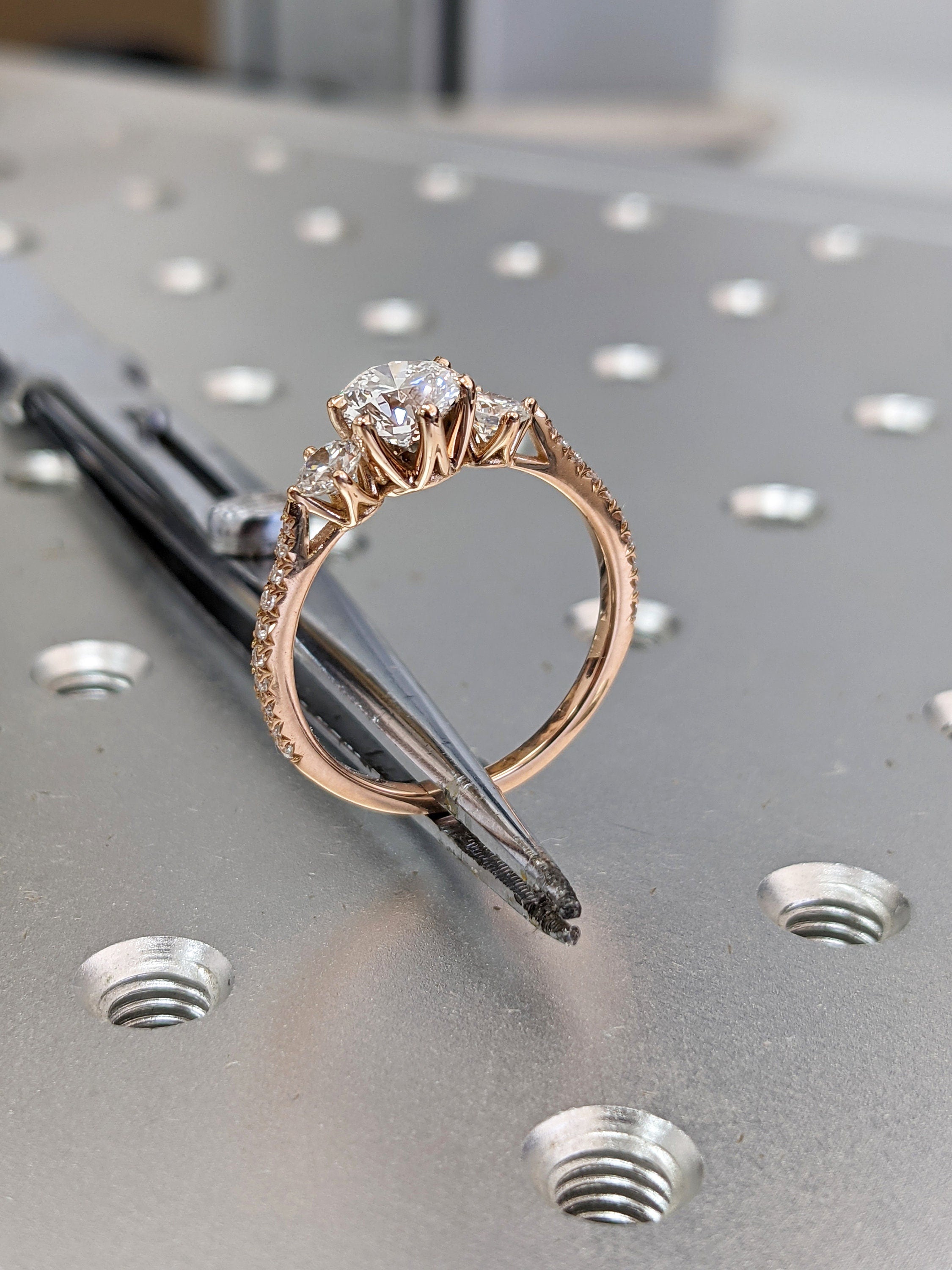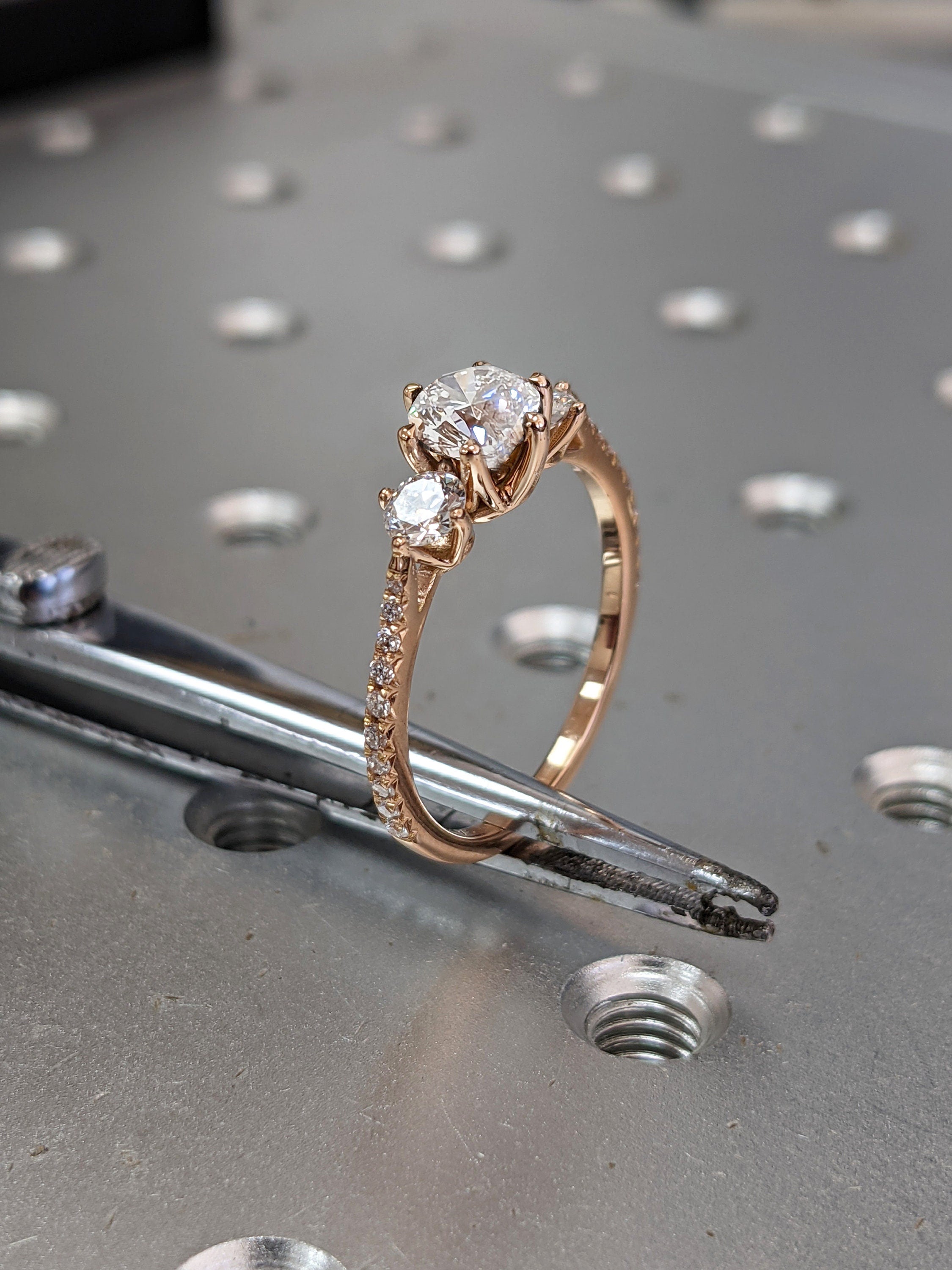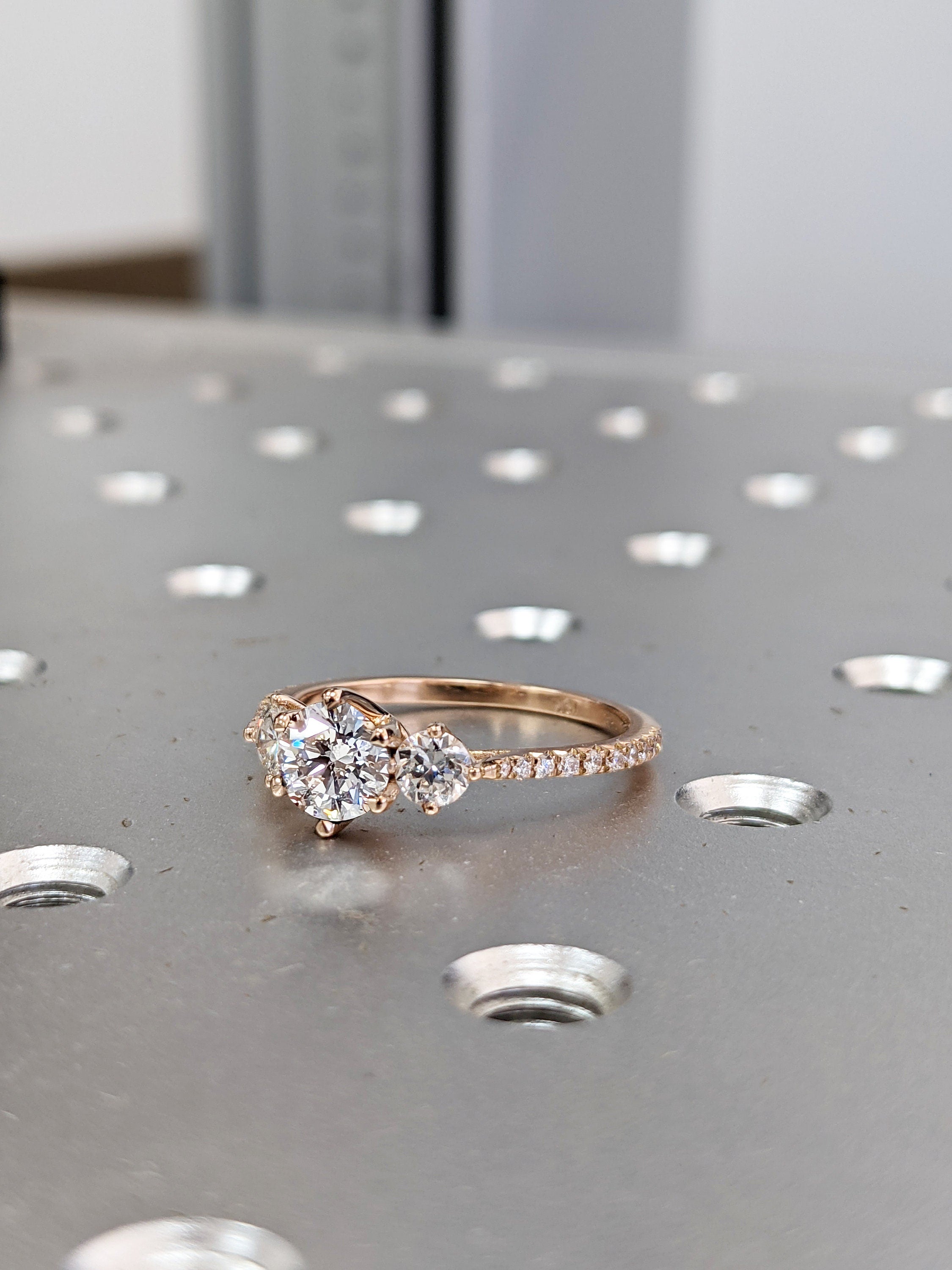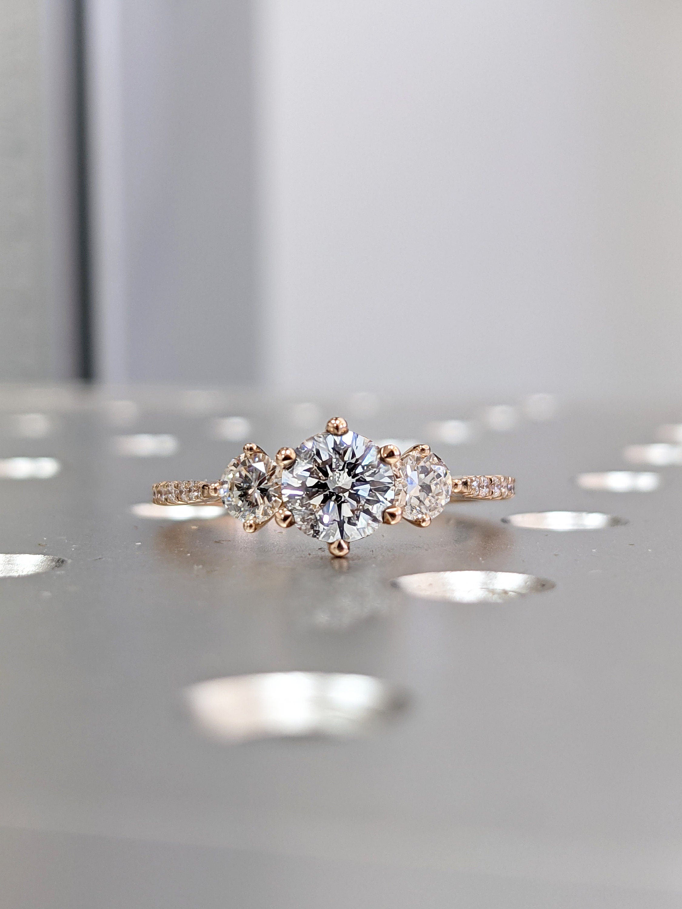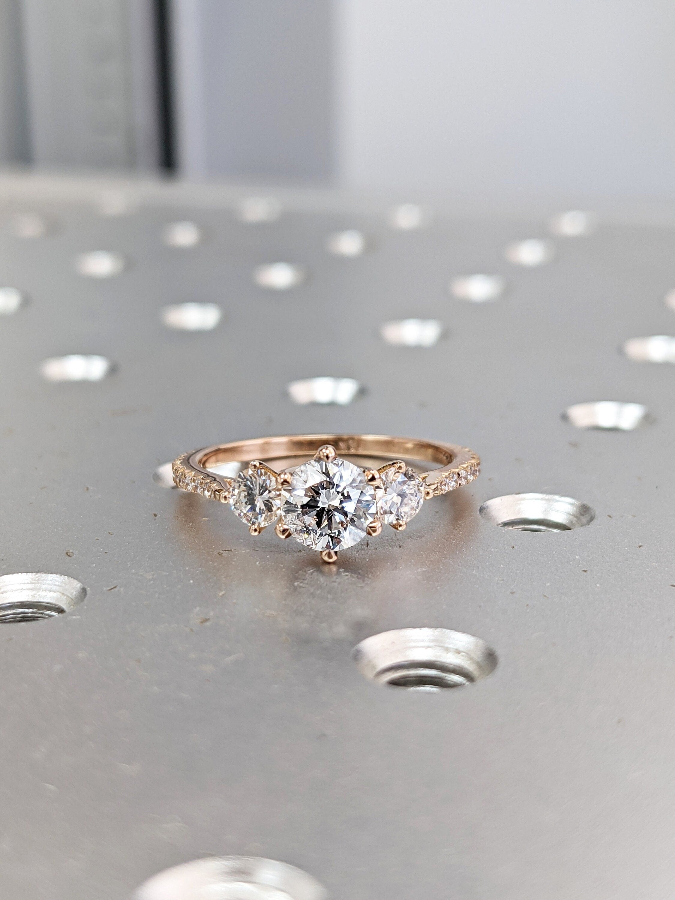 14K Rose Gold 3 Stone Promise Ring For Her, Three Stone Engagement Ring With Side Stones, Simulated Diamond Ring, Past Present Future Ring