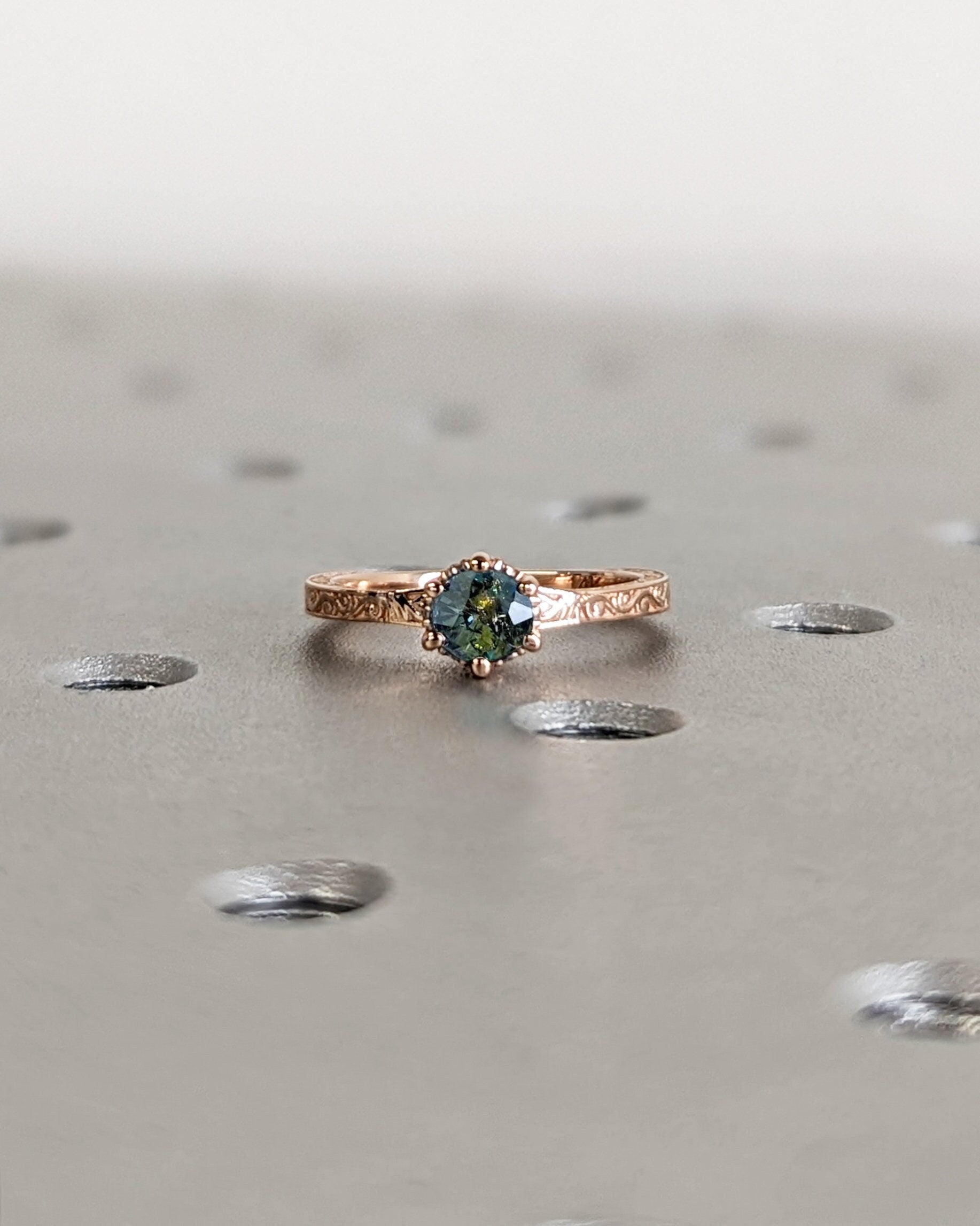 14k Rose Gold Blue Green Sapphire Round cut Solitaire Ring: With Hidden Halo and Hand Engrave Filigree Band