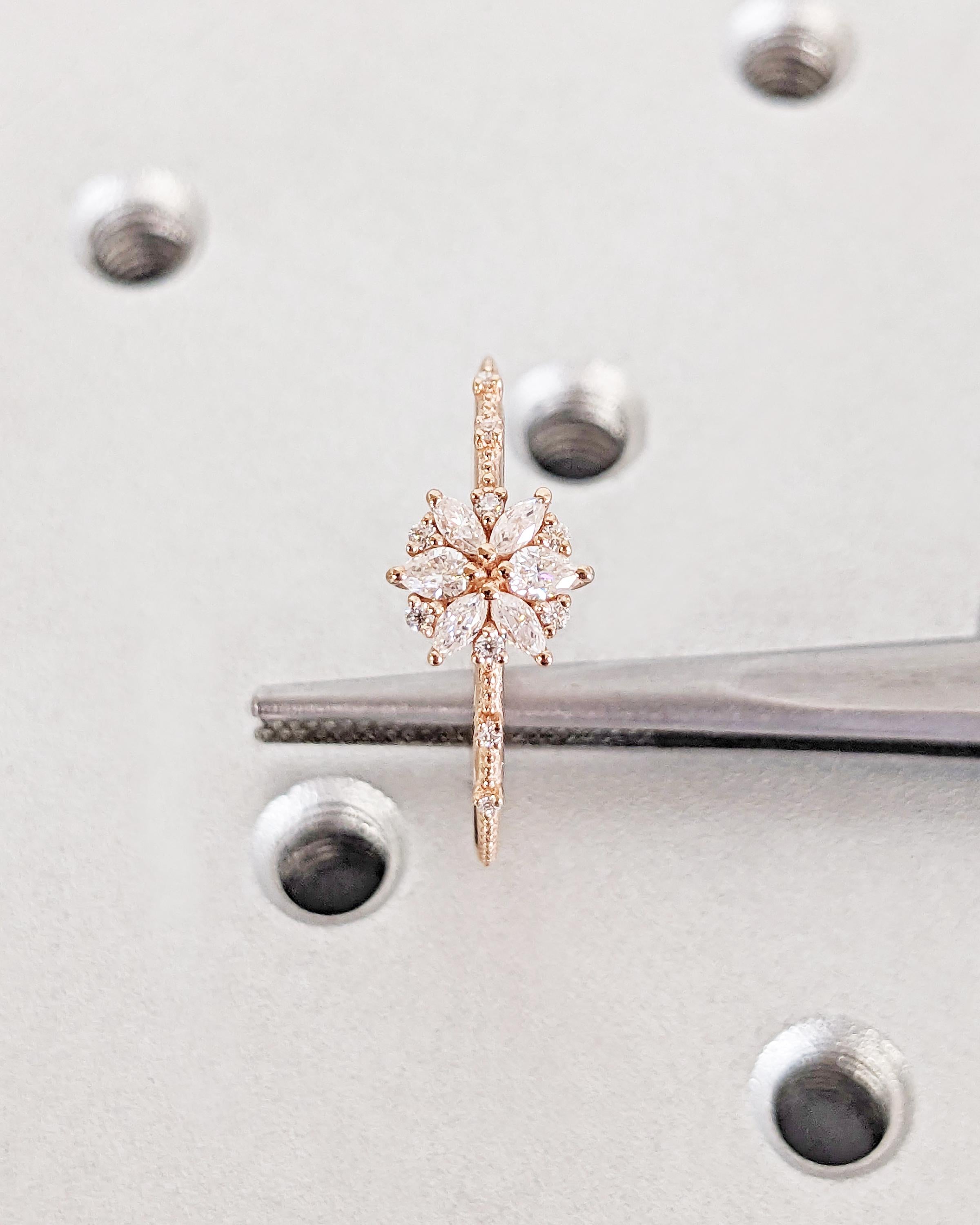 Embrace the essence of nature with this breathtaking floral-inspired ring. The center arrangement of marquise, pear, and round-cut stones creates a blooming flower, symbolizing love in full flourish. Small round stones gracefully accent the dainty band like dewdrops on delicate petals, enhancing the organic charm of this nature-inspired design. Reminiscent of spring’s sweet air and wild beauty, this ring captures the essence of harmony and renewal, making it a dreamy and romantic choice for those who adore floral elegance in their jewelry.