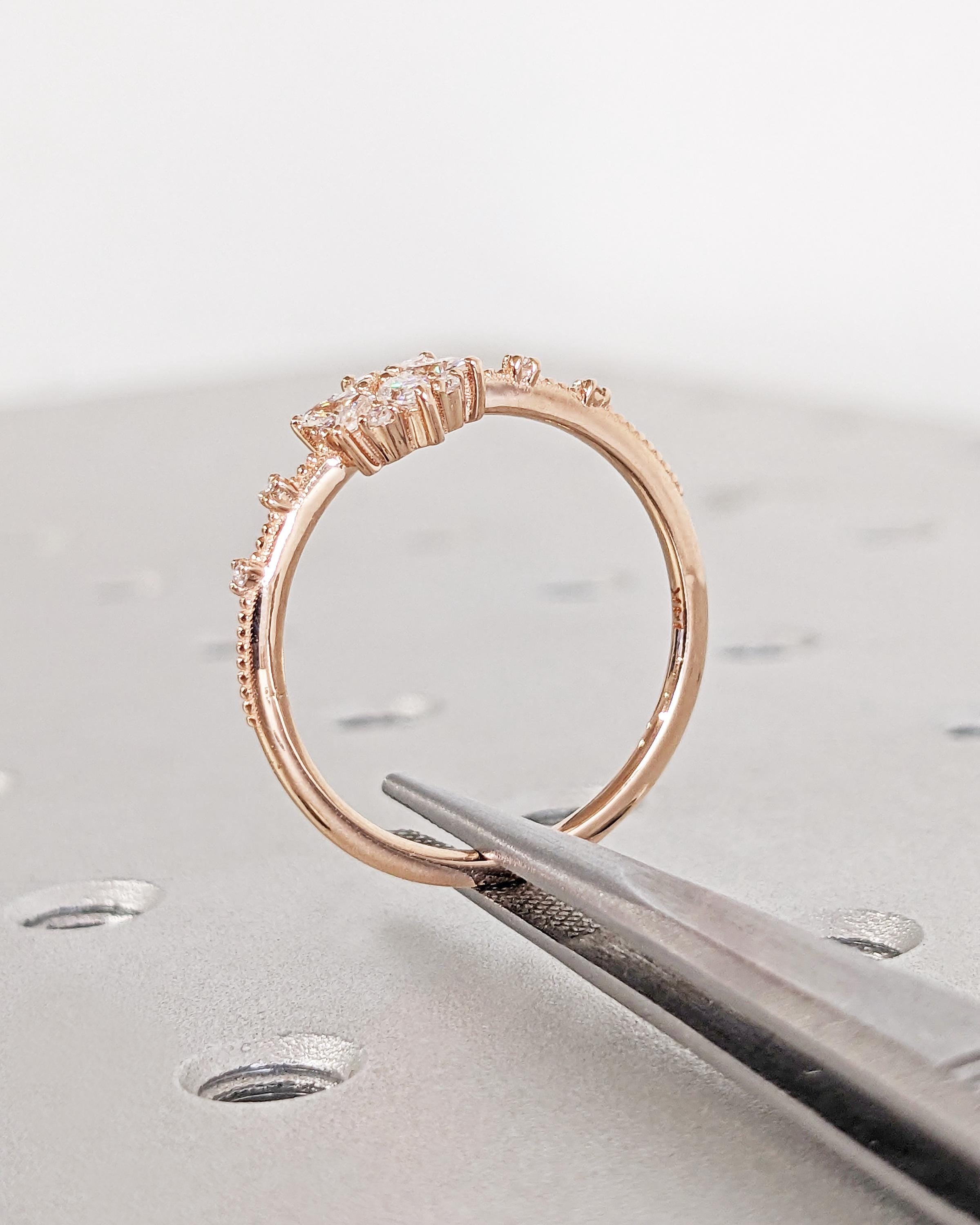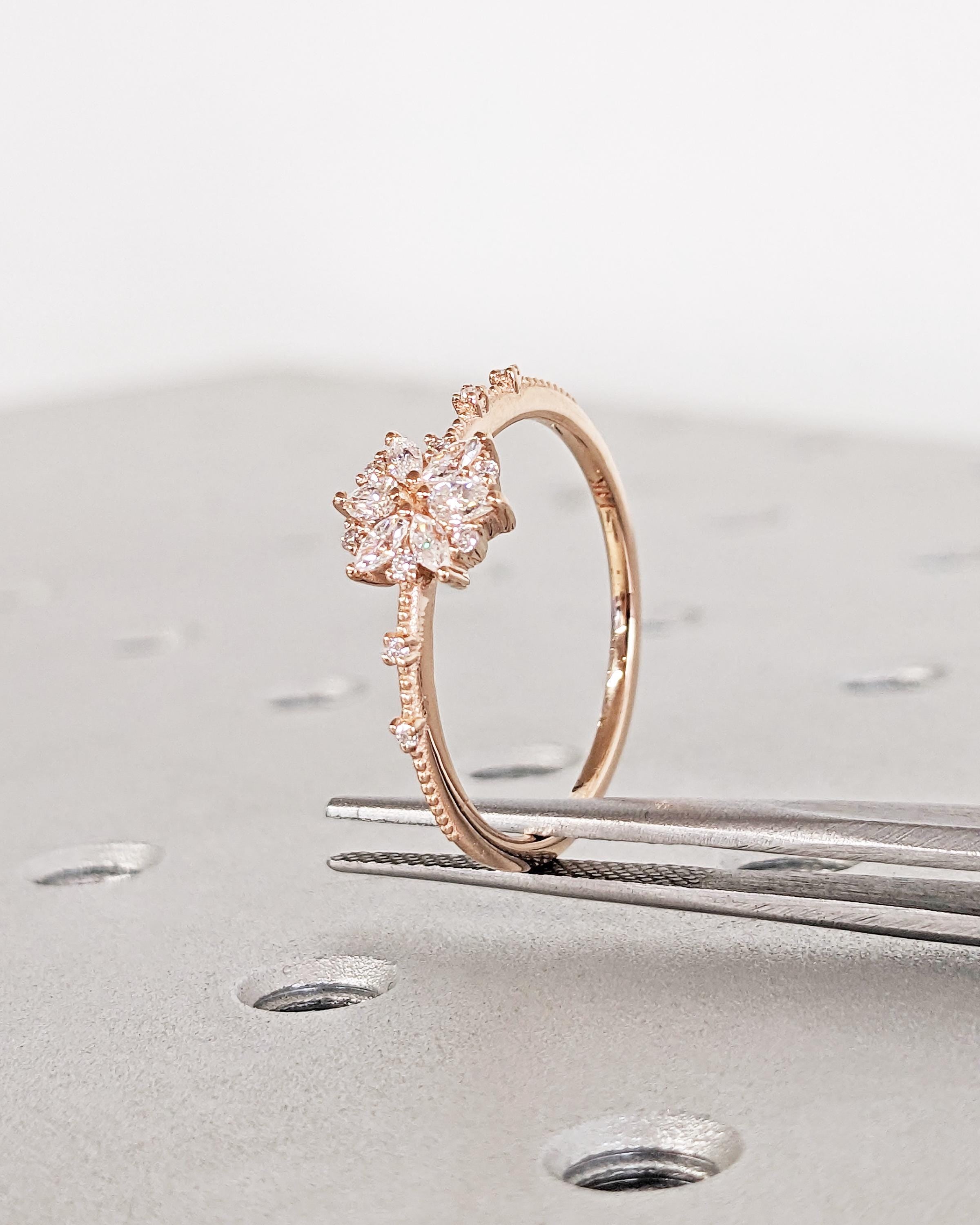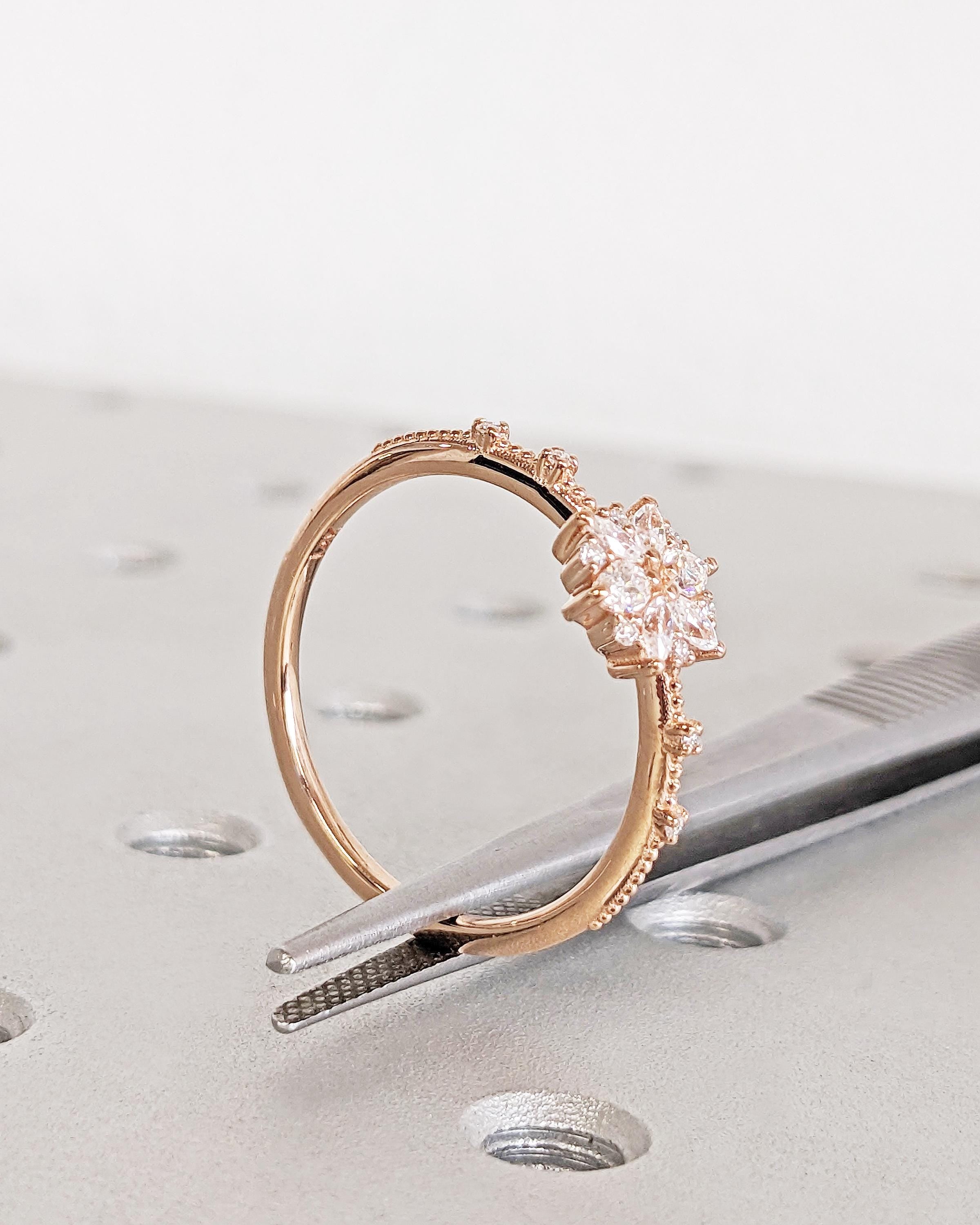 Embrace the essence of nature with this breathtaking floral-inspired ring. The center arrangement of marquise, pear, and round-cut stones creates a blooming flower, symbolizing love in full flourish. Small round stones gracefully accent the dainty band like dewdrops on delicate petals, enhancing the organic charm of this nature-inspired design. Reminiscent of spring’s sweet air and wild beauty, this ring captures the essence of harmony and renewal, making it a dreamy and romantic choice for those who adore floral elegance in their jewelry.