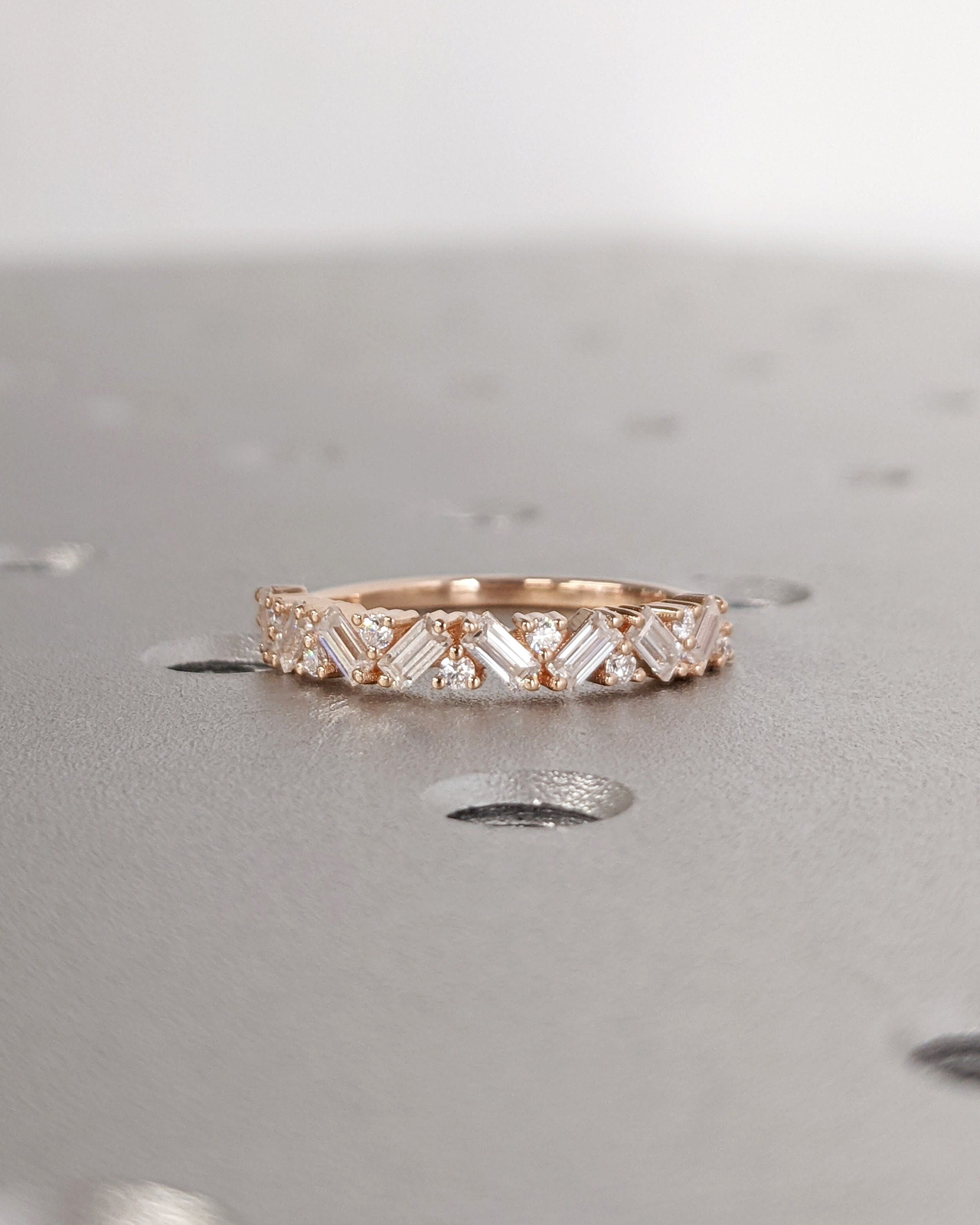 14k Rose Gold Stacking Ring, Diamond Wedding Band, Half Eternity Baguette Ring, Moissanite Matching Rings for Women, Baguette Wedding Band