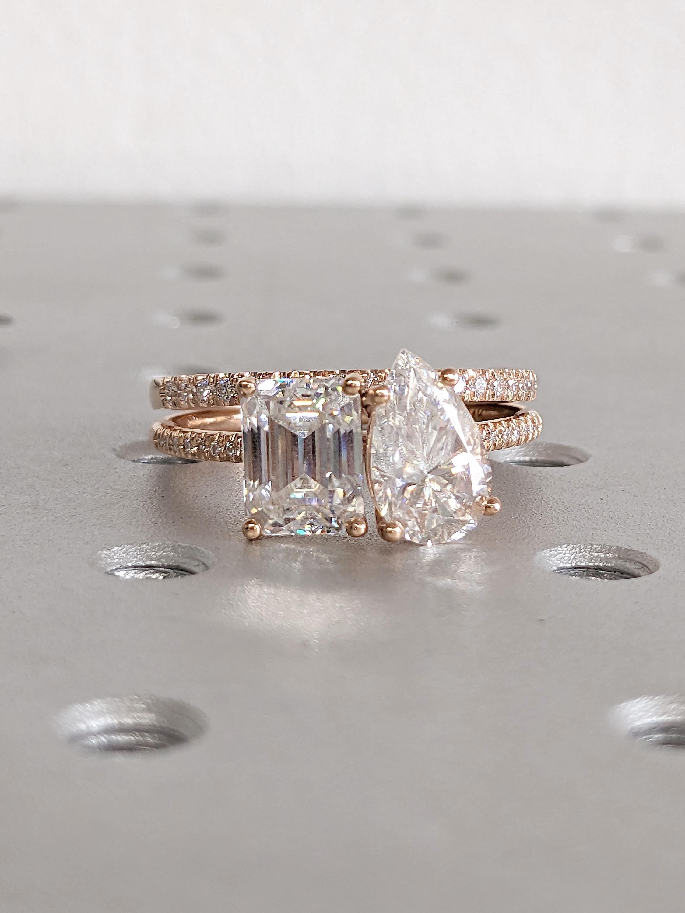 This modern Toi et Moi ring pairs two sparkling Lab Diamonds, an elegant emerald-cut stone and a romantic pear-cut stone, symbolizing two souls coming together as one. Both centers rest on a refined paved half eternity band, adding just the right amount of sparkle without overwhelming the design.