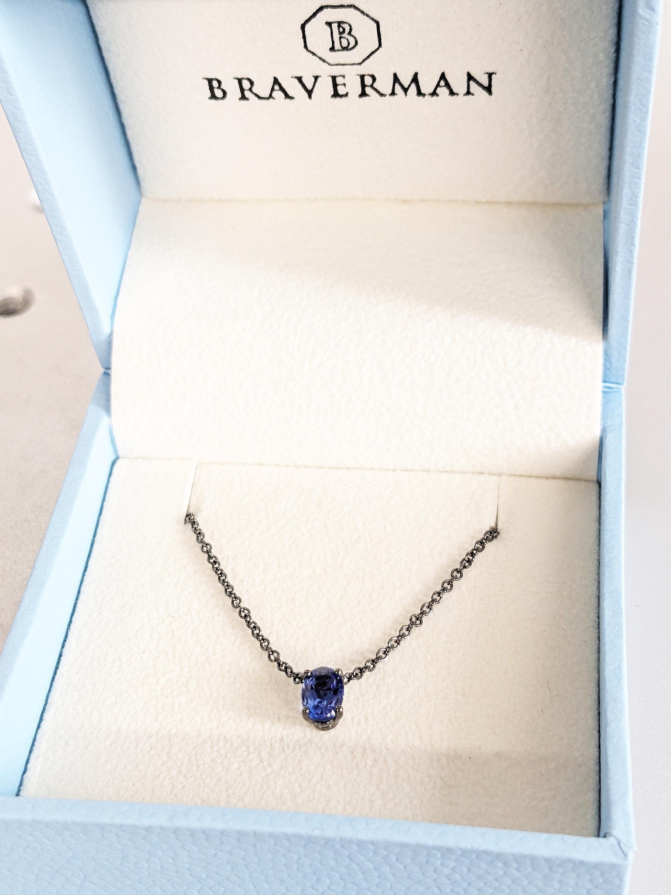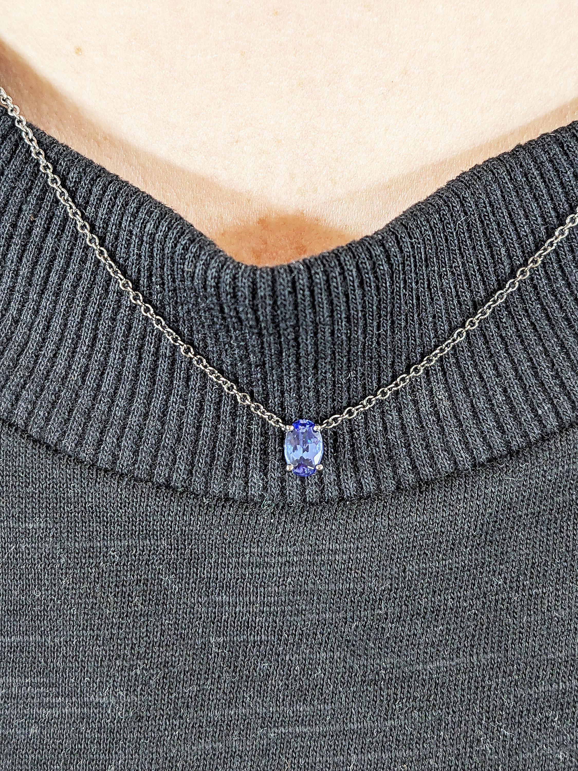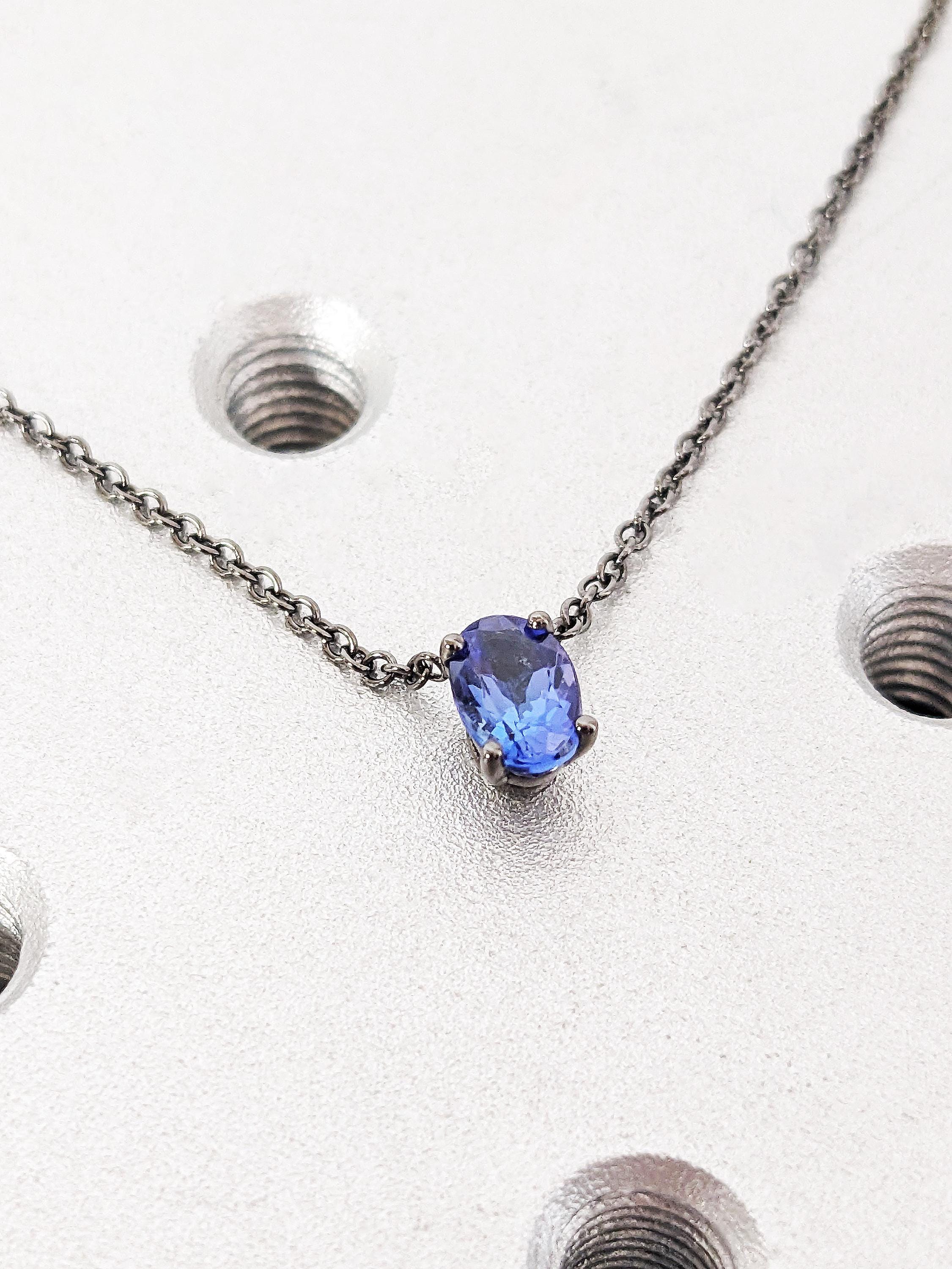 This necklace showcases a stunning oval cut violet blue Tanzanite, radiating a vibrant glow that captures the beauty of the night sky. A meaningful piece of jewelry perfect for weddings, anniversaries or as a thoughtful gift for someone special.