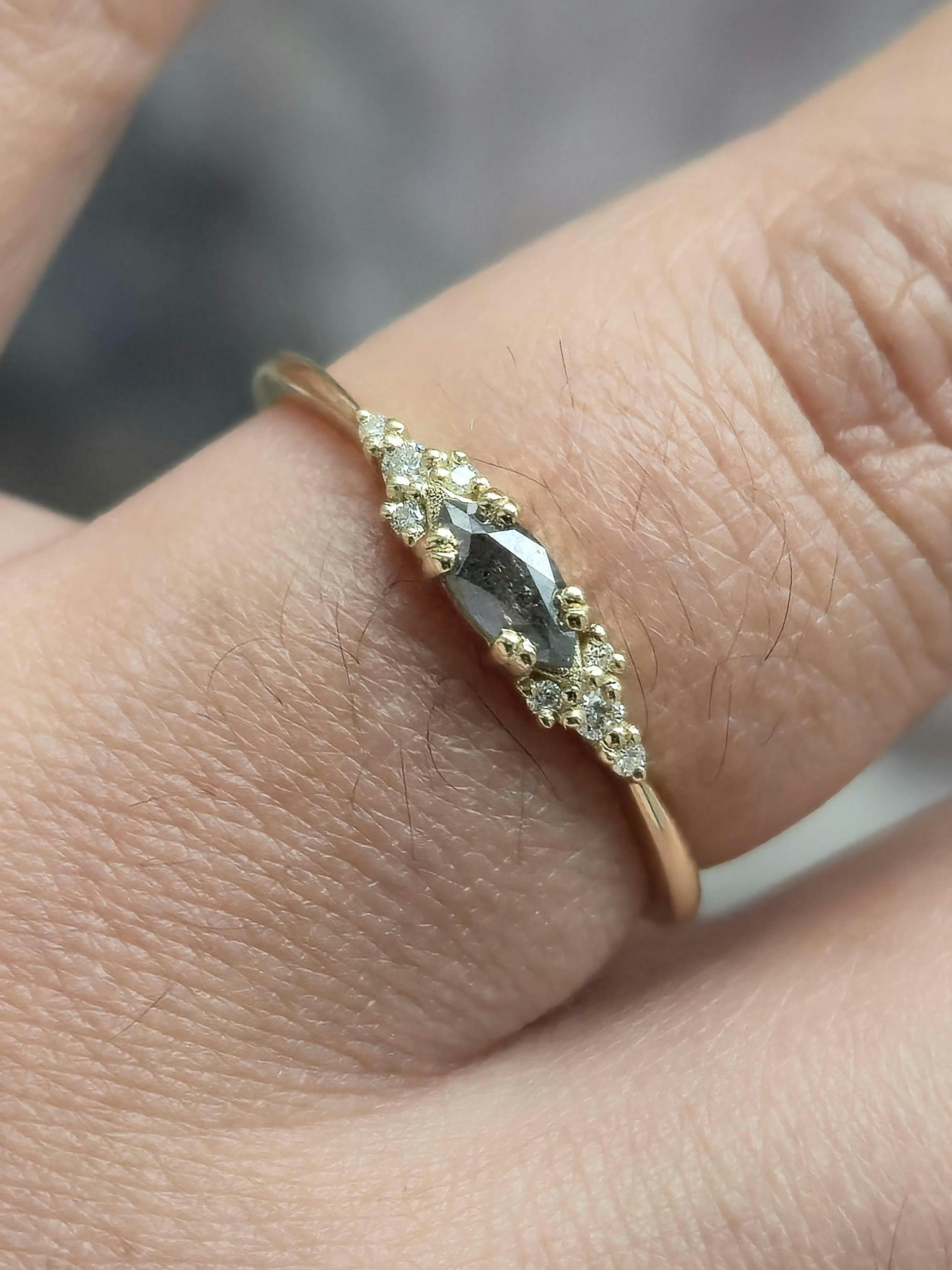 A beautiful pear shaped moissanite, set with a super delicate and thin setting, paved with a row of diamonds from both sides, a thin band of 1.6mm width, make this ring a true stunner! Can match with a unique Ombre diamond band.