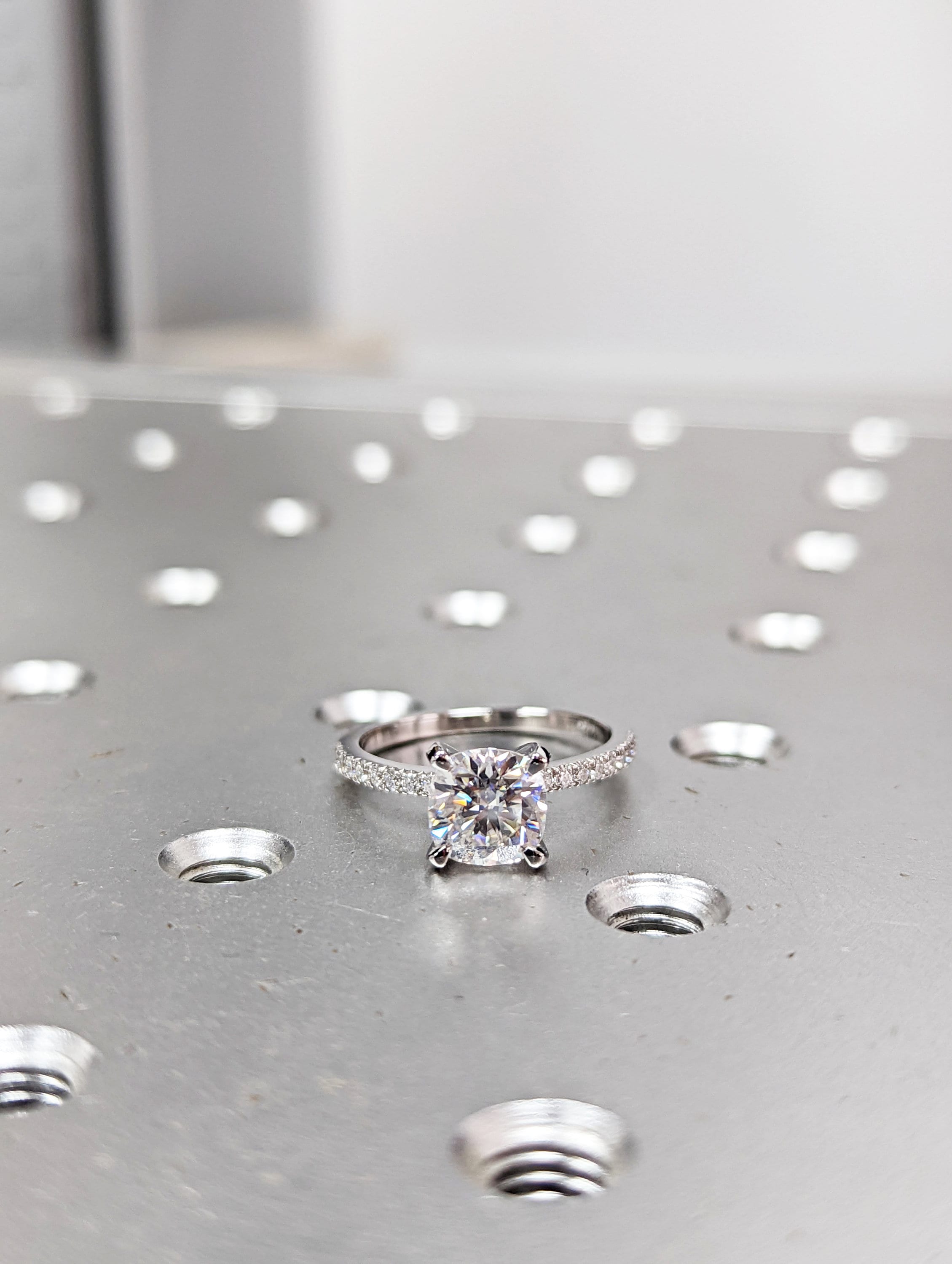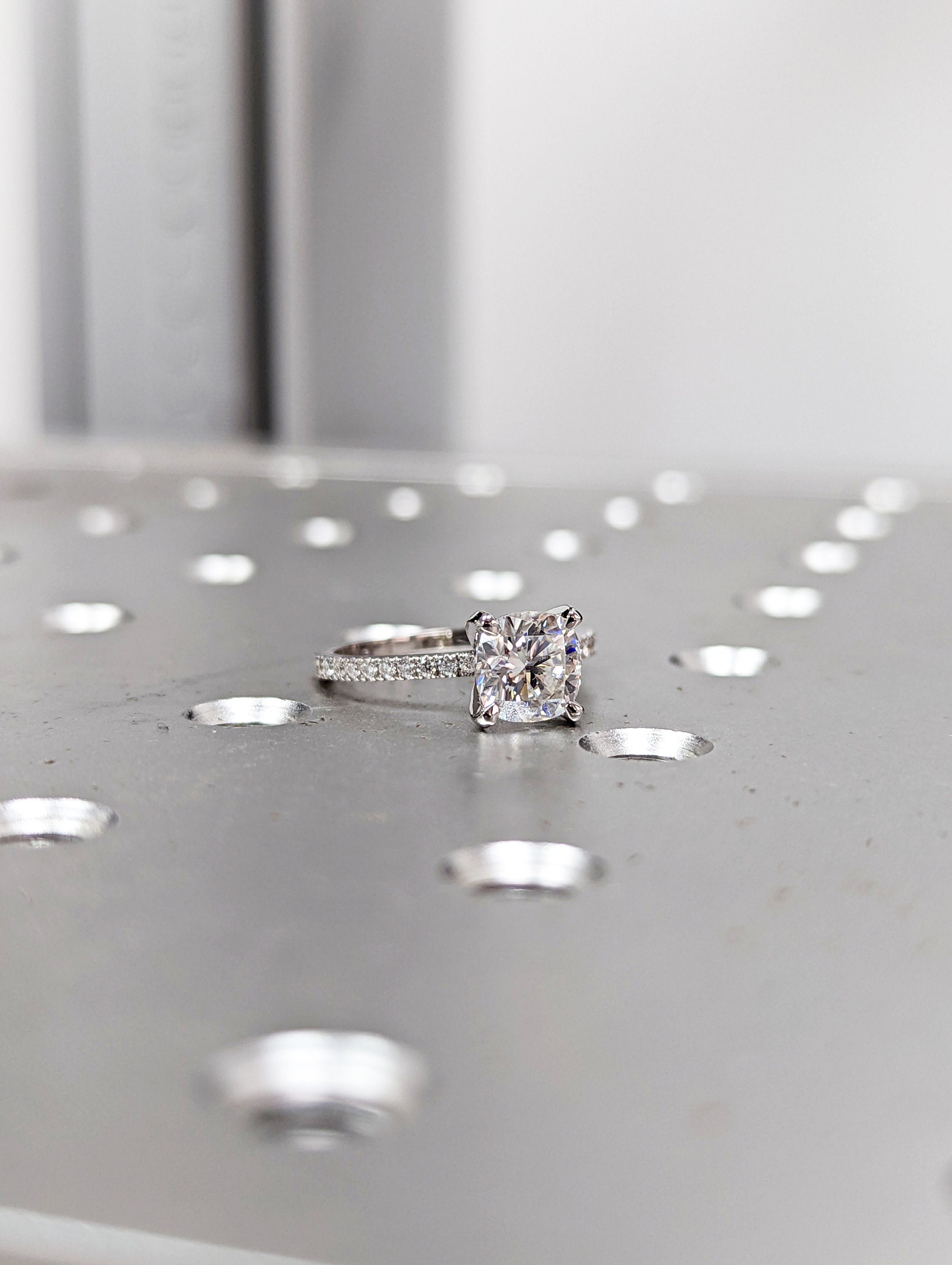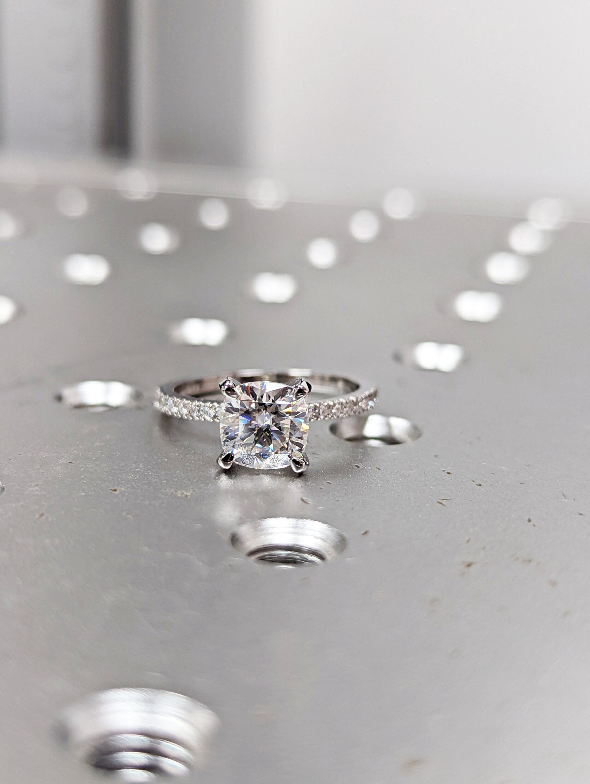 A beautiful cushion shaped moissanite, set with a super delicate and thin setting, paved with a row of diamonds from both sides, a thin band of 1.6mm width, make this ring a true stunner!