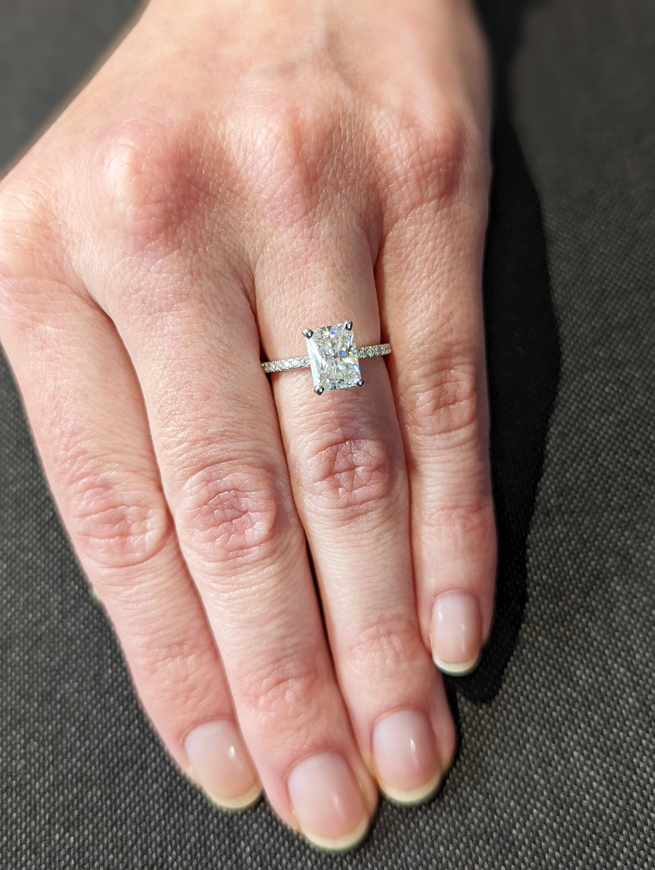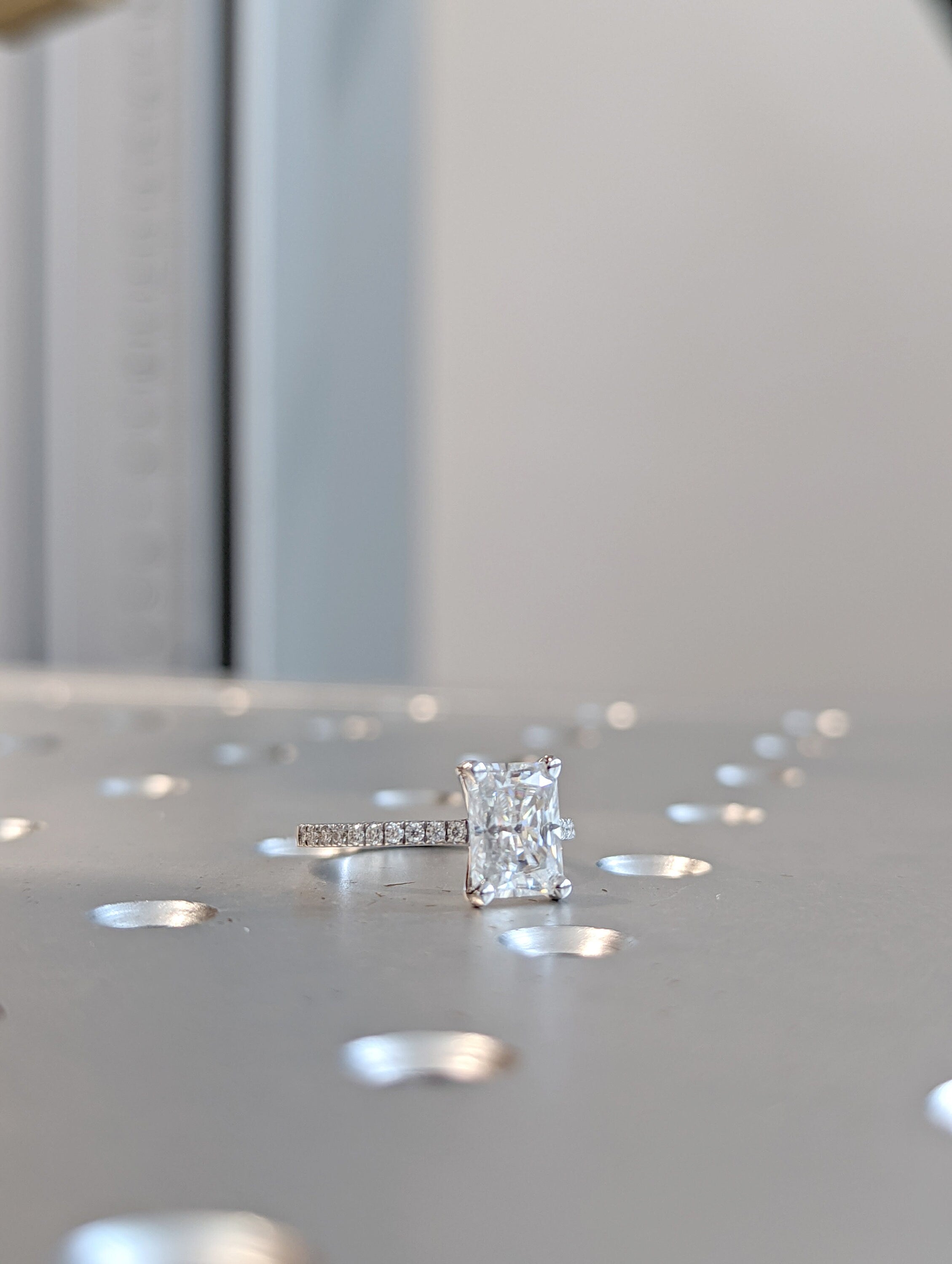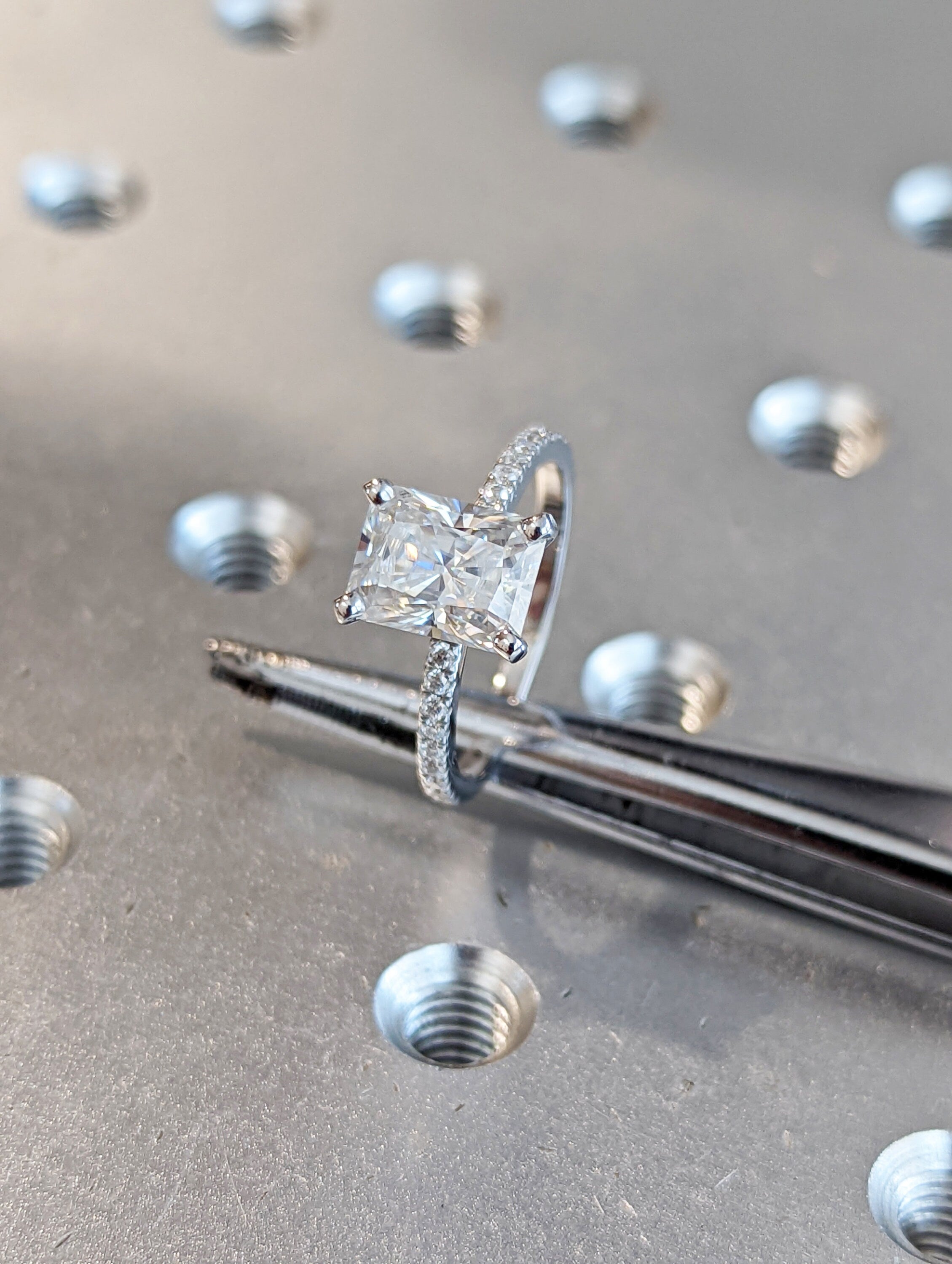 A beautiful radiant shaped moissanite, set with a super delicate and thin setting, paved with a row of diamonds from both sides, a thin band of 1.6mm width, make this ring a true stunner!