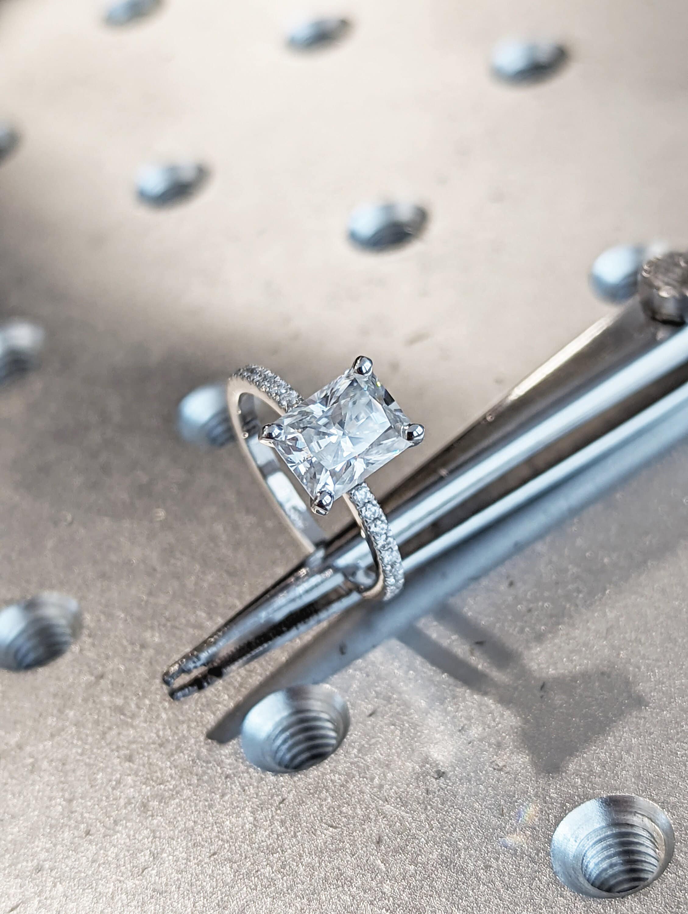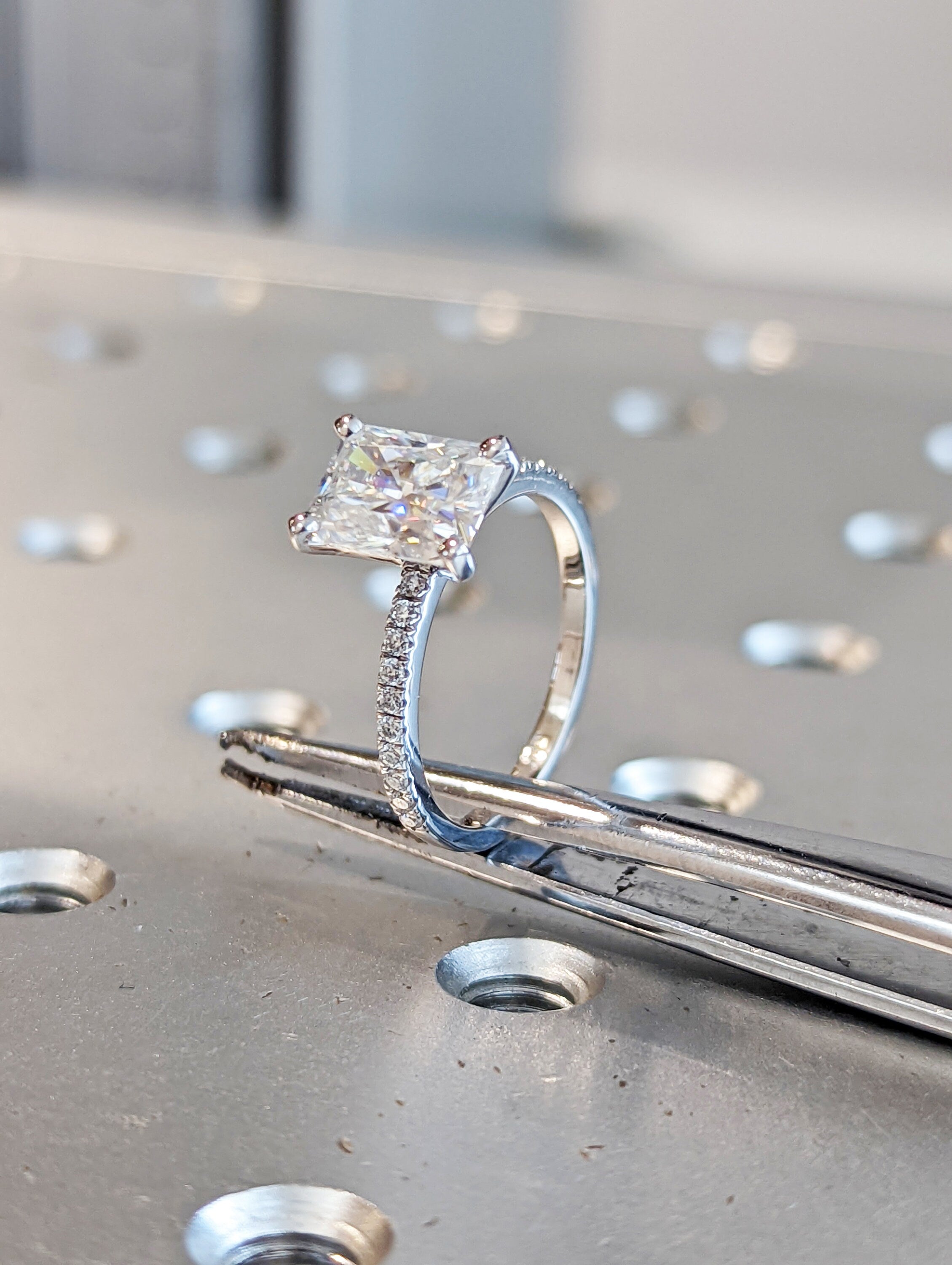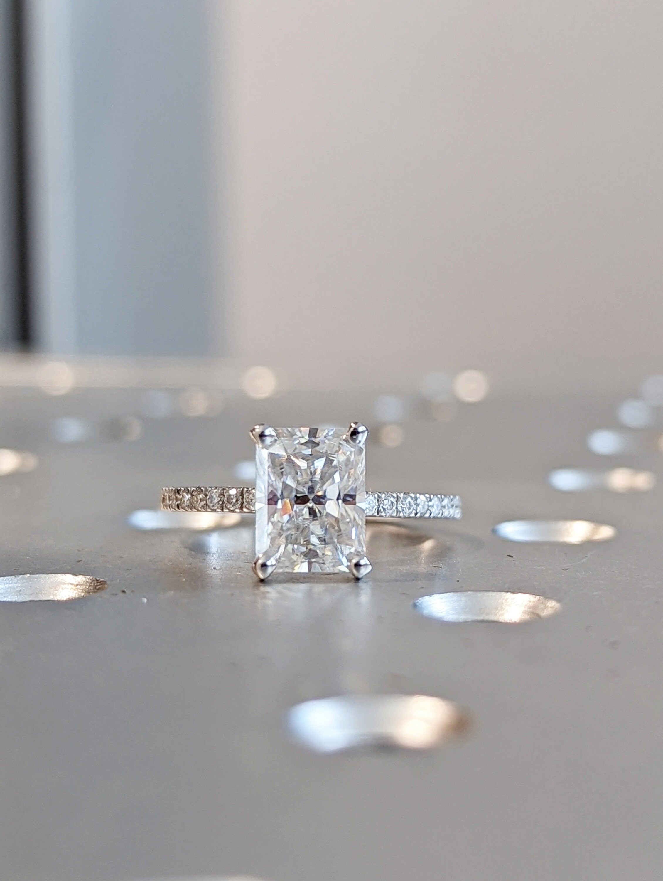 A beautiful radiant shaped moissanite, set with a super delicate and thin setting, paved with a row of diamonds from both sides, a thin band of 1.6mm width, make this ring a true stunner!