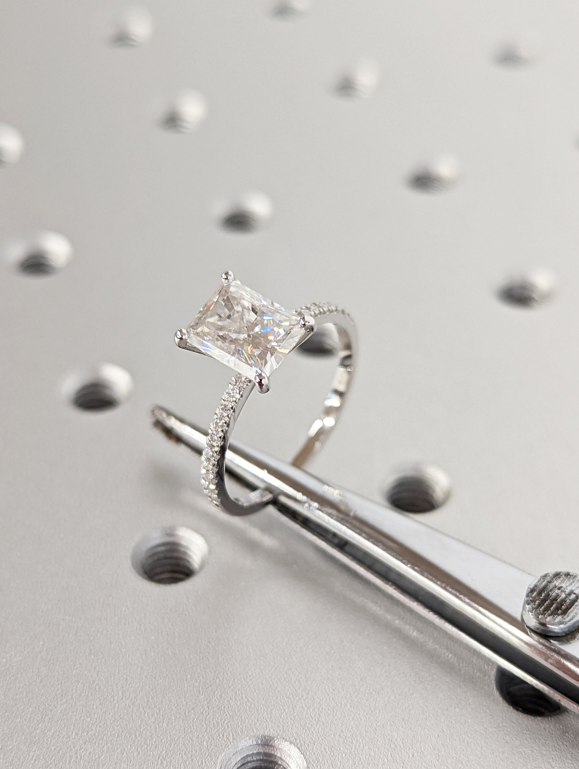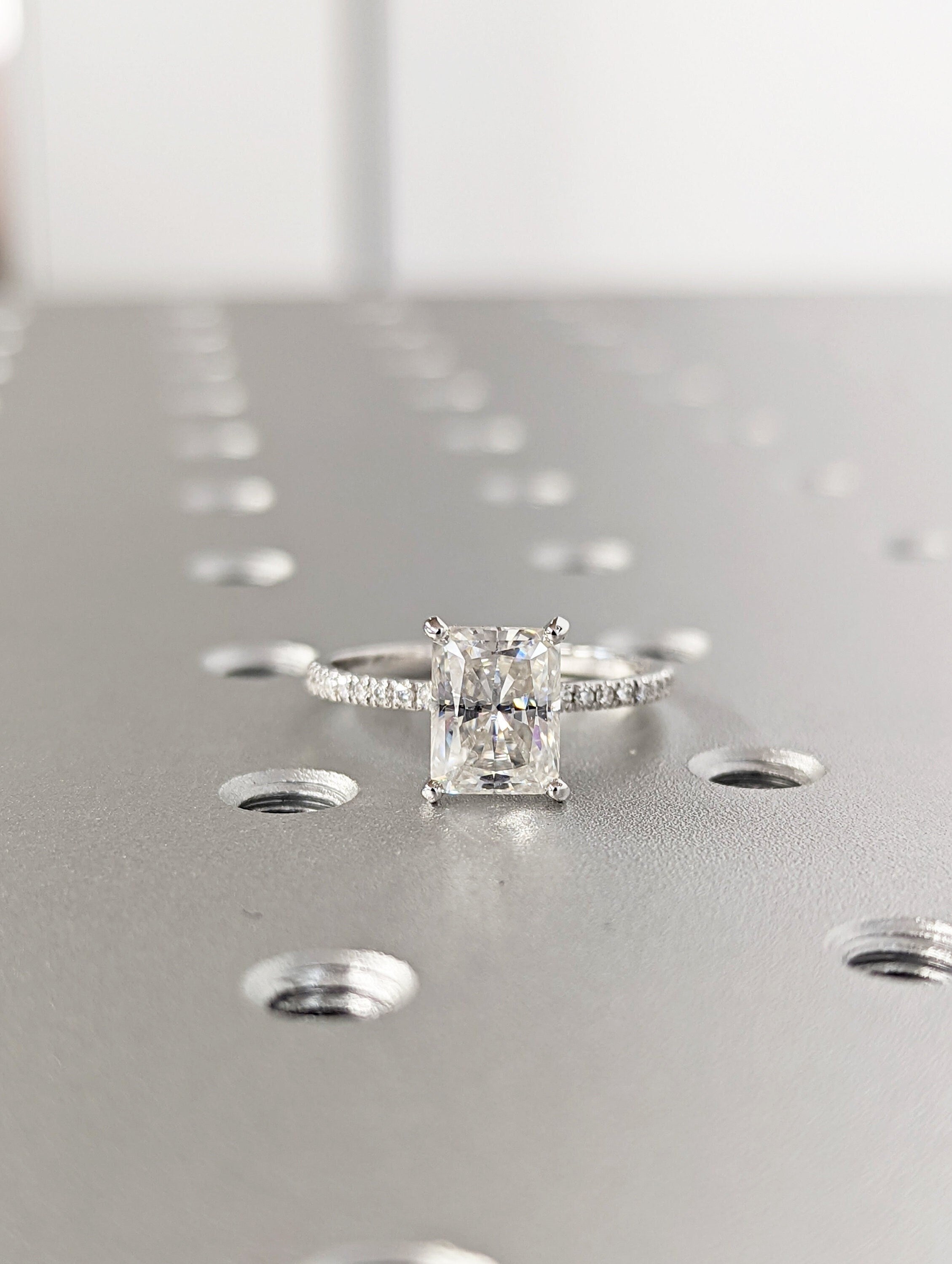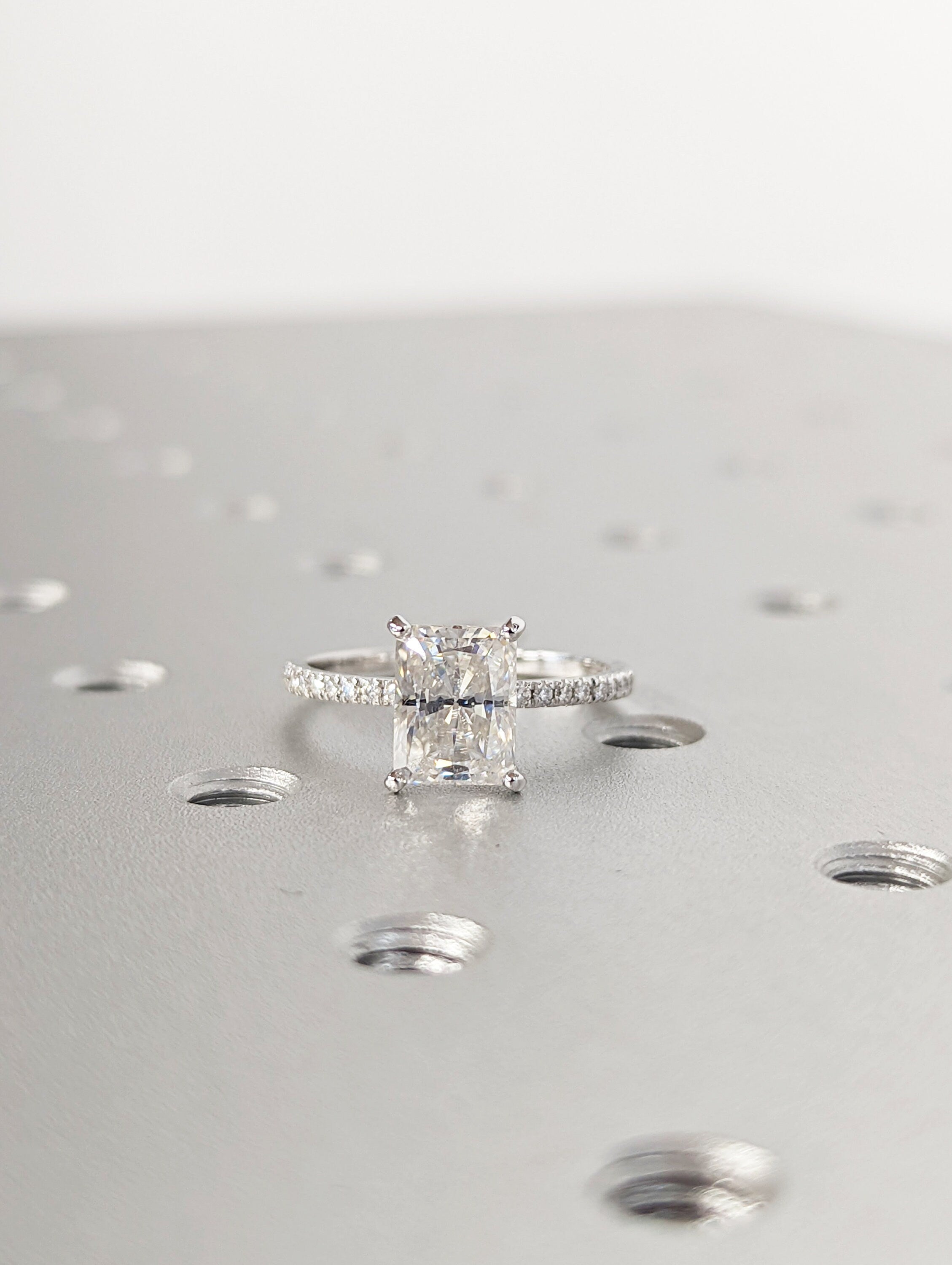 A beautiful radiant shaped moissanite, set with a super delicate and thin setting, paved with a row of moissanites from both sides, a thin band of 1.6mm width, make this ring a true stunner!