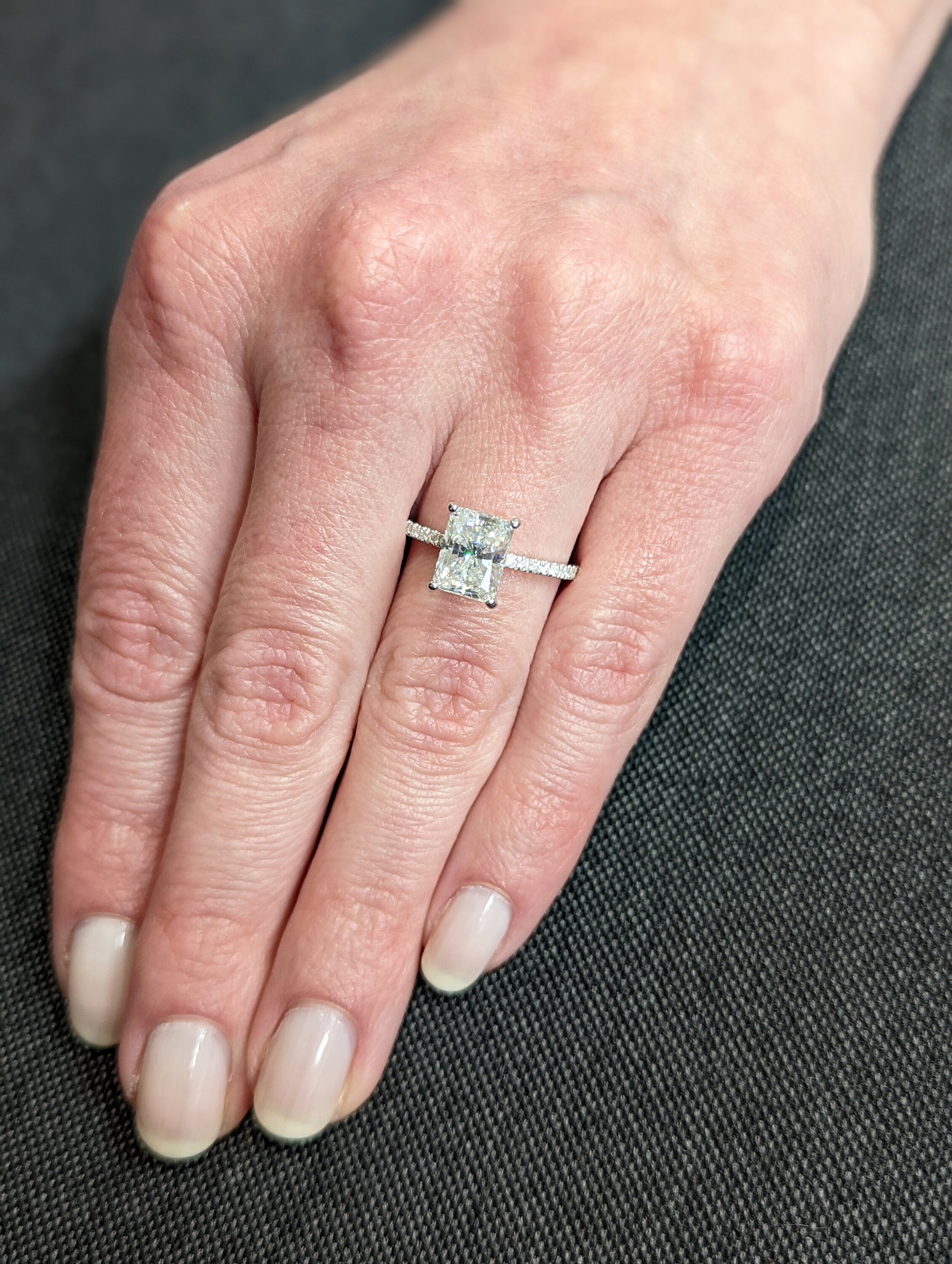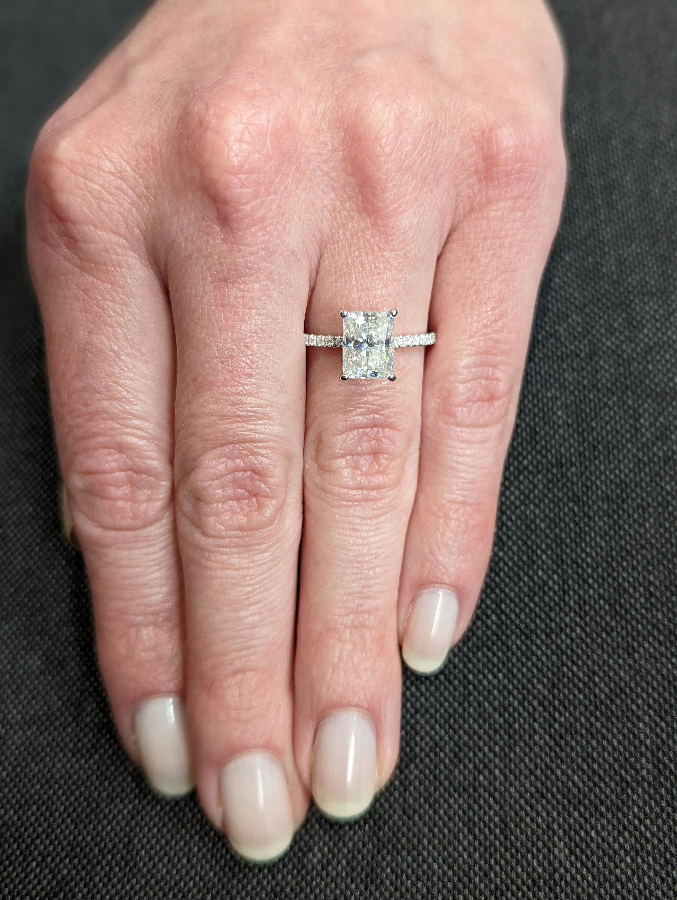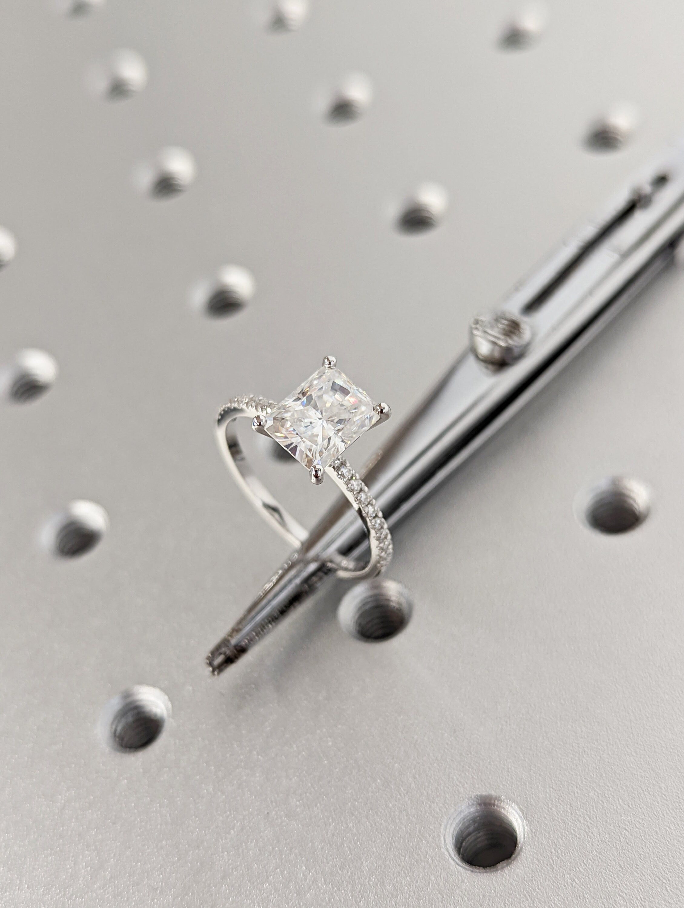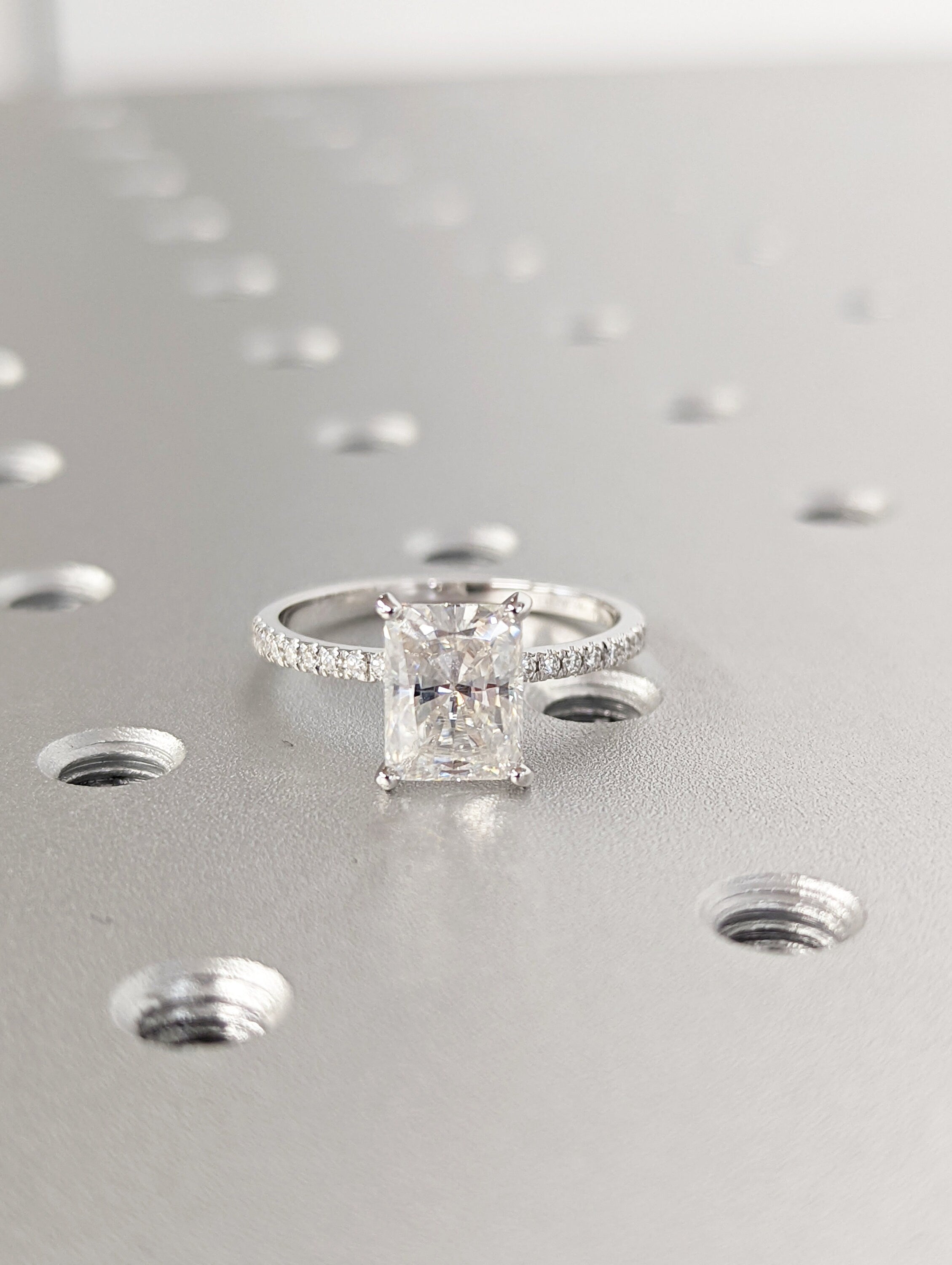 A beautiful radiant shaped moissanite, set with a super delicate and thin setting, paved with a row of moissanites from both sides, a thin band of 1.6mm width, make this ring a true stunner!