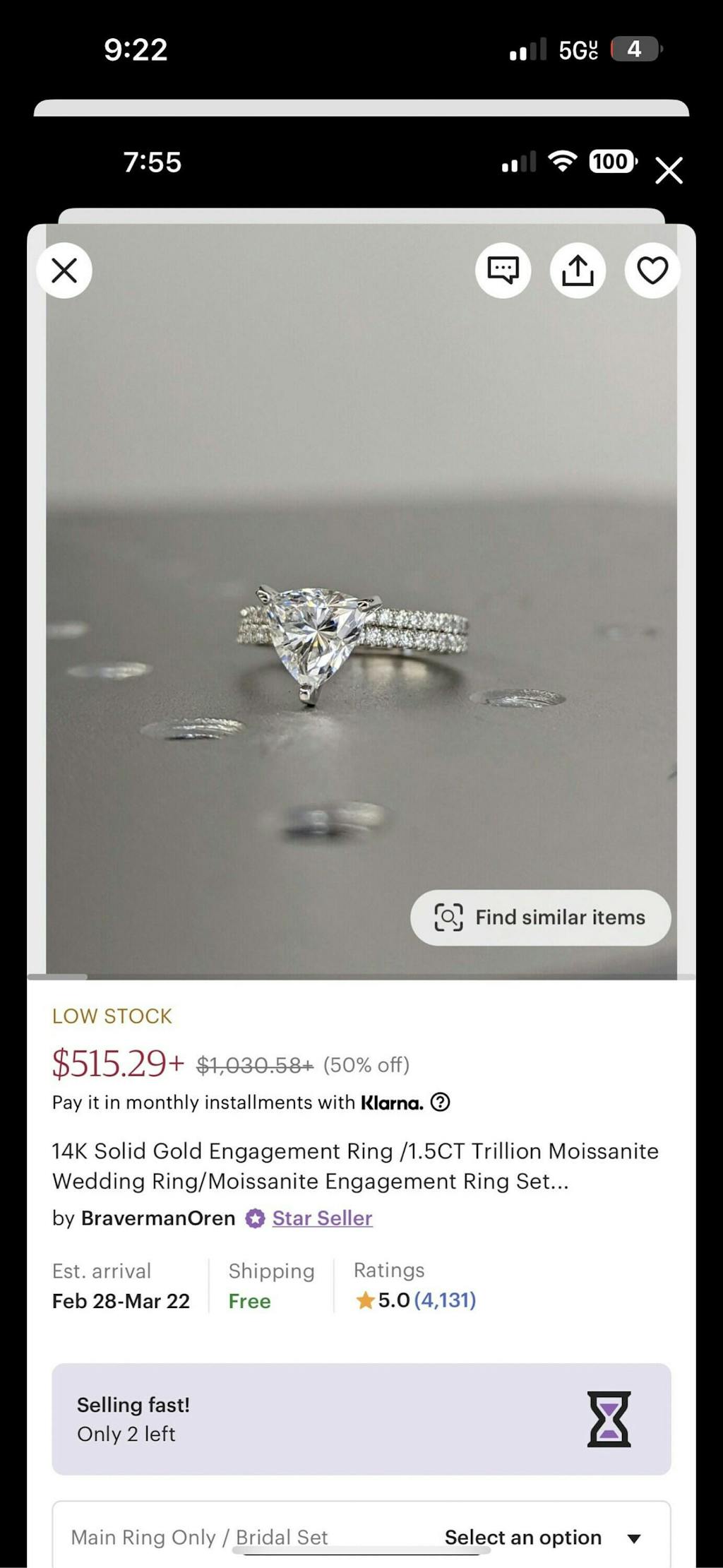 A beautiful trillion shaped moissanite, set with a super delicate and thin setting, paved with a row of moissanites from both sides, a thin band of 1.6mm width, make this ring a true stunner!