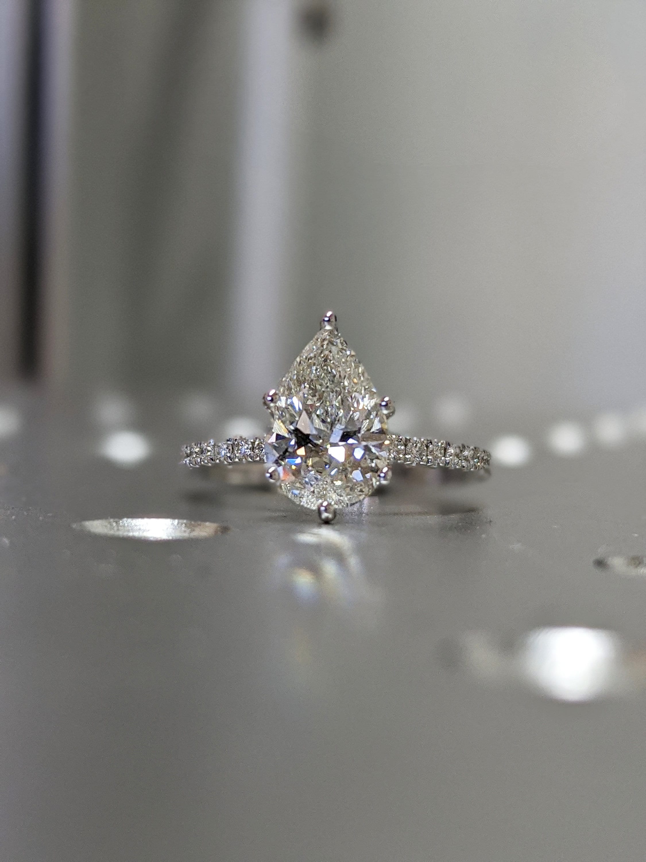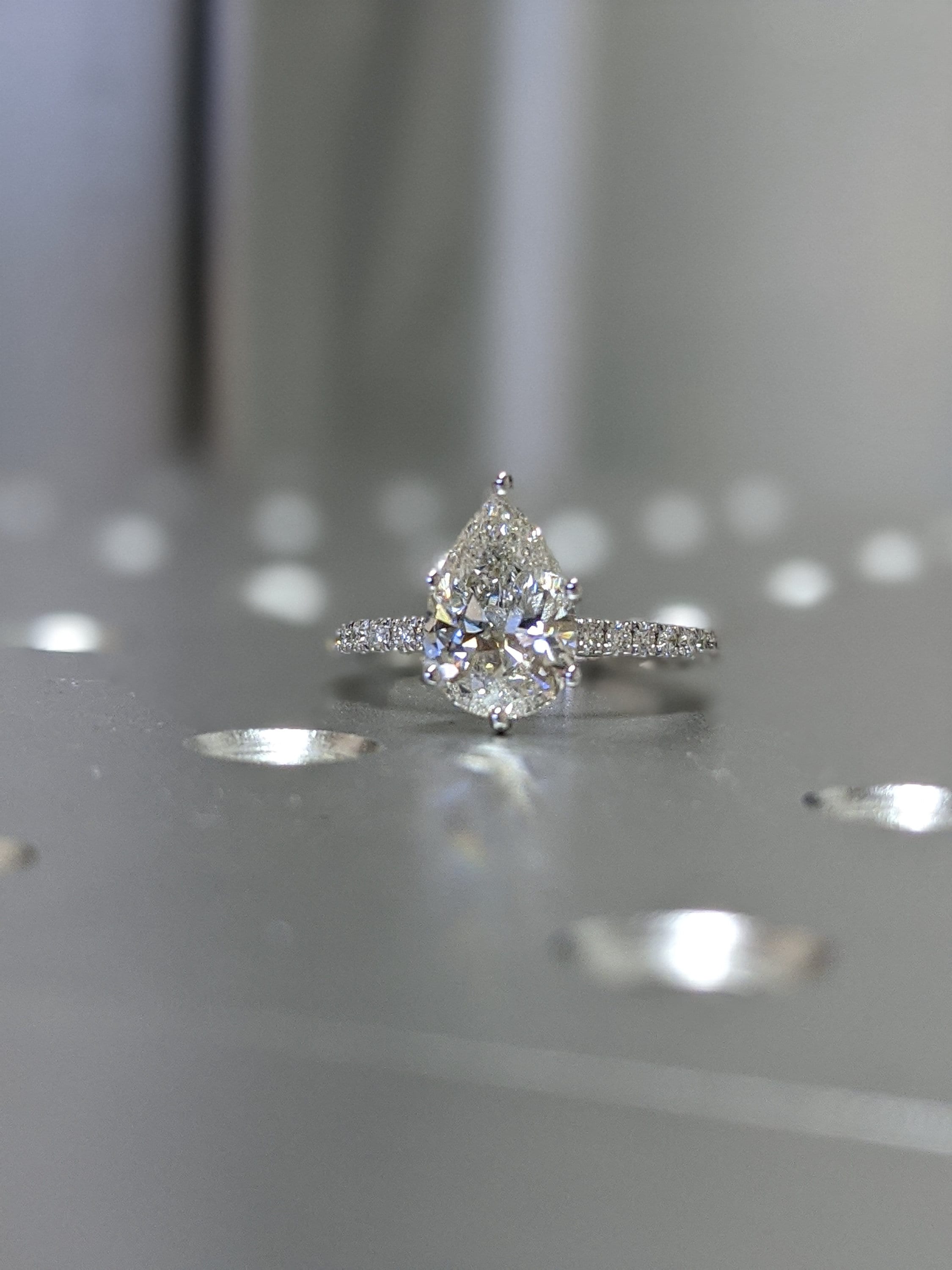 A beautiful pear shaped moissanite, set with a super delicate and thin setting, paved with a row of diamonds from both sides, a thin band of 1.6mm width, make this ring a true stunner!