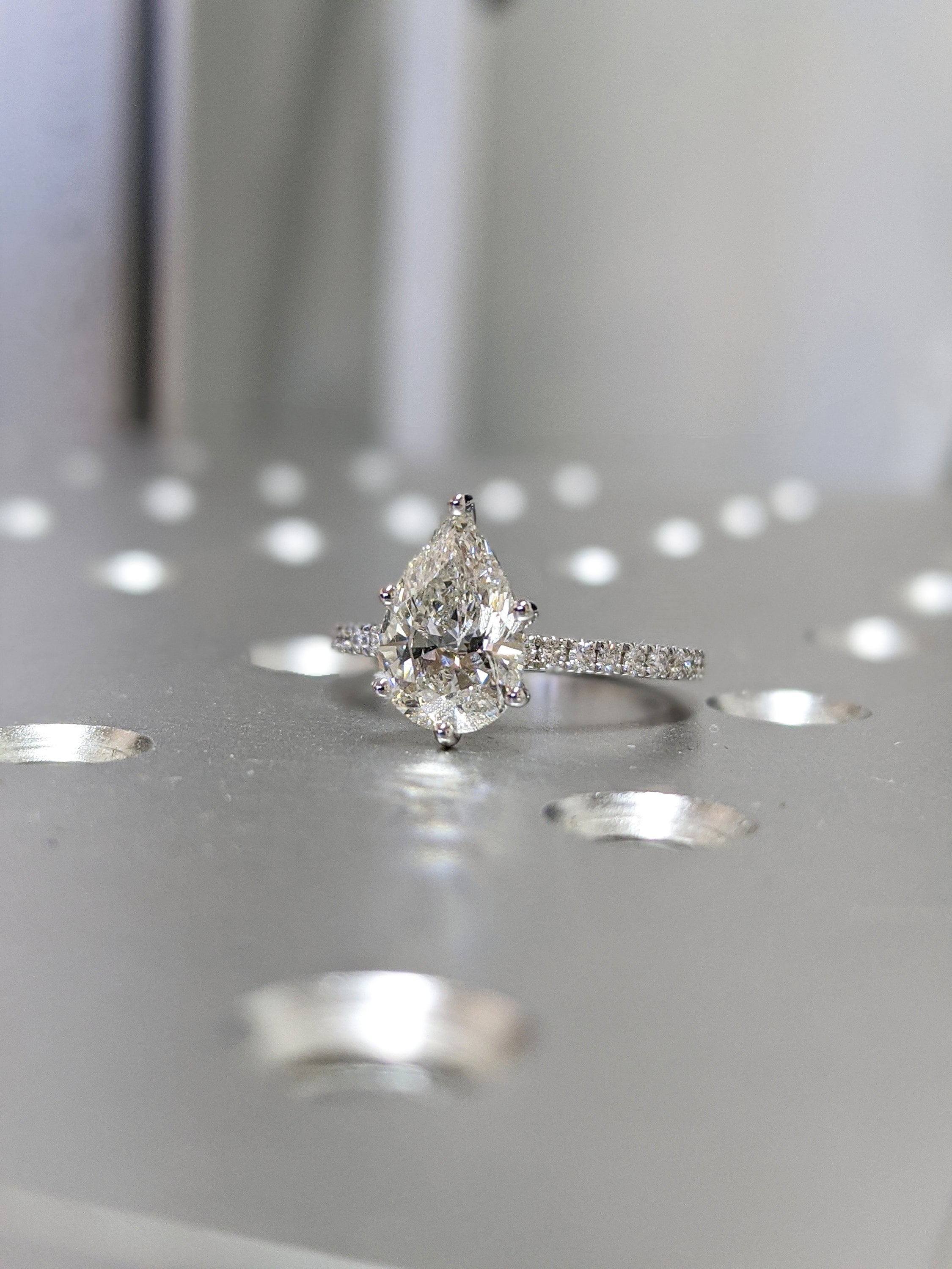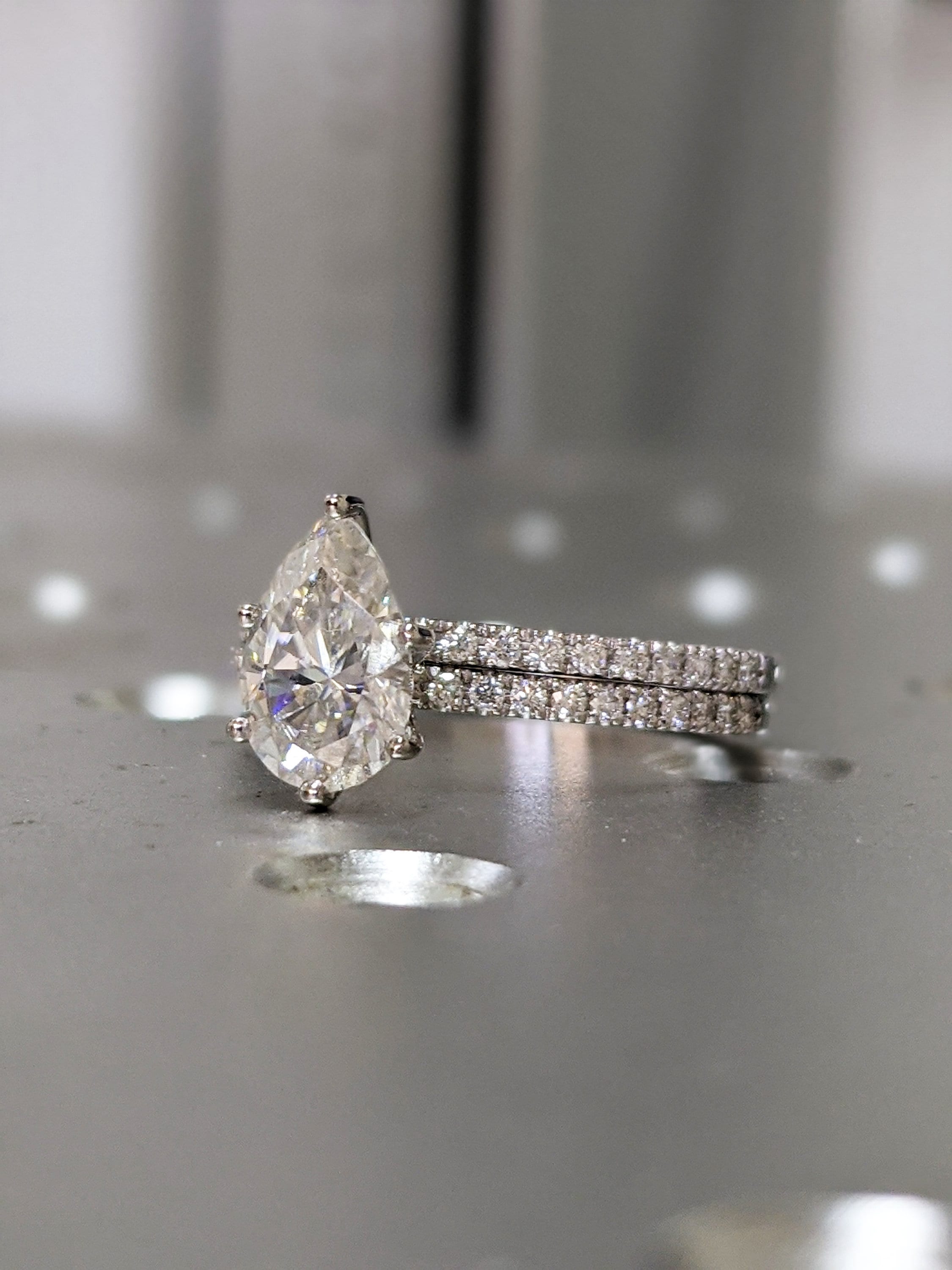 A beautiful pear shaped moissanite, set with a super delicate and thin setting, paved with a row of diamonds from both sides, a thin band of 1.6mm width, make this ring a true stunner!