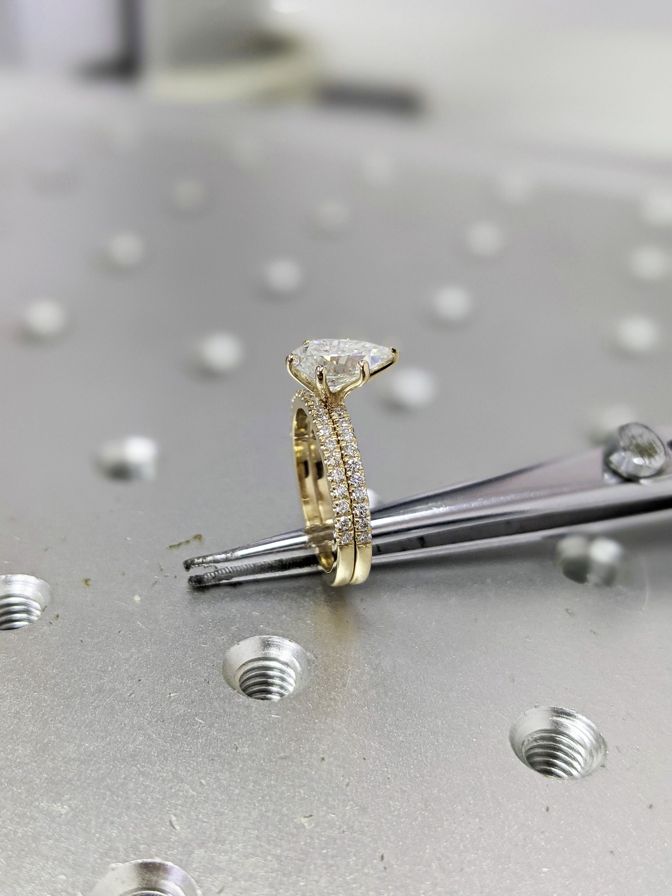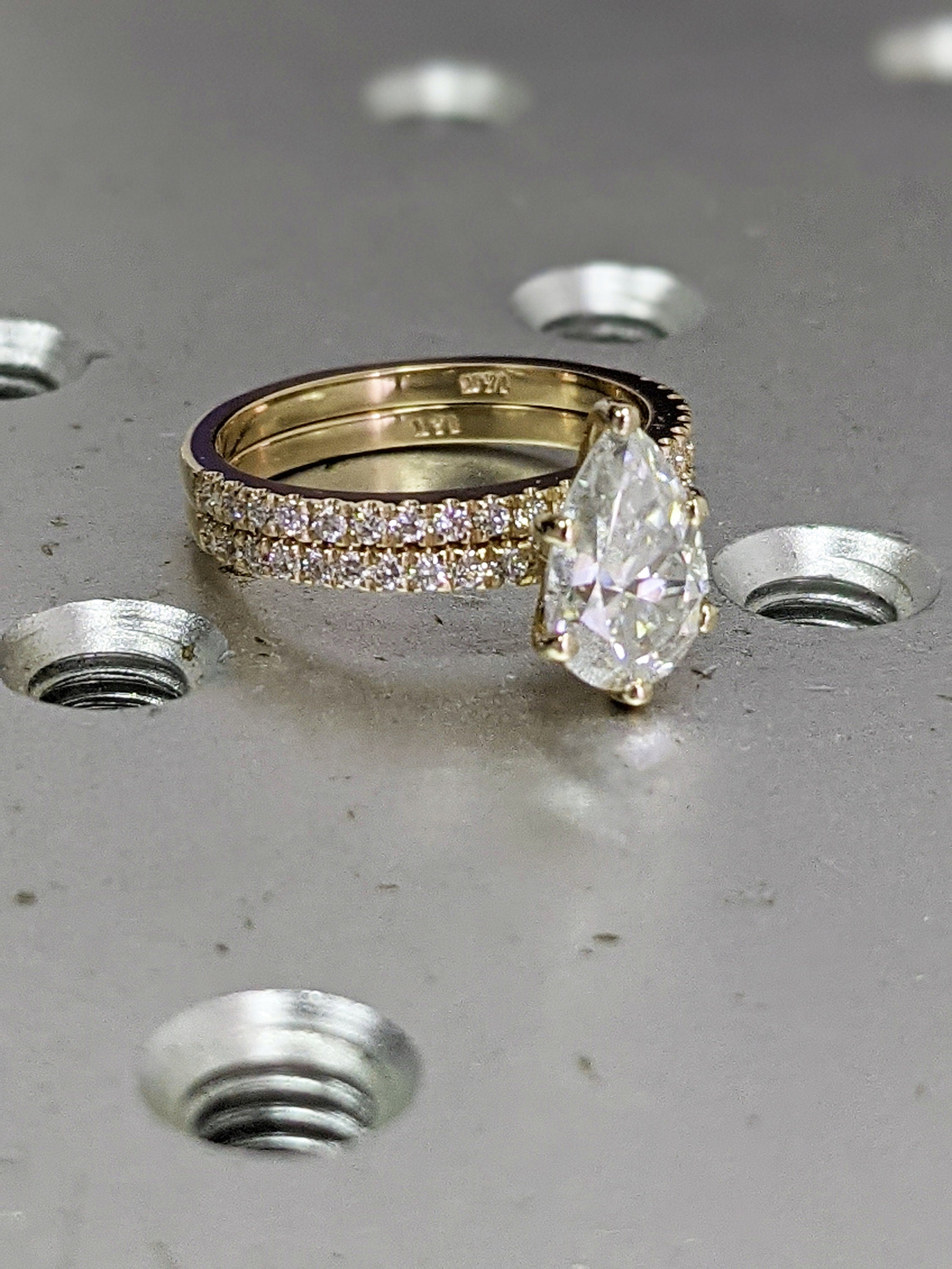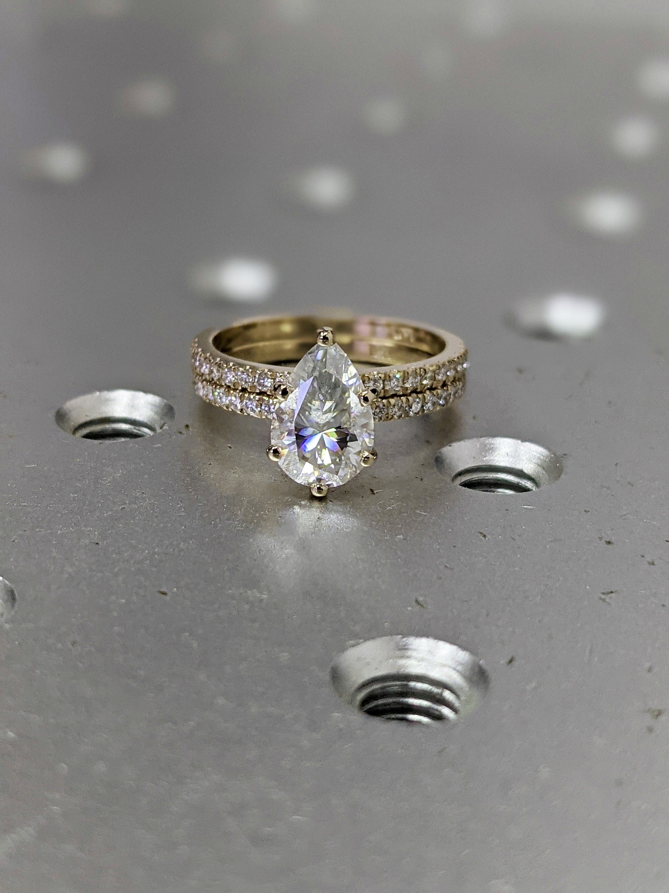 A beautiful pear shaped moissanite, set with a super delicate and thin setting, paved with a row of moissanites from both sides, a thin band of 1.6mm width, make this ring a true stunner!