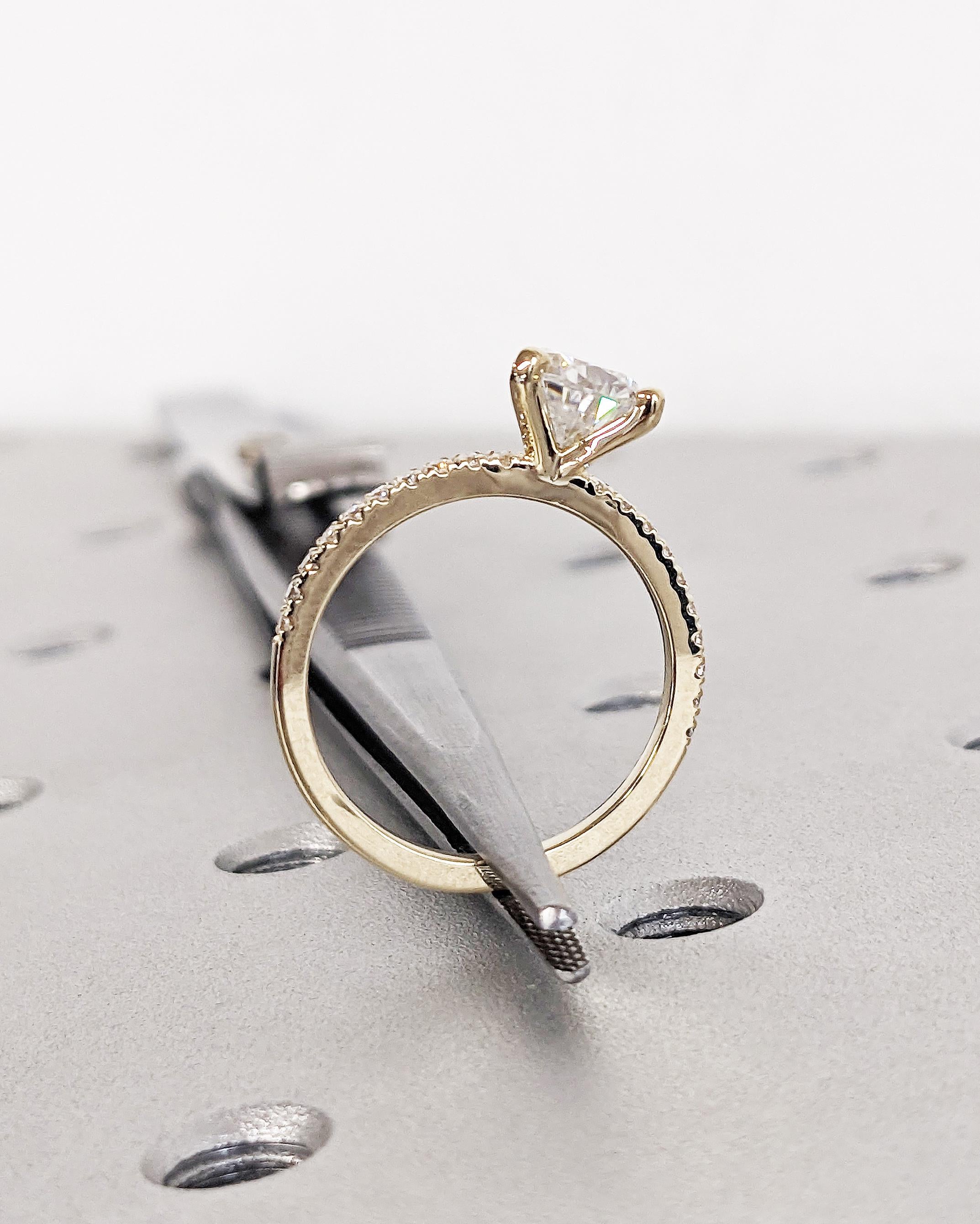 A mesmerizing pear-shaped Moissanite sits atop a dainty 1.6mm band, framed by a row of pavé Moissanites on both sides. The elegant three-prong setting allows the center stone to shine, capturing hearts with its timeless grace and brilliance.