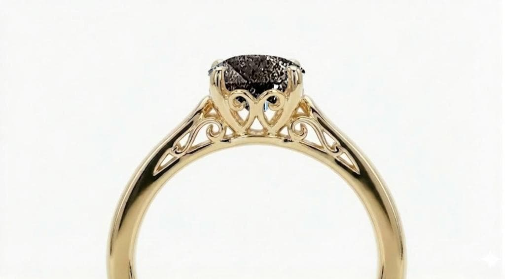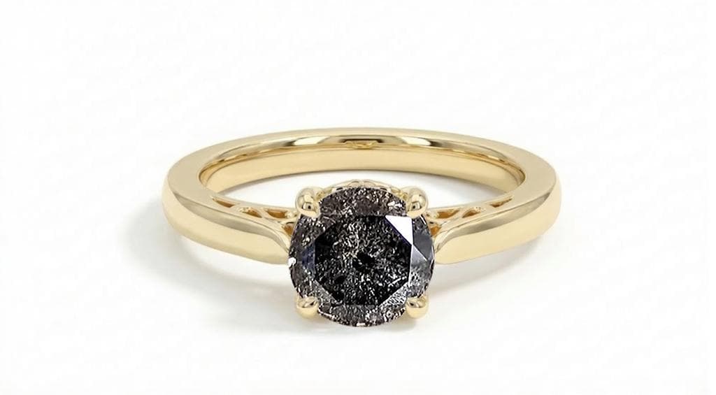 This round salt and pepper diamond engagement ring showcases a unique center stone framed by intricate filigree detailing beneath the setting. The handcrafted scrollwork adds a romantic, vintage-inspired touch that elevates its overall charm. Paired with a slender 1.8mm–2mm gold band, it offers a delicate yet refined look. A perfect choice for anyone who loves understated elegance with a hint of artistic flair.
