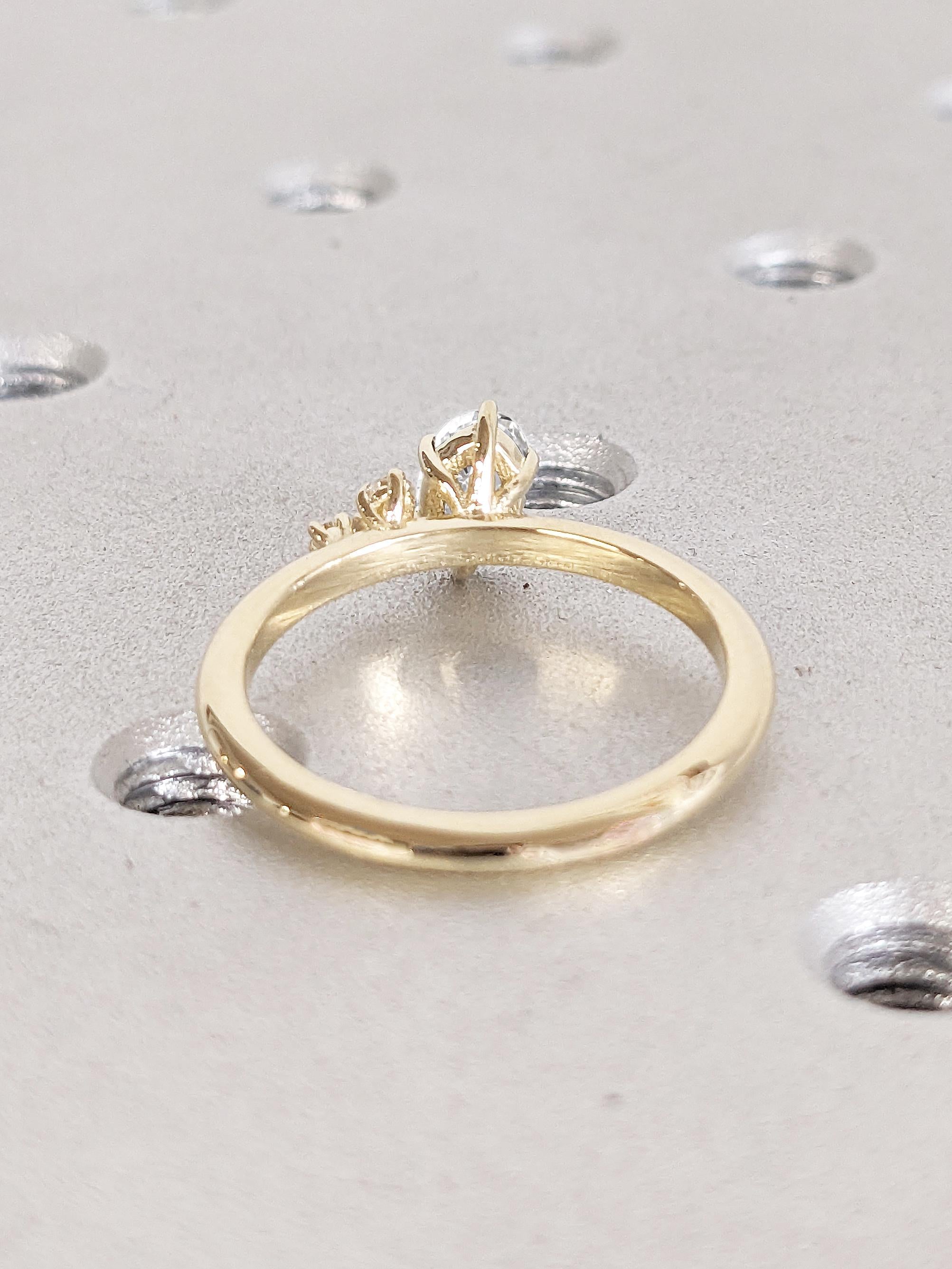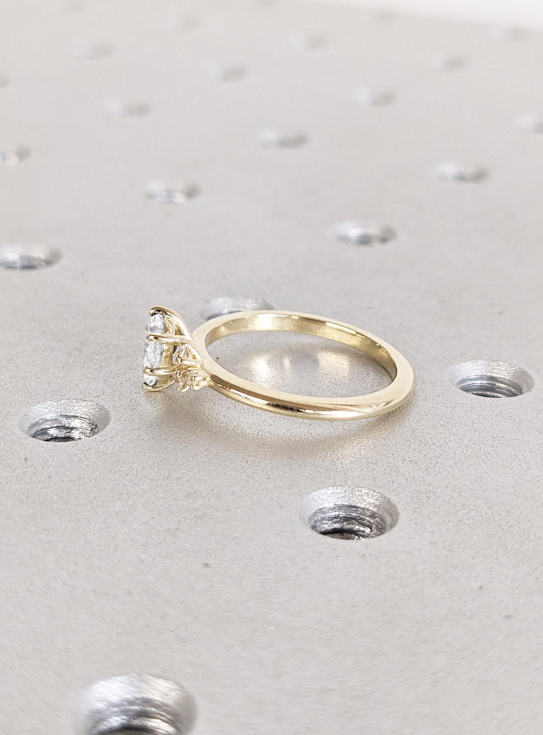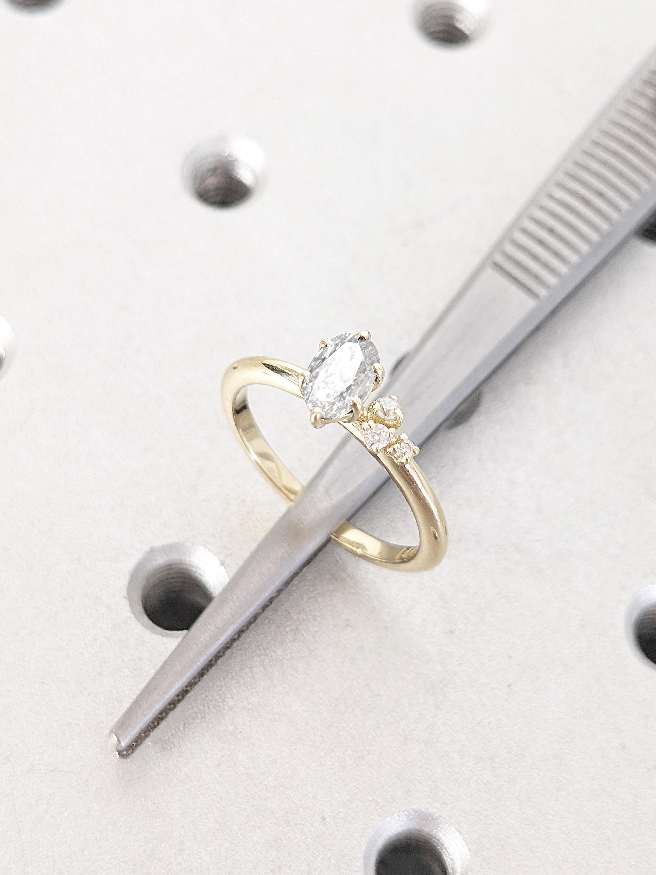 Elegant and enchanting, this ring showcases an oval cut Moissanite in a delicate six-prong setting. The center stone is complemented by a unique cluster of Natural Diamonds, Lab-Grown Diamonds, or Moissanite of your choice, gracefully adorning one side of the band. This exquisite piece is a timeless statement of beauty and a perfect blend of sophistication and individuality.