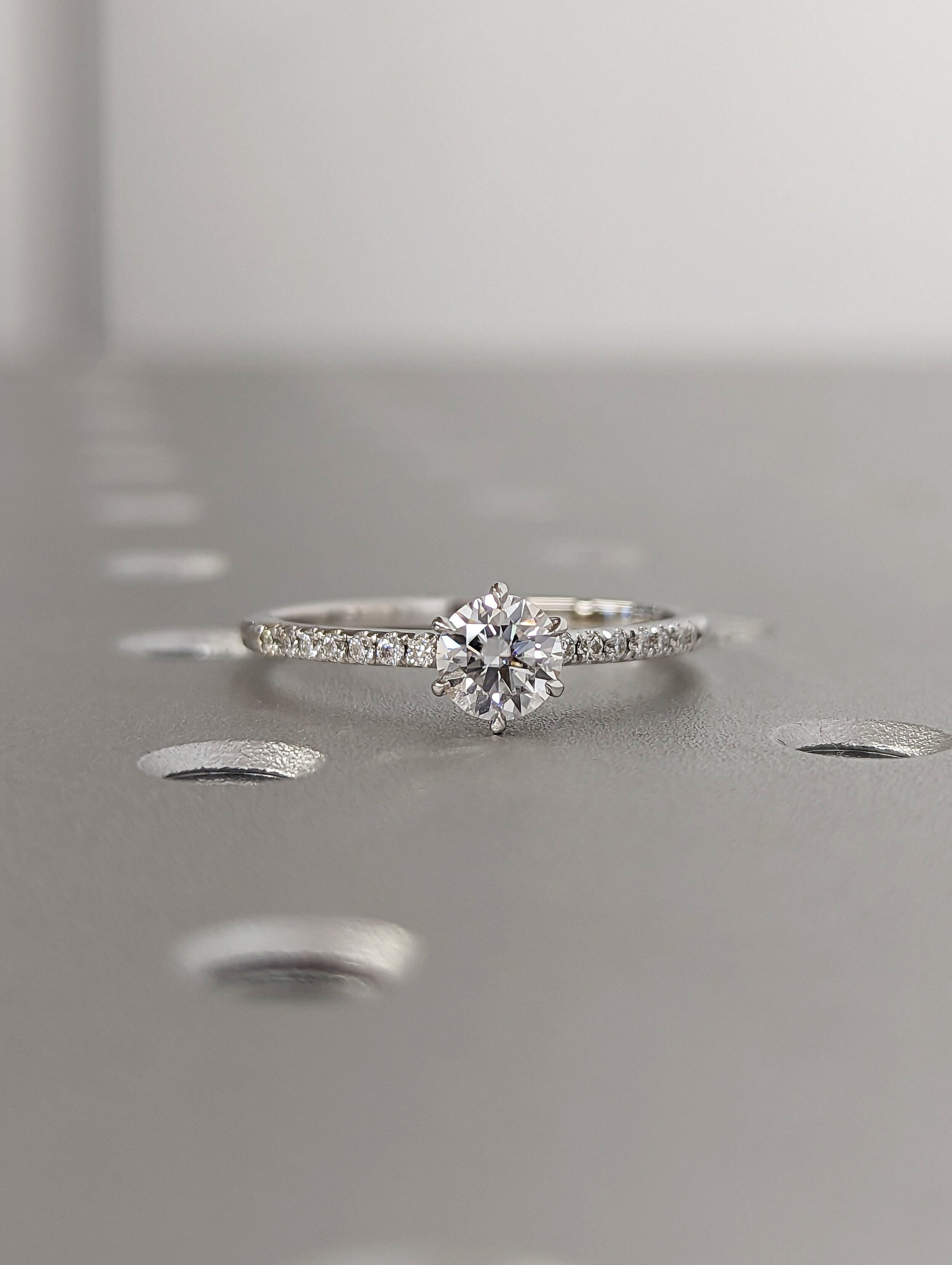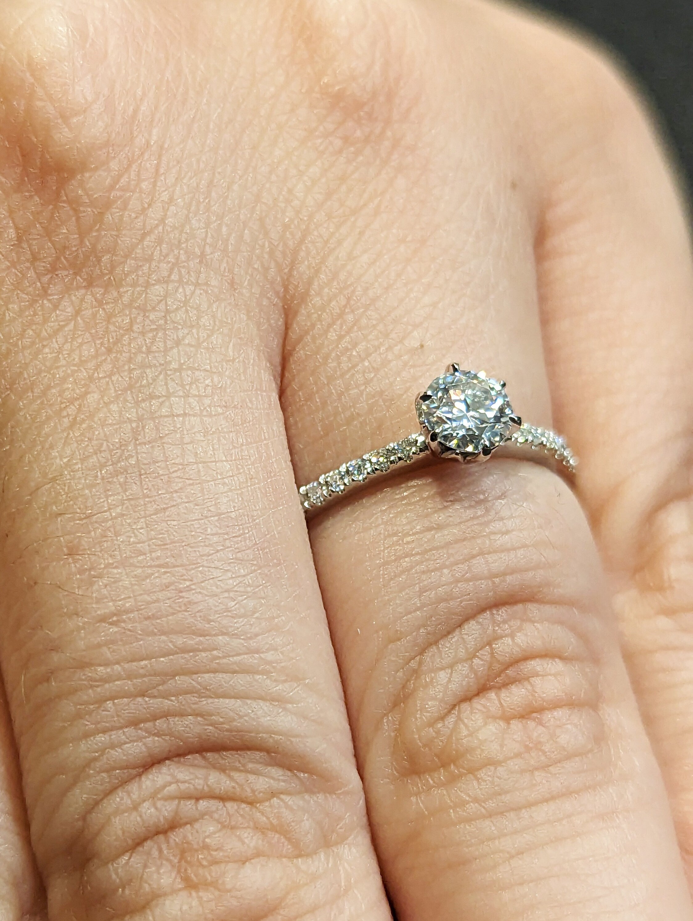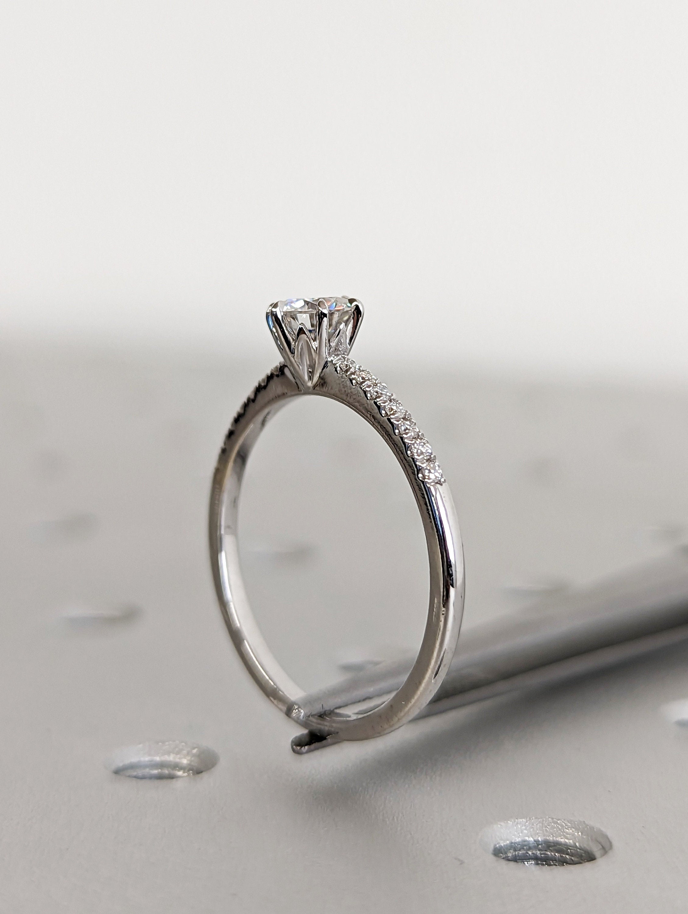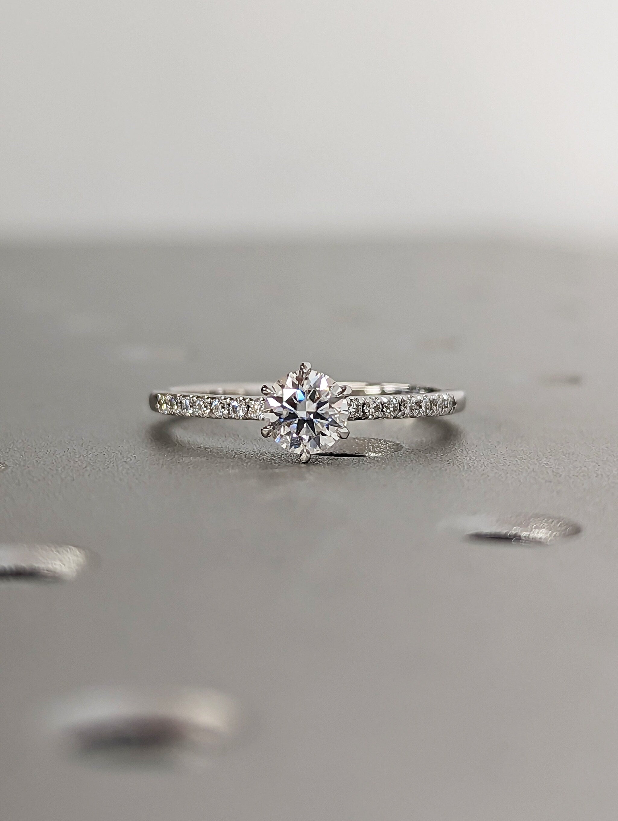 This sophisticated engagement ring features a rose setting center stone, accentuated by a petite scalloped moissanite pave band.
