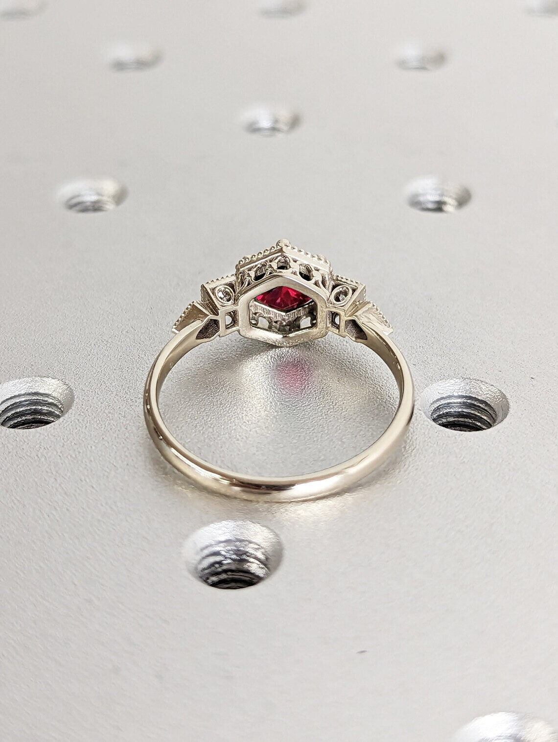 Commemorate your love story with our mesmerizing engagement ring, starring a captivating ruby embraced by a sophisticated hexagonal setting. The fine milgrain detailing exudes a classic charm. Craft your own narrative by selecting either exquisite diamonds or ethereal moissanite side stones.