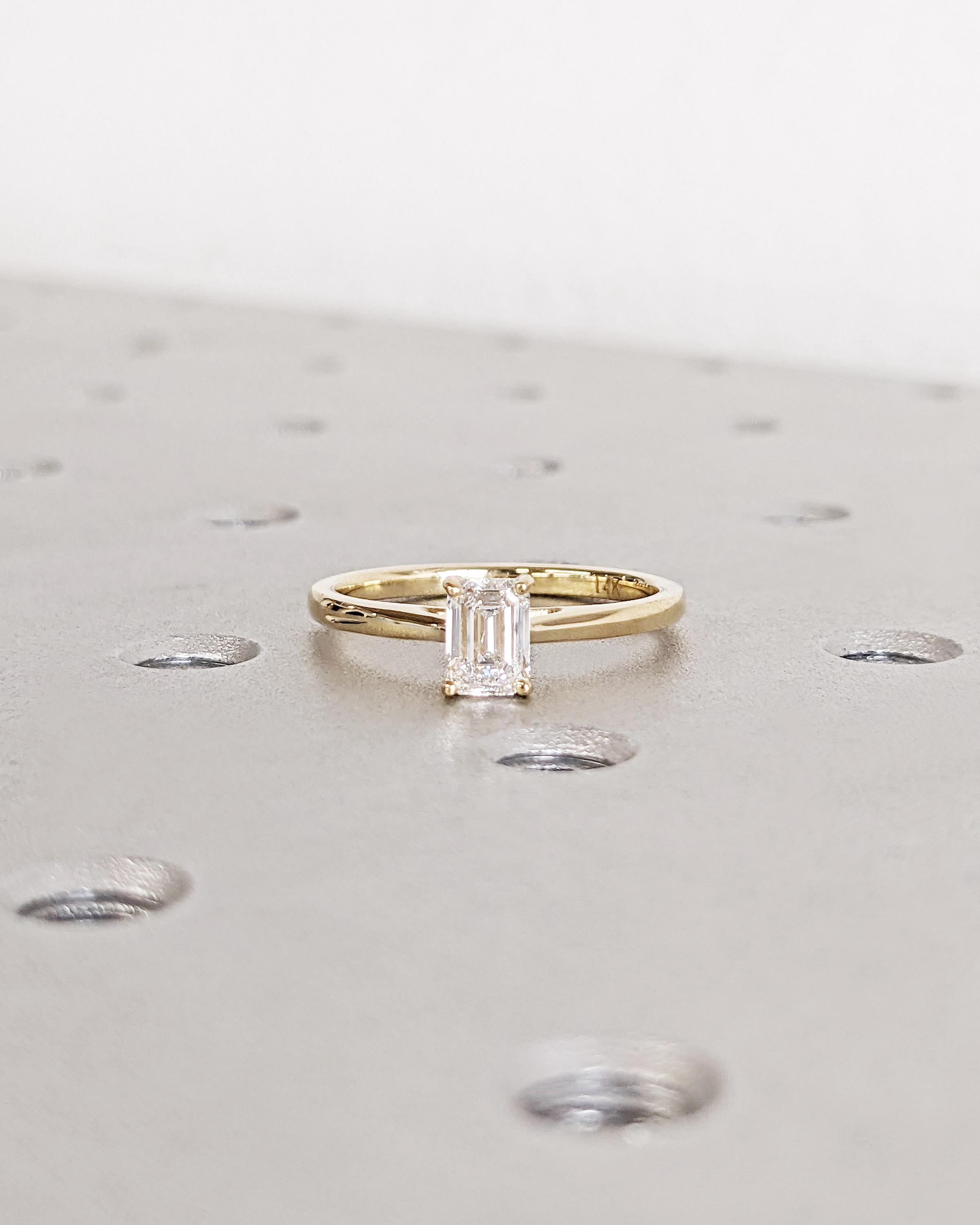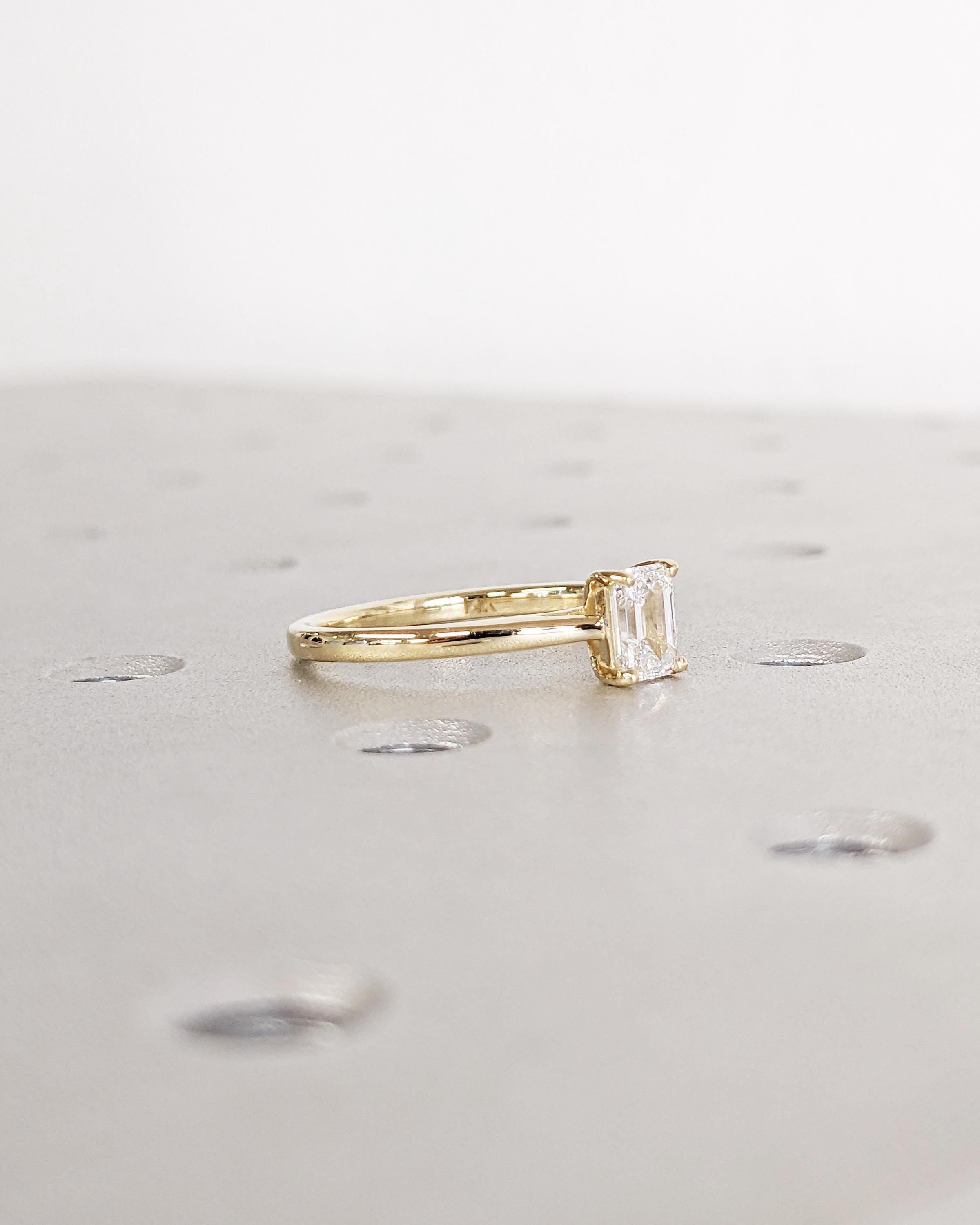 A beautiful emerald cut Moissanite solitaire set with a high basket setting on a dainty rounded thin band of 1.8mm width. This minimalist statement jewelry wears comfortably and its timeless elegance suitable for any occasion.