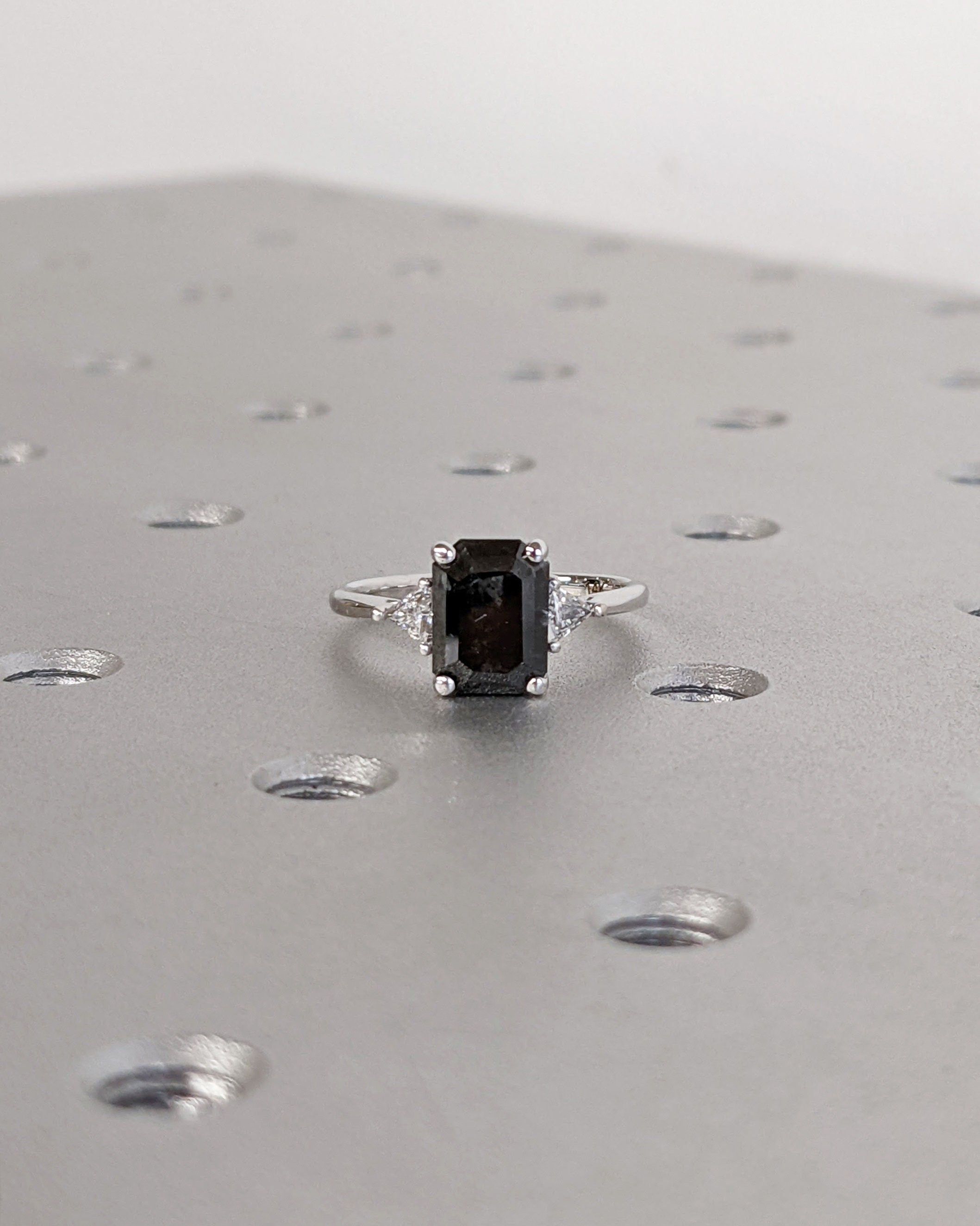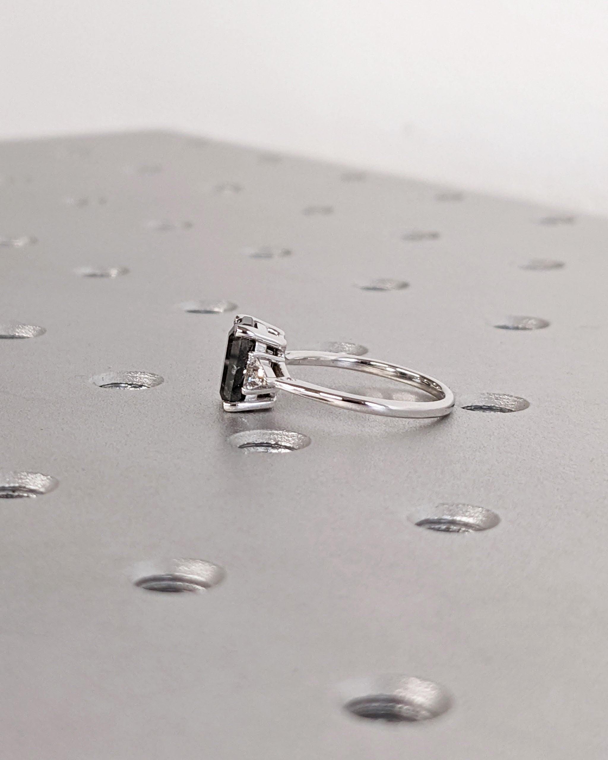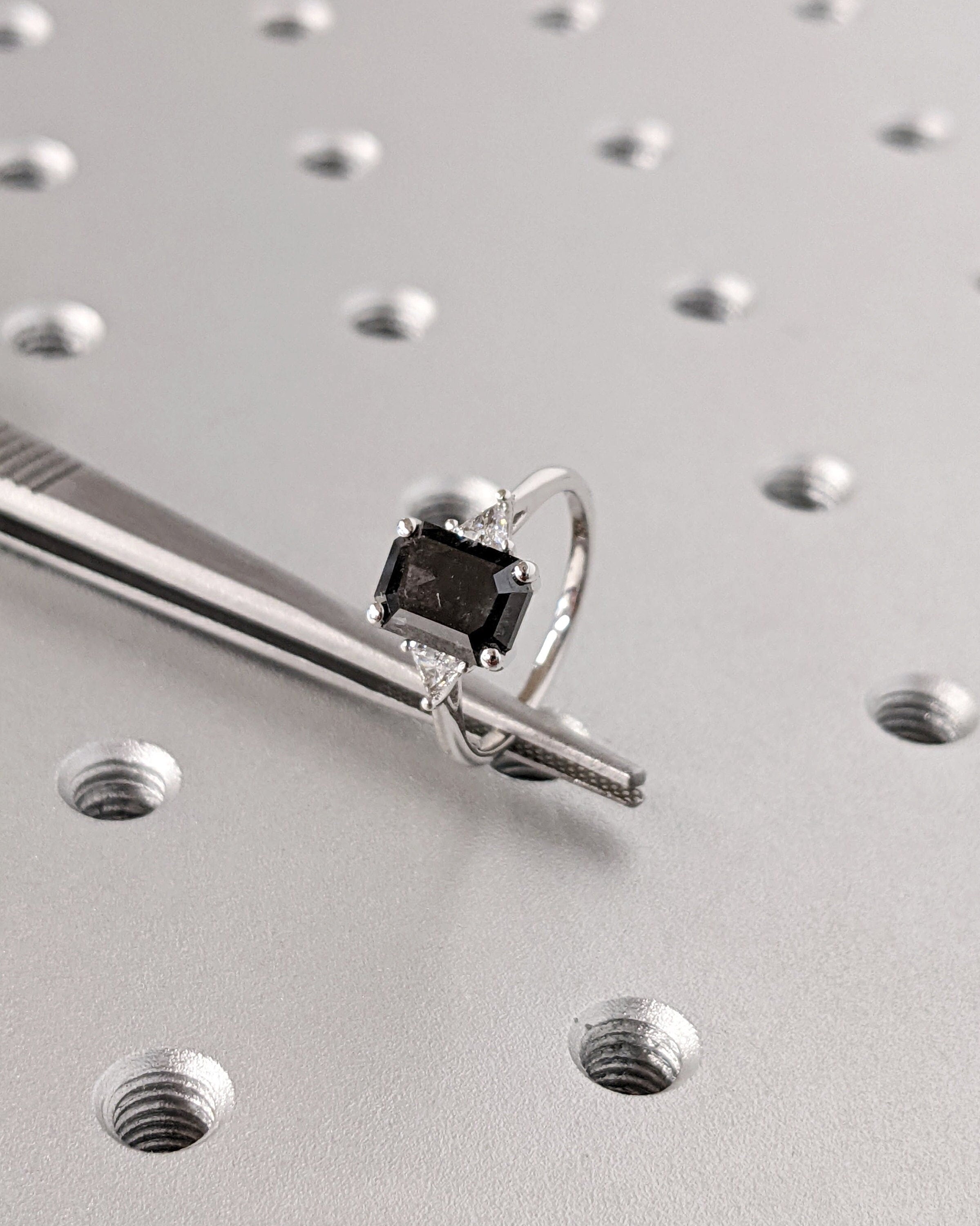 This ring showcases a raw Salt and Pepper Diamond in a striking emerald cut, complemented by a dazzling trillion cut white Diamond. With its galaxy inclusion, it blends modern style with timeless elegance. Perfect for those who value unique and unconventional jewelry. An ideal choice for engagements, weddings or as a meaningful gift to celebrate love and individuality.