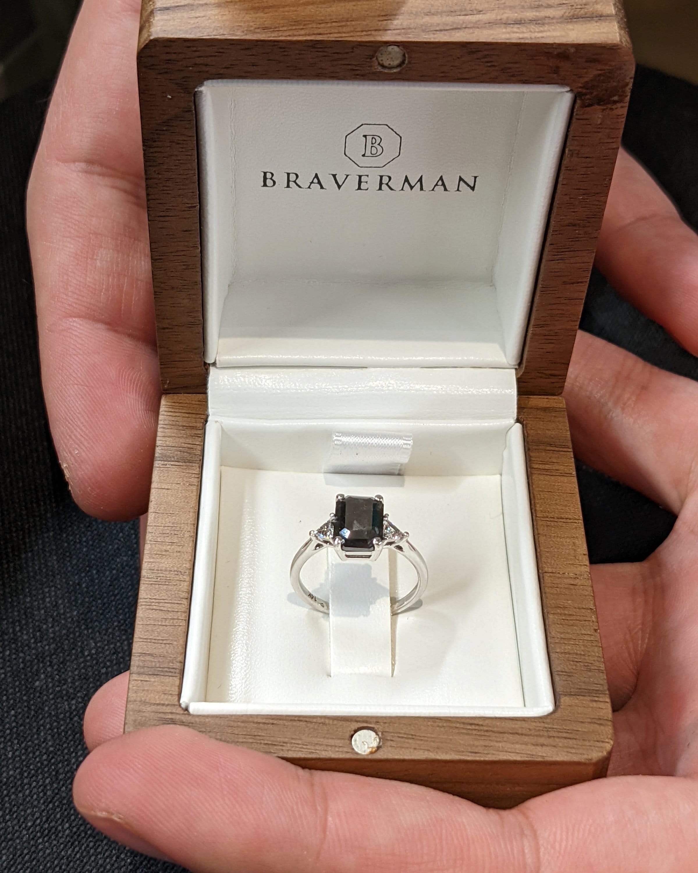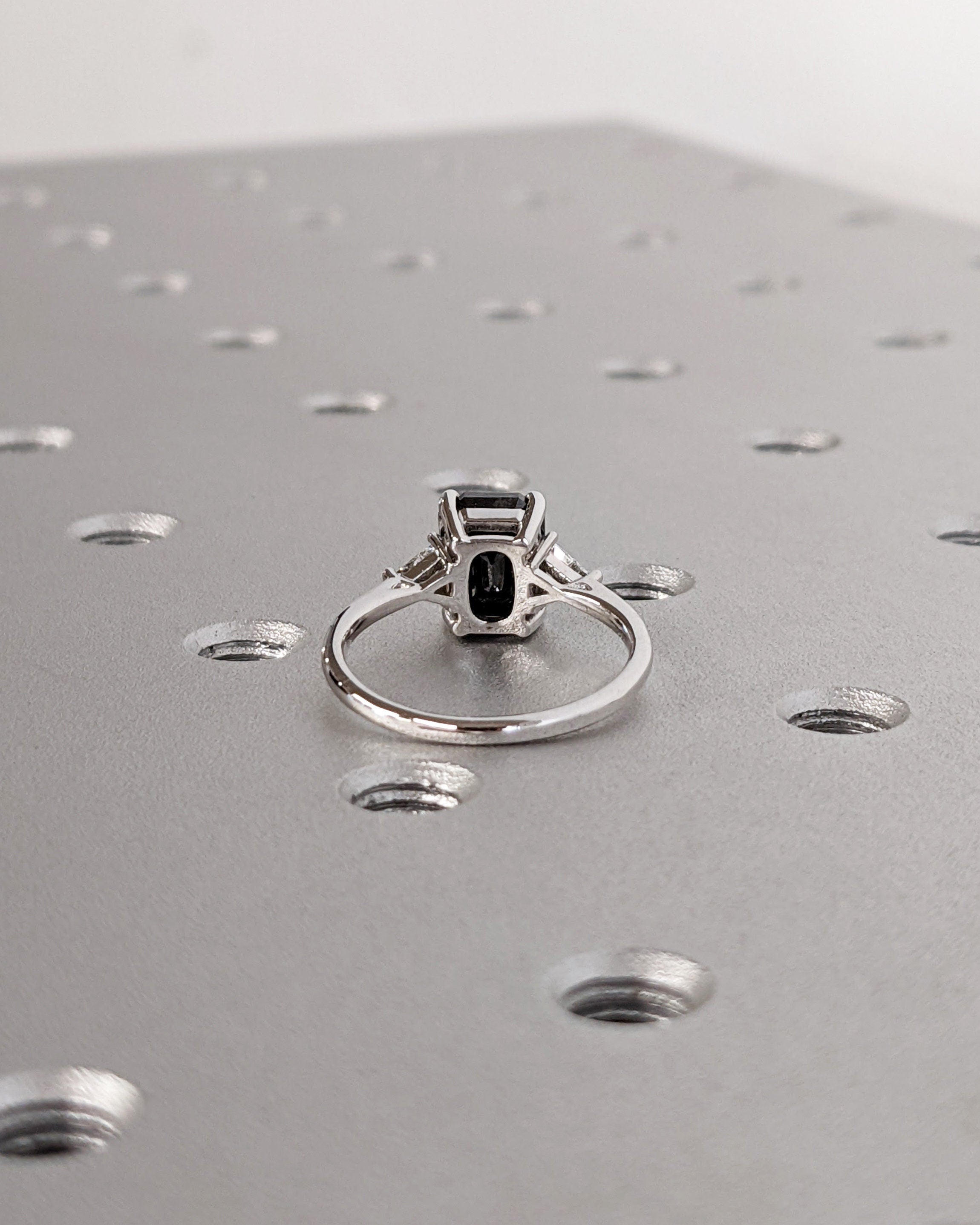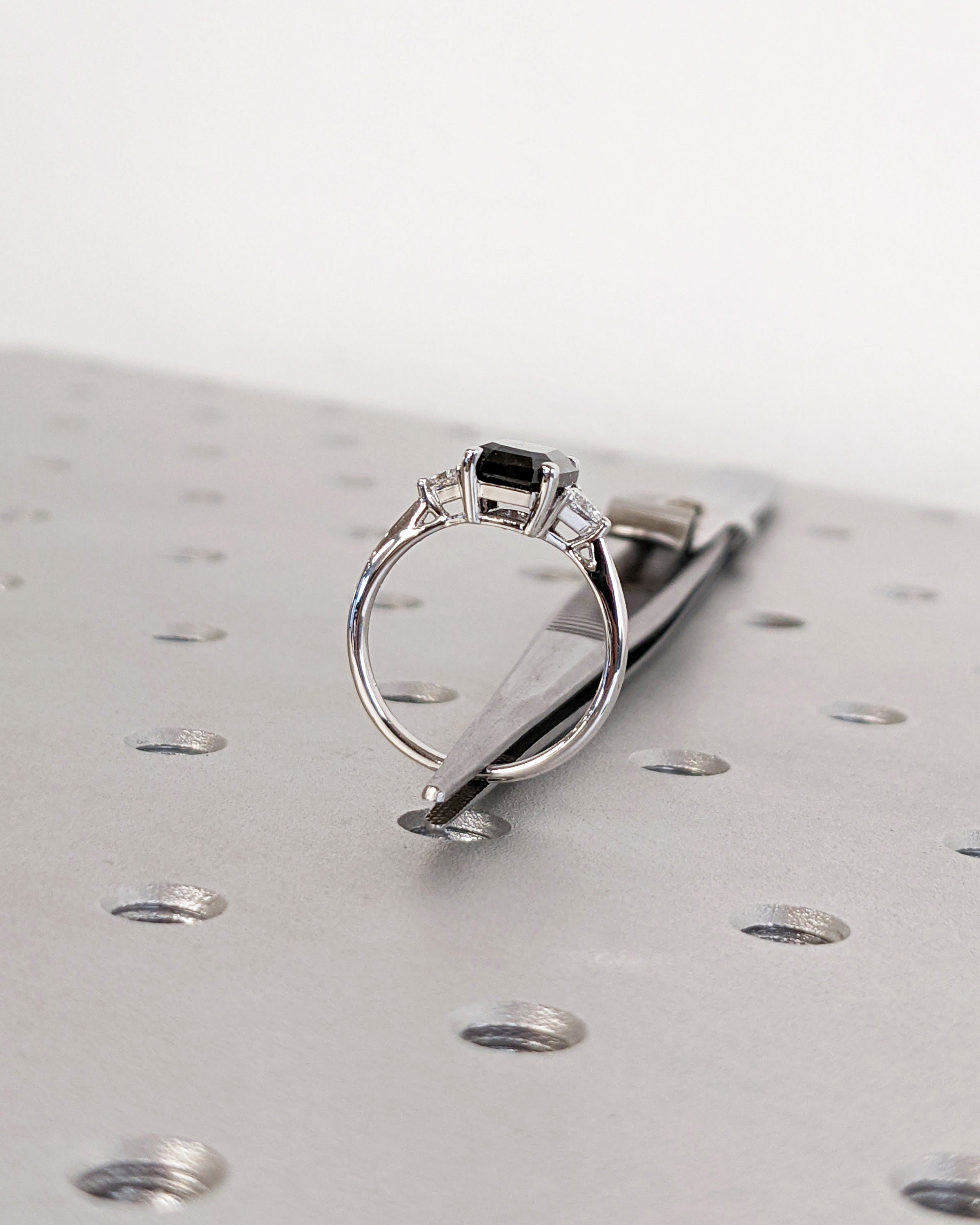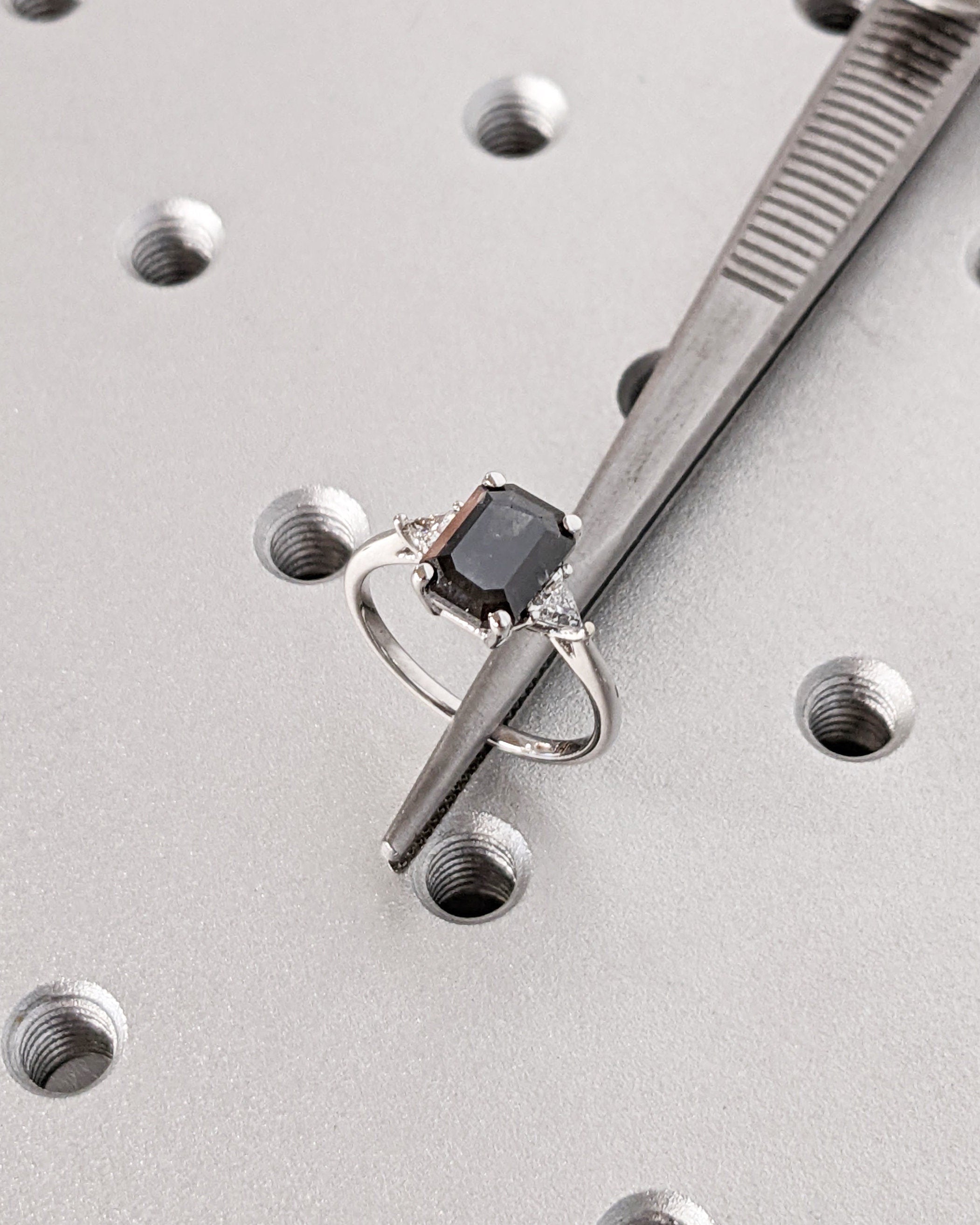 This ring showcases a raw Salt and Pepper Diamond in a striking emerald cut, complemented by a dazzling trillion cut white Diamond. With its galaxy inclusion, it blends modern style with timeless elegance. Perfect for those who value unique and unconventional jewelry. An ideal choice for engagements, weddings or as a meaningful gift to celebrate love and individuality.