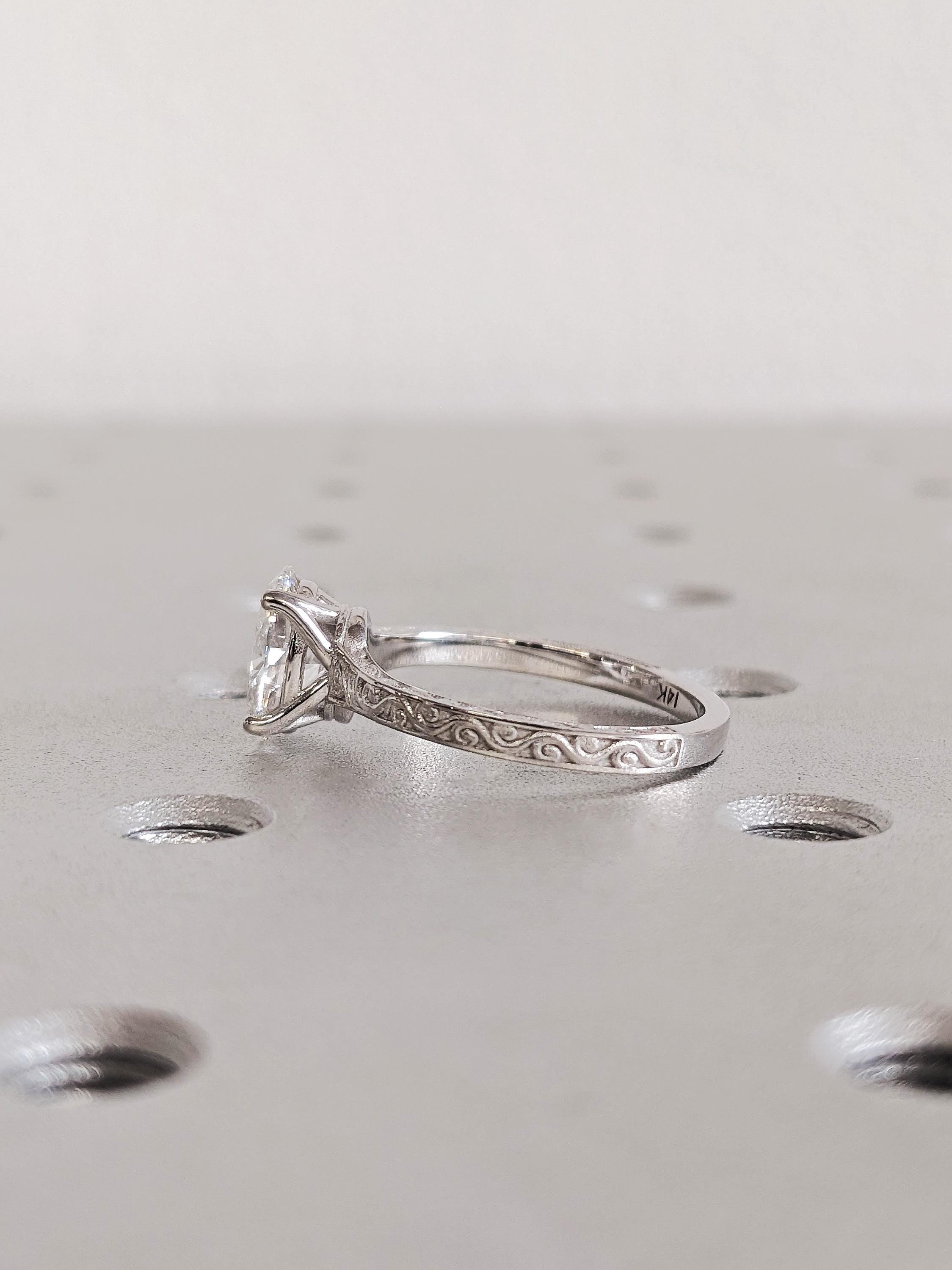This elegant engagement ring showcases an oval cut Moissanite in a timeless solitaire design. Crafted in gold, the band features intricate filigree detailing that enhances its vintage charm, while the addition of a gallery rail provides extra support and a refined touch of sophistication. A perfect blend of classic beauty and artisan craftsmanship.