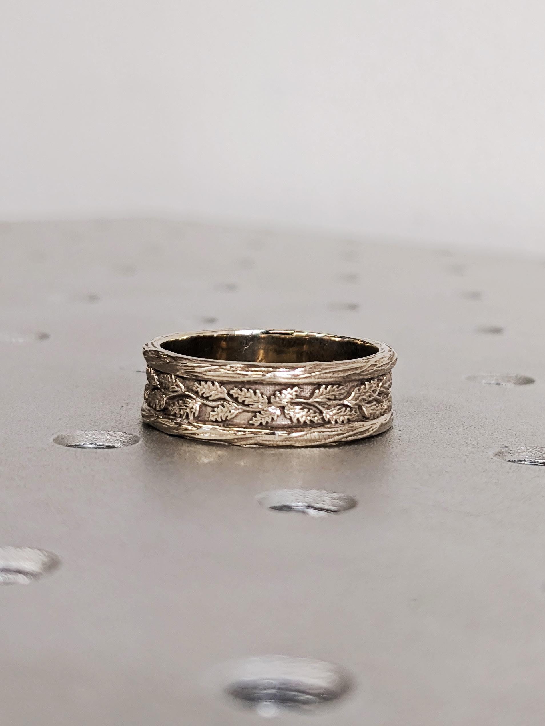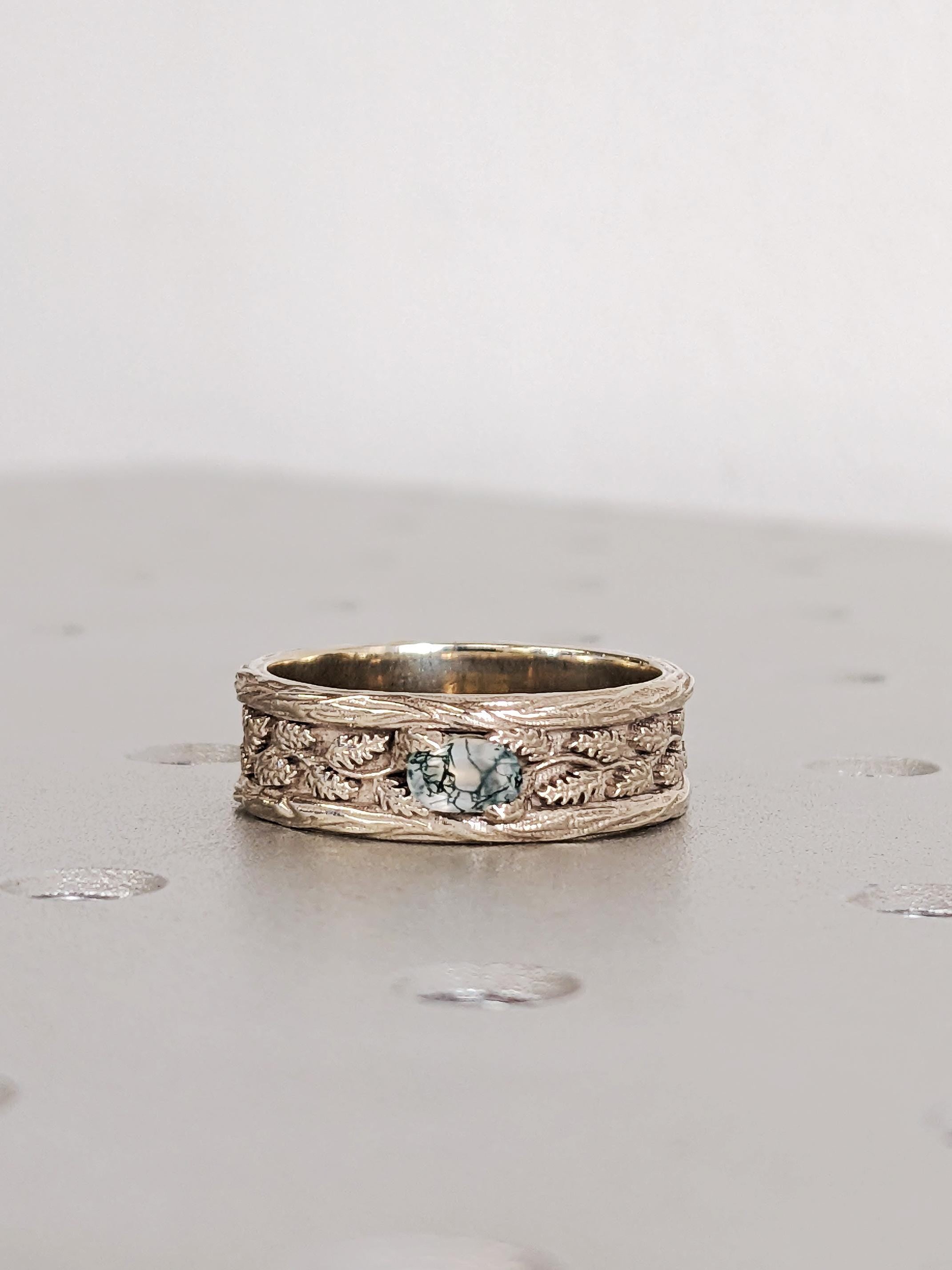This men's ring features a bold and intricate design. The band is decorated with detailed engravings inspired by natural foliage, giving it an organic, earthy charm. At the center, a vibrant oval Moss Agate is securely set, creating a striking contrast against the engraved band. With its sturdy craftsmanship and refined detailing, this ring perfectly balances rugged sophistication.