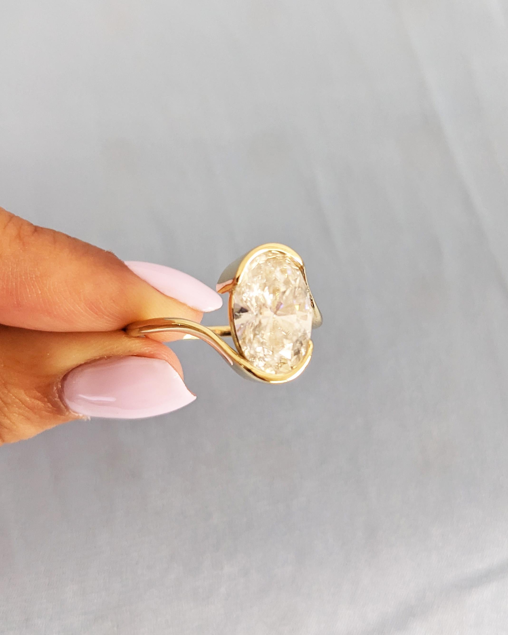 Modern and unique, a bezel set bypass ring featuring an oval cut Moissanite center stone, set on a dainty 1.6mm width band. This minimalist yet trendy statement ring makes it a wonderful complementing jewelry for any occasion.