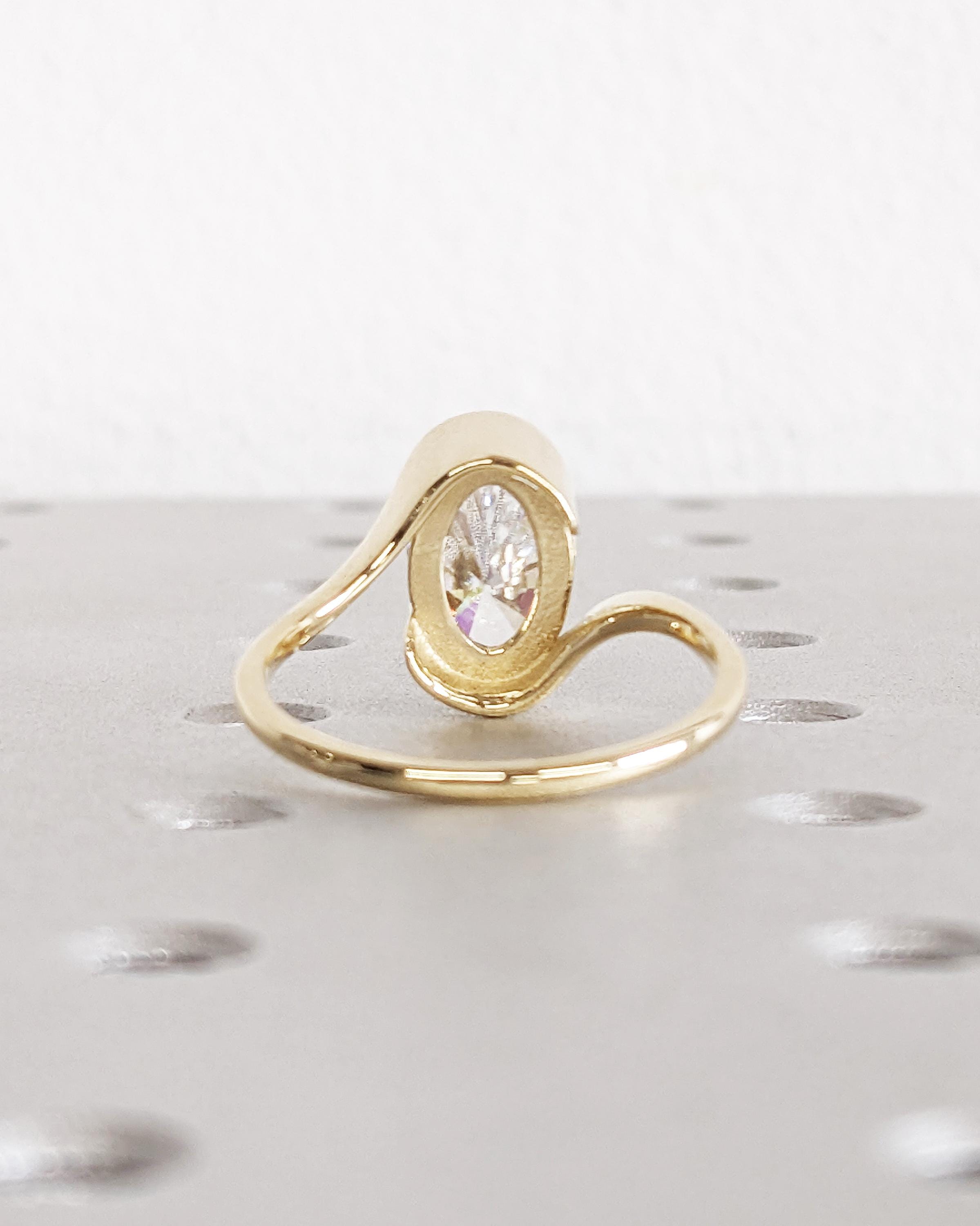 14K Solid Yellow Gold Bezel Engagement Ring, Oval Cut Solitaire Moissanite Ring, Bypass Shank Wedding Ring, Sleek Twist Design Promise Ring