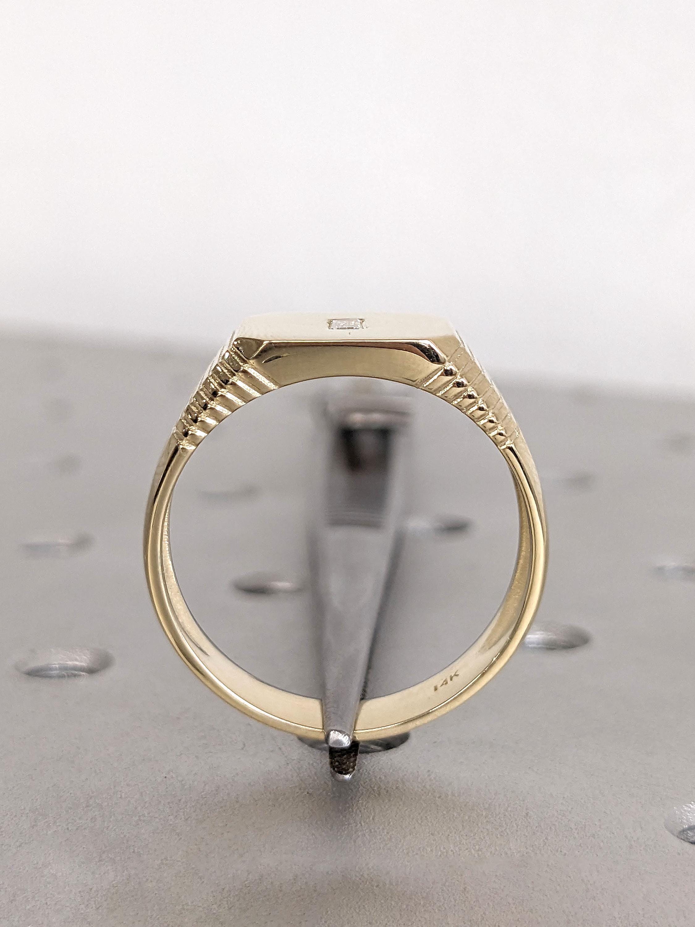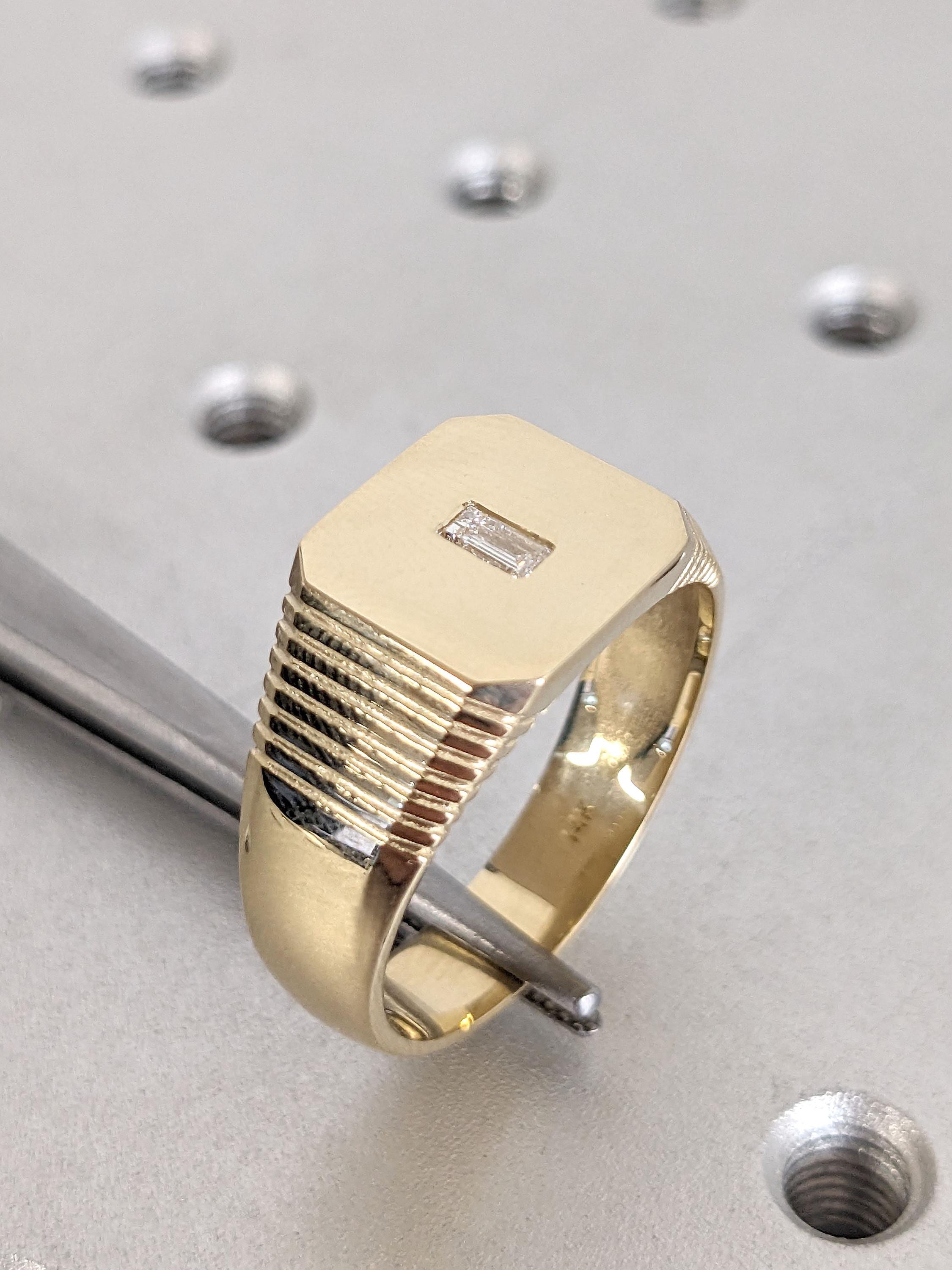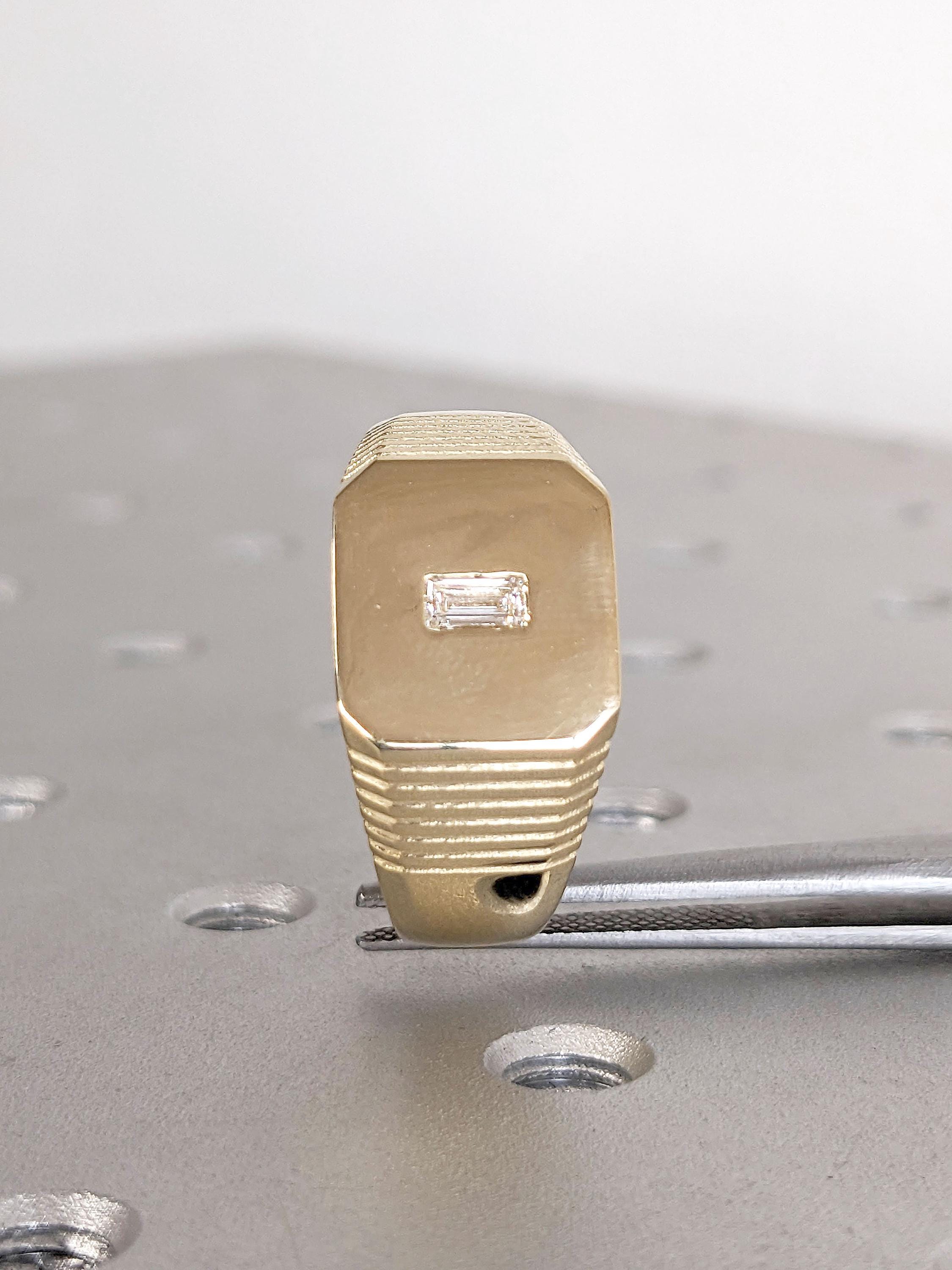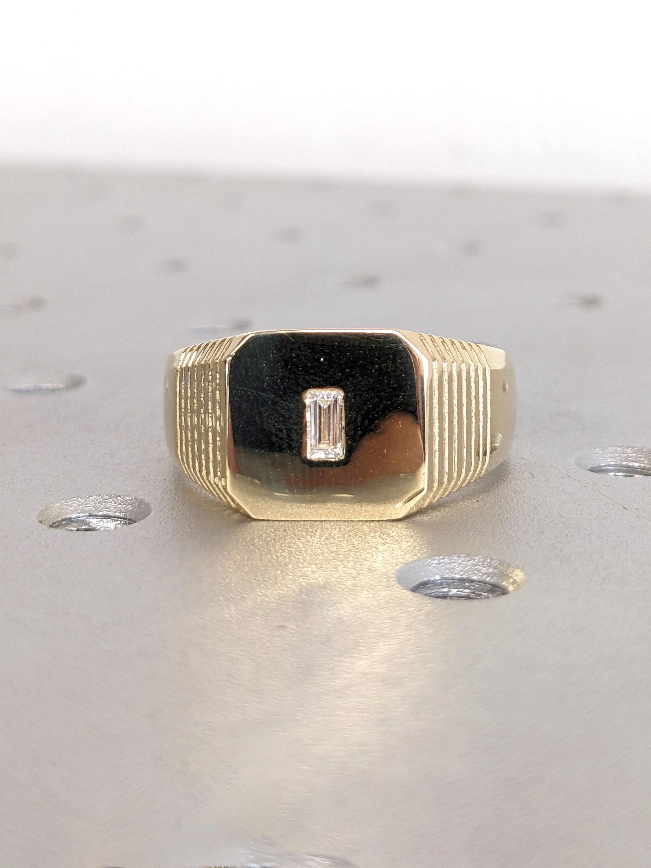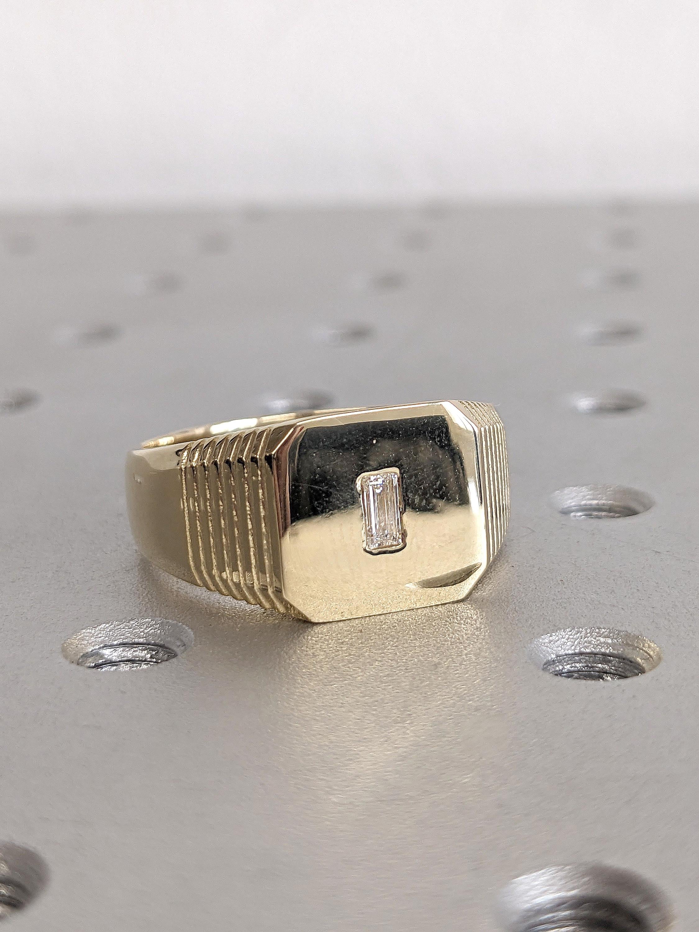 Bold and sculptural, this modern signet ring features a wide 8mm band with a pavé-set baguette diamond centerpiece. The shoulders are detailed with subtle ridge accents, adding texture and dimension to its clean silhouette. A refined statement piece with a sharp edge crafted for confidence and character.