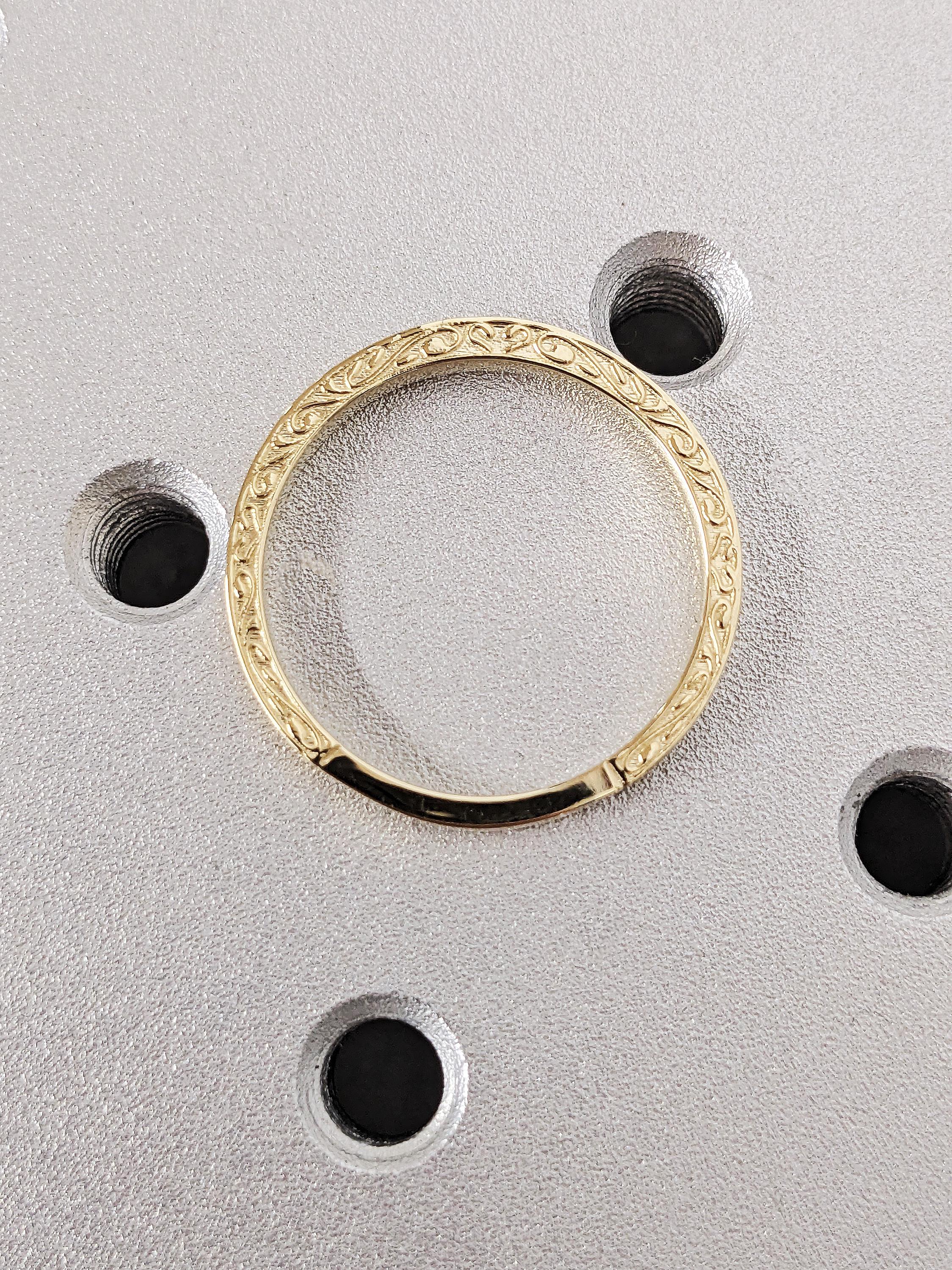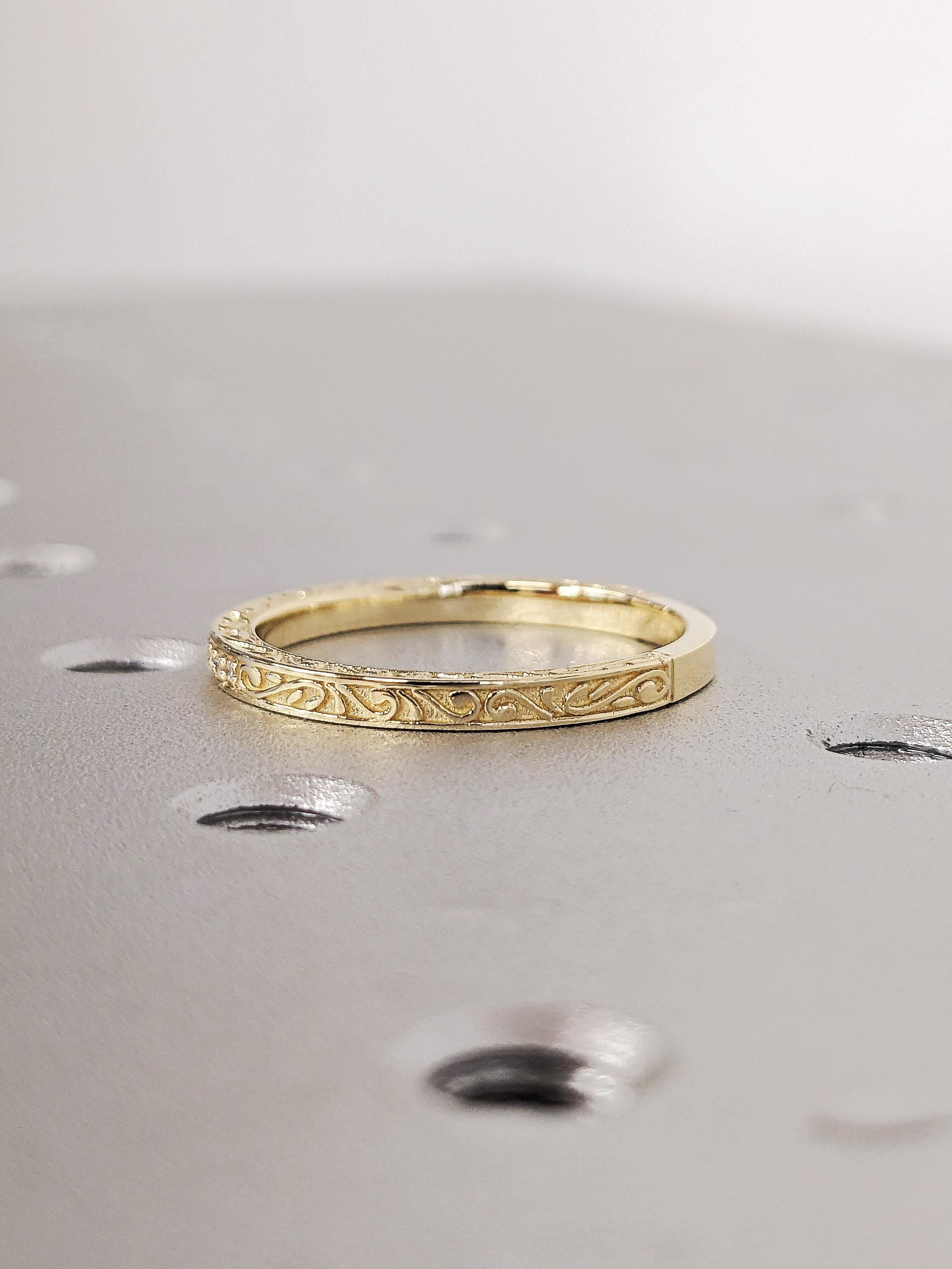 14K Solid Yellow Gold Floral Engraved Matching Ring, Thin Round White Diamond Pavé Wedding Band, Custom Filigree Stacking Ring
