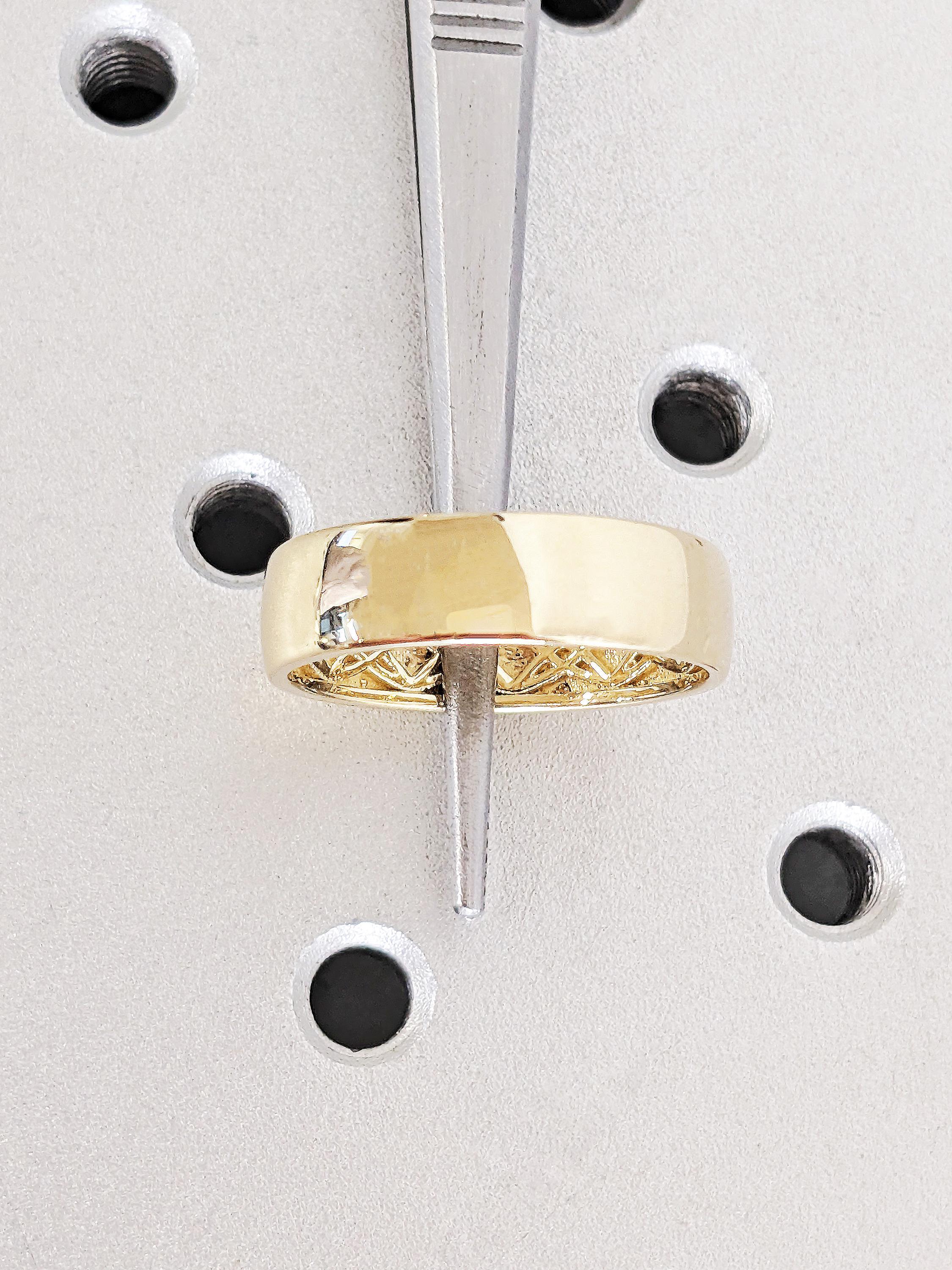 Celebrate everlasting love with this Hidden Celtic Knot wedding band. Expertly crafted with intricate knotwork concealed within a sleek modern design, it symbolizes eternal connection and unity. The subtle detailing inside the band adds a meaningful touch, perfect for those who value both style and symbolism.