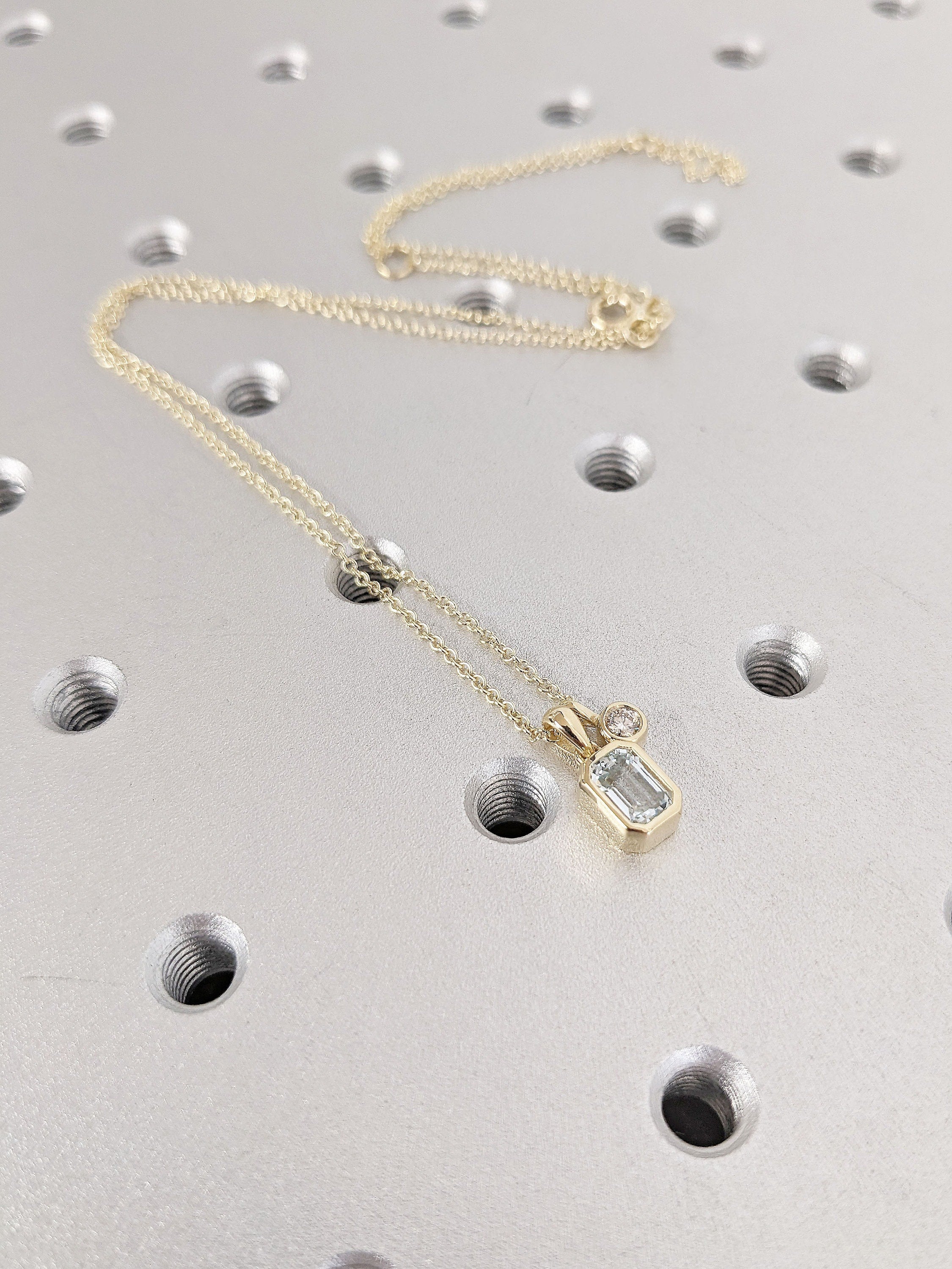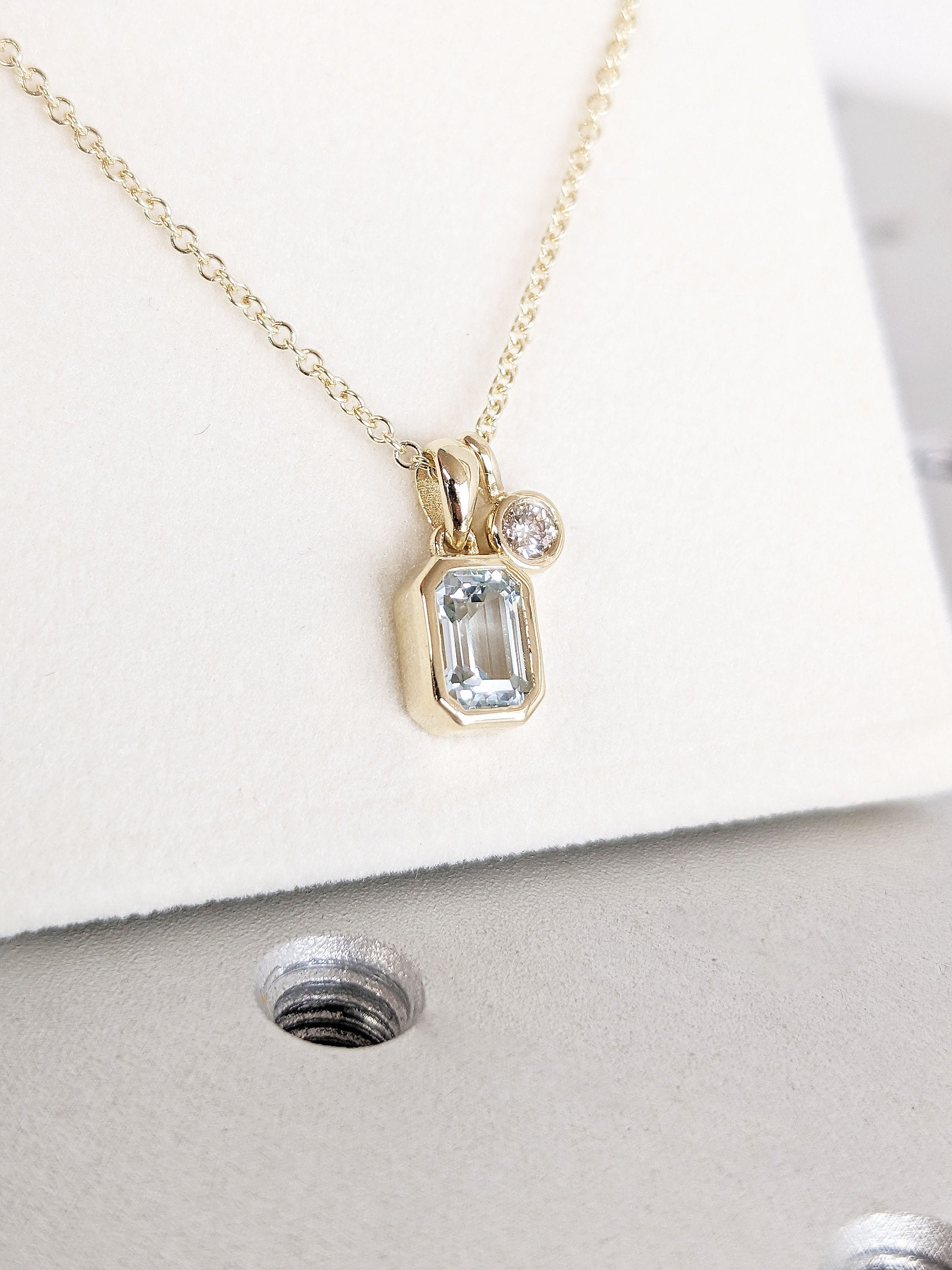 Elegant and timeless, this necklace features a striking emerald cut Lab Aquamarine that shimmers brilliantly. The dainty pendant is accented with your choice of natural Diamond, Lab Diamond or Moissanite. Perfect for everyday wear or as a thoughtful gift, this piece combines sophistication with a modern minimalist style