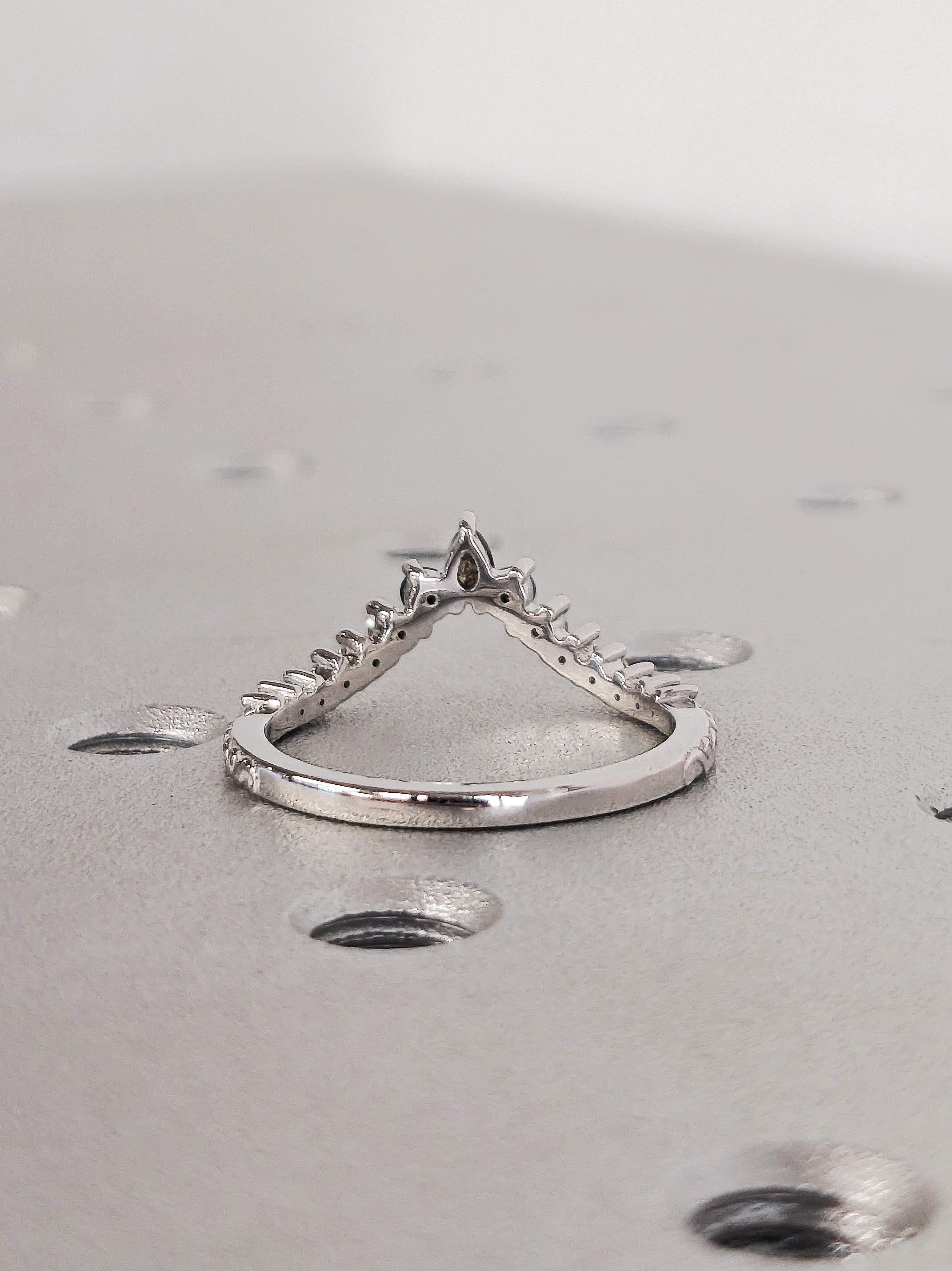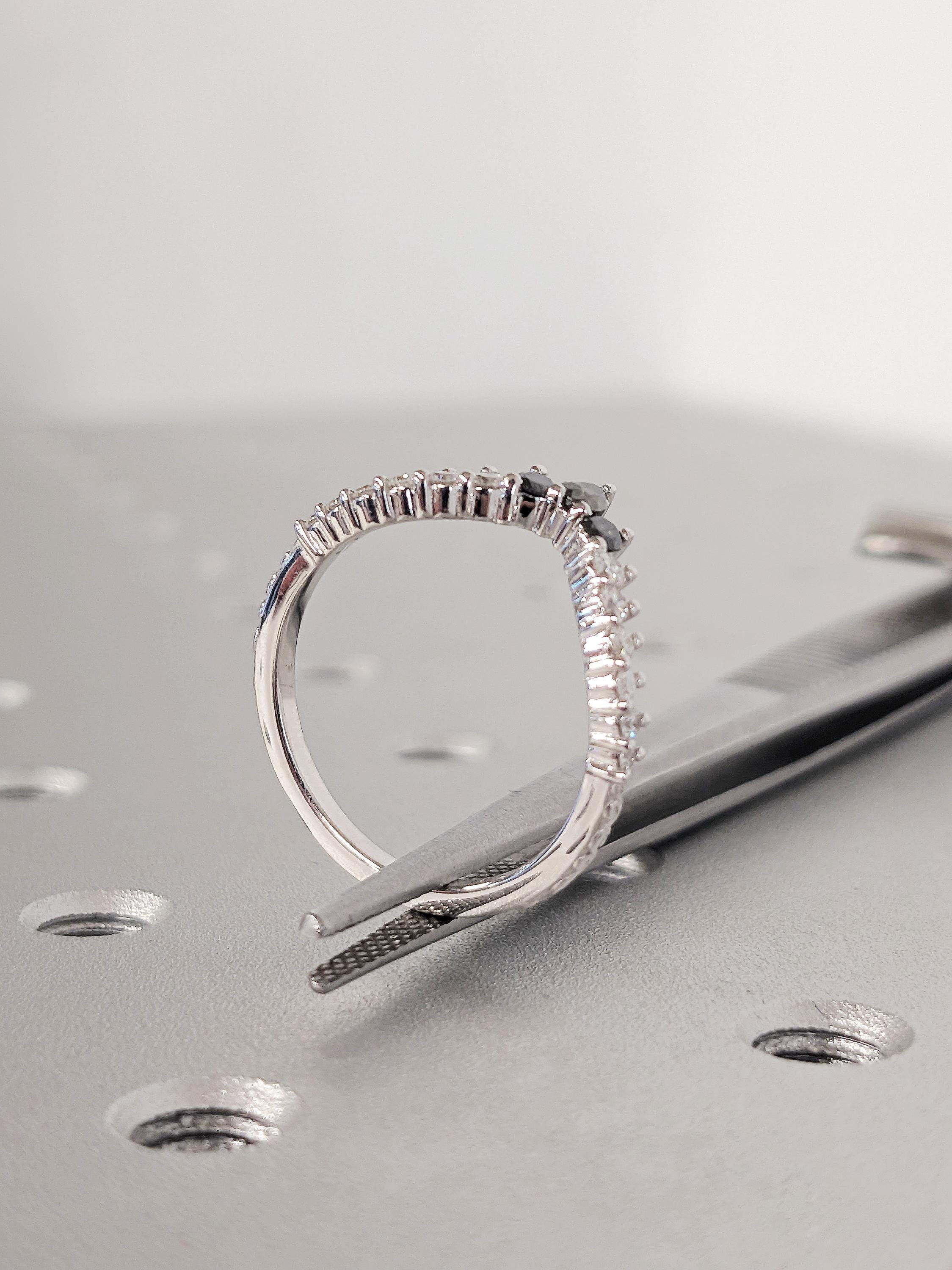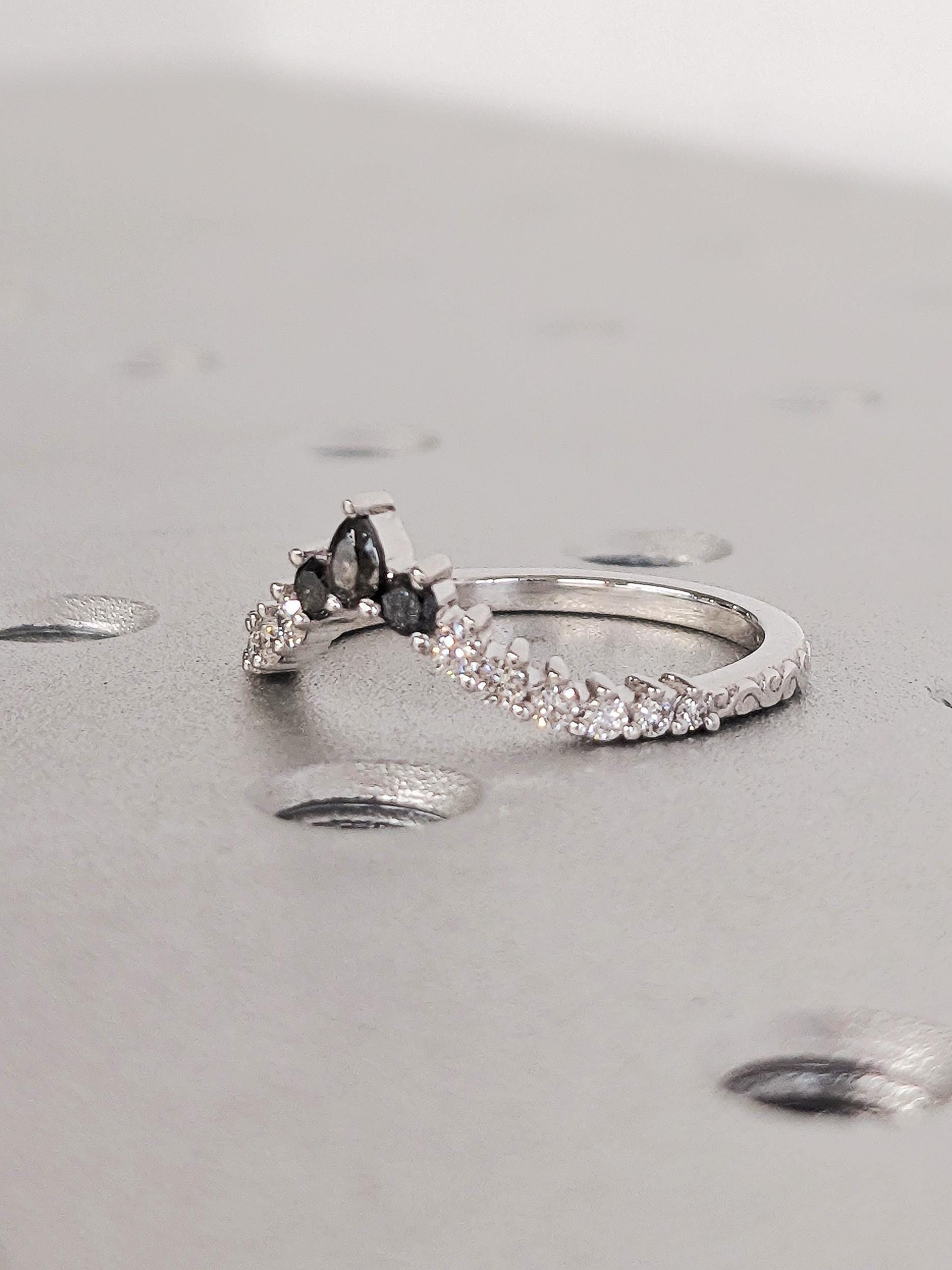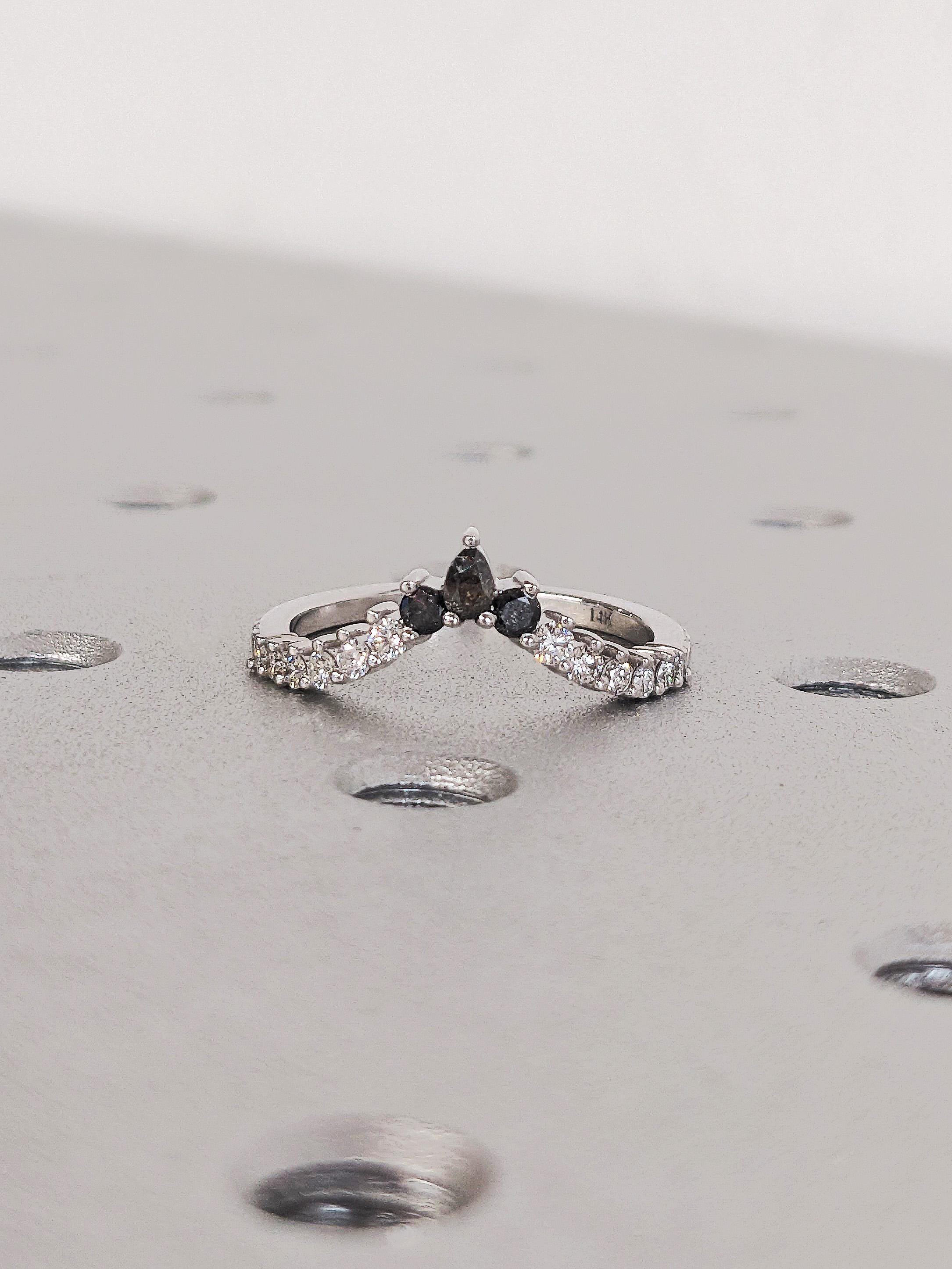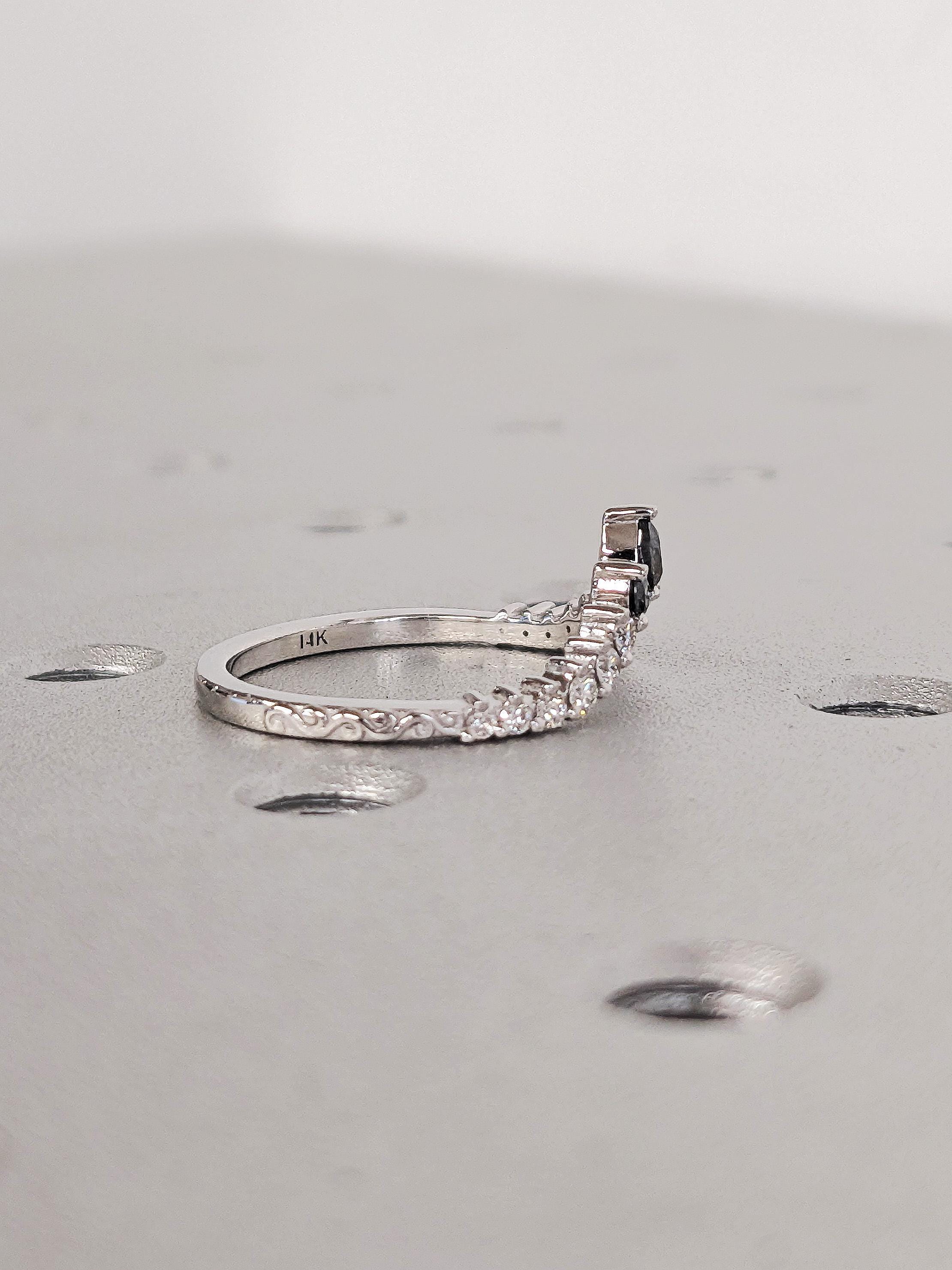14K White Gold Pear Salt and Pepper Diamond Matching Ring, Filigree Hand Engraved Band, Women's Stacking Ring