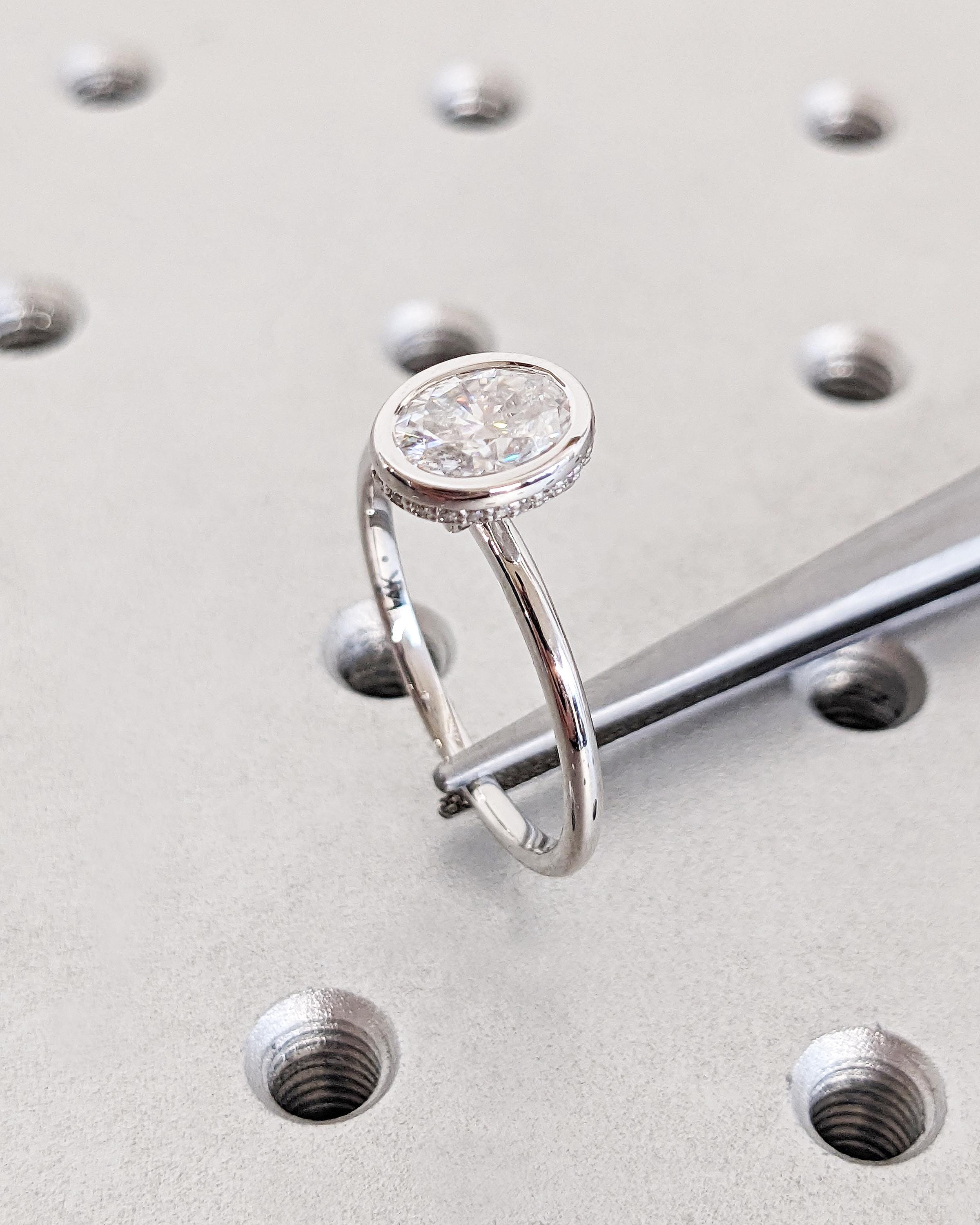 14K White Gold Crushed Ice Oval Lab Grown Diamond Solitaire Ring / 1 Carat Oval Engagement Ring / Bezel Set Hidden Halo Promise Ring for Her