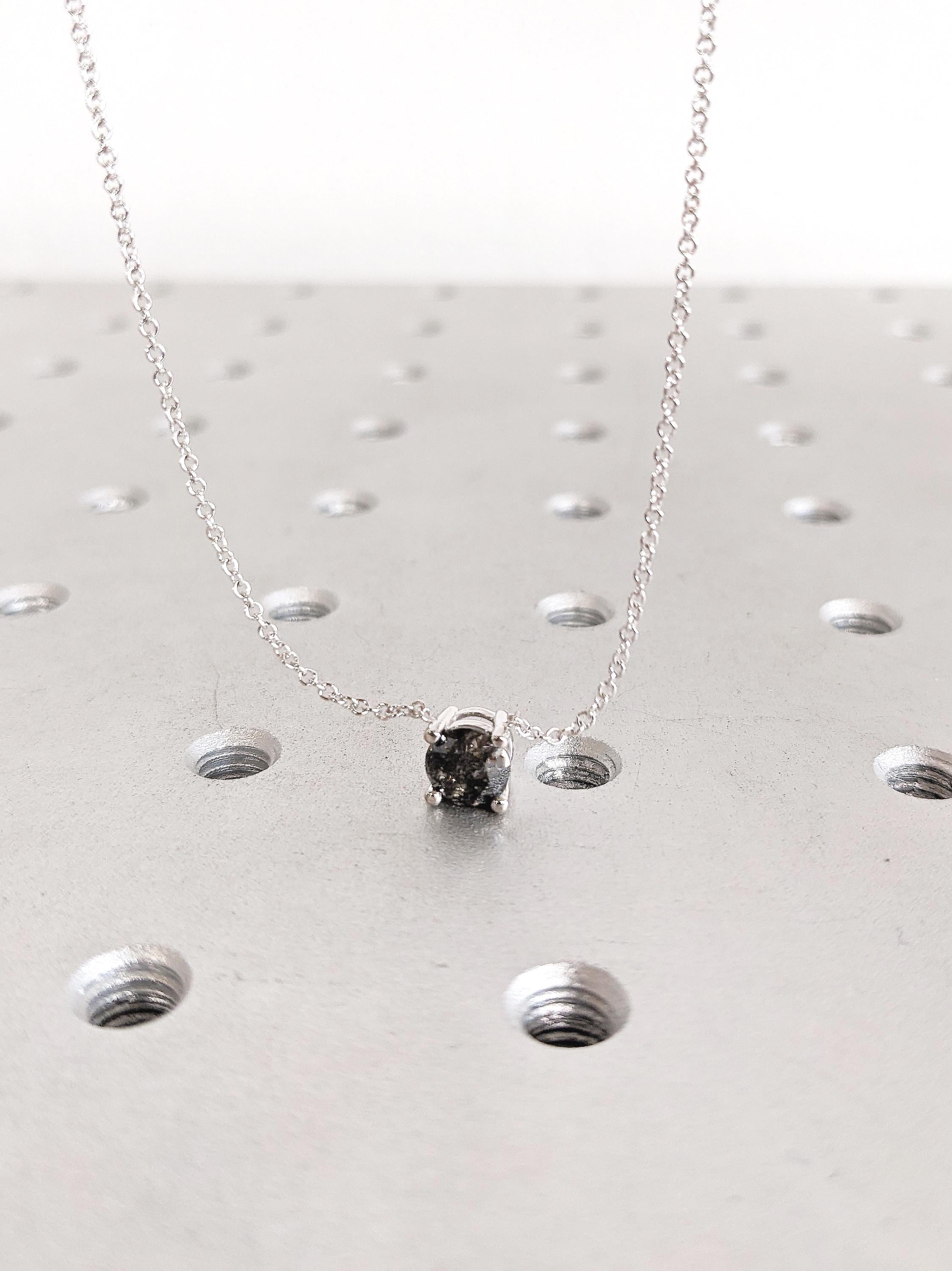 This elegant necklace showcases a captivating salt and pepper diamond pendant, secured in a delicate prong setting. The unique speckled inclusions of the diamond add a modern twist to its natural beauty, making it a timeless yet contemporary piece.