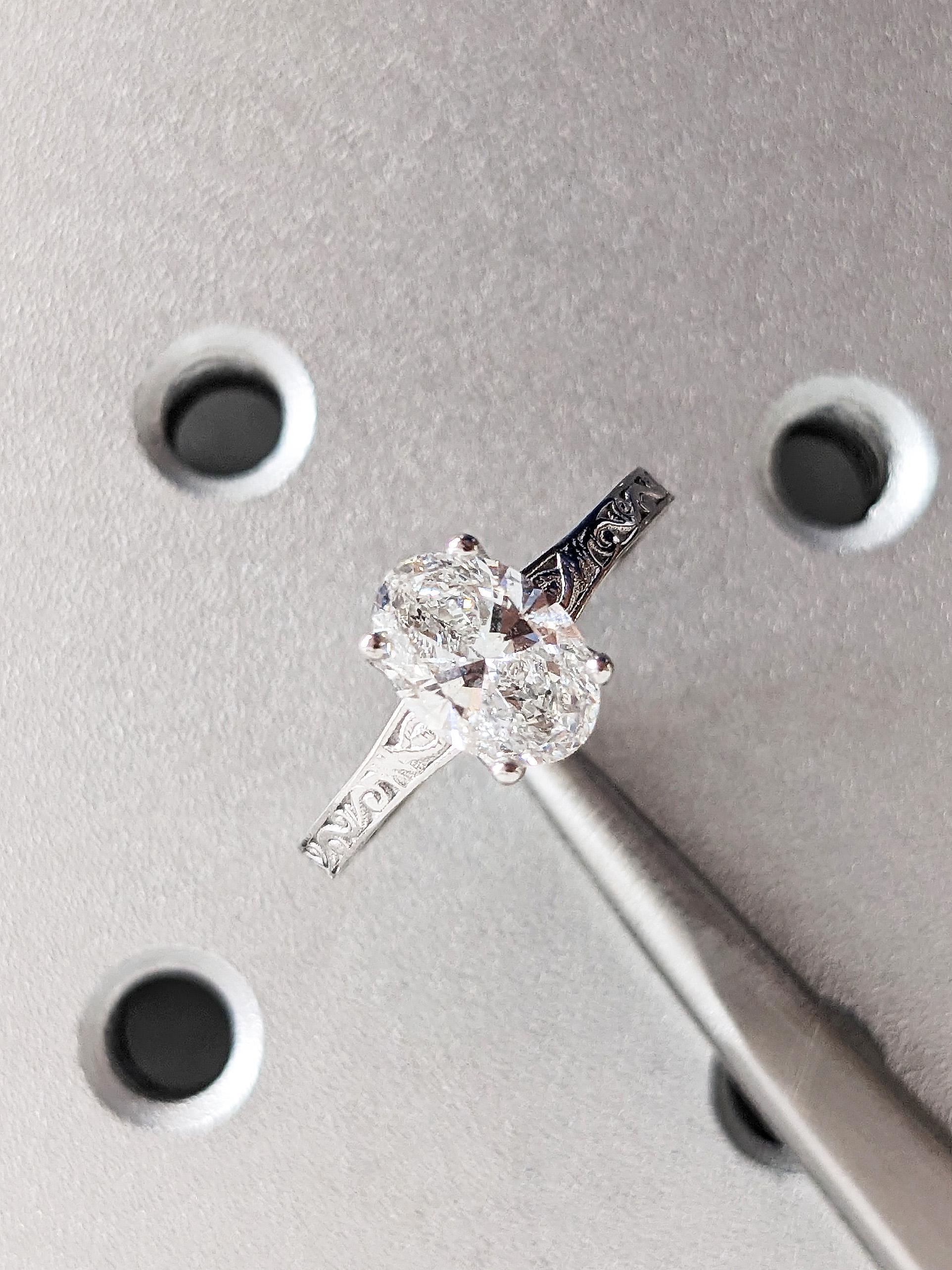This elegant engagement ring showcases an oval cut Lab Grown Diamond in a timeless solitaire design. Crafted in gold, the band features intricate filigree detailing that enhances its vintage charm while the addition of a gallery rail provides extra support and a refined touch of sophistication. A perfect blend of classic beauty and artisan craftsmanship.