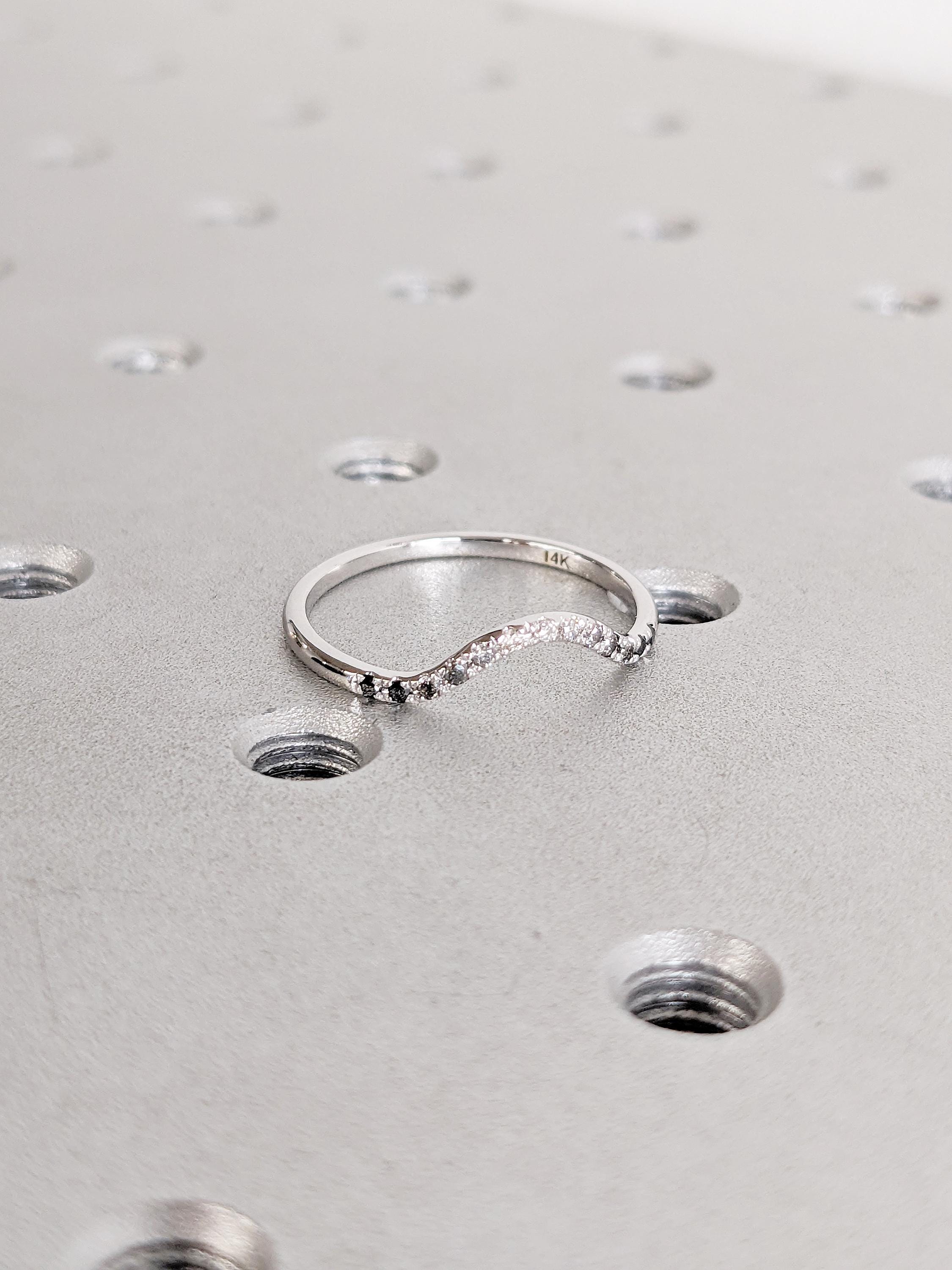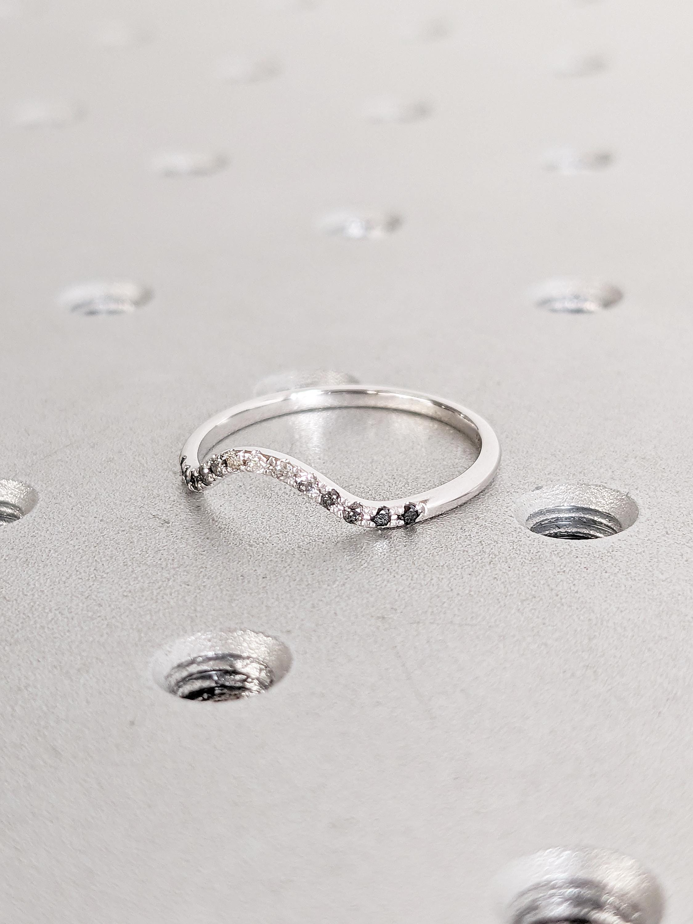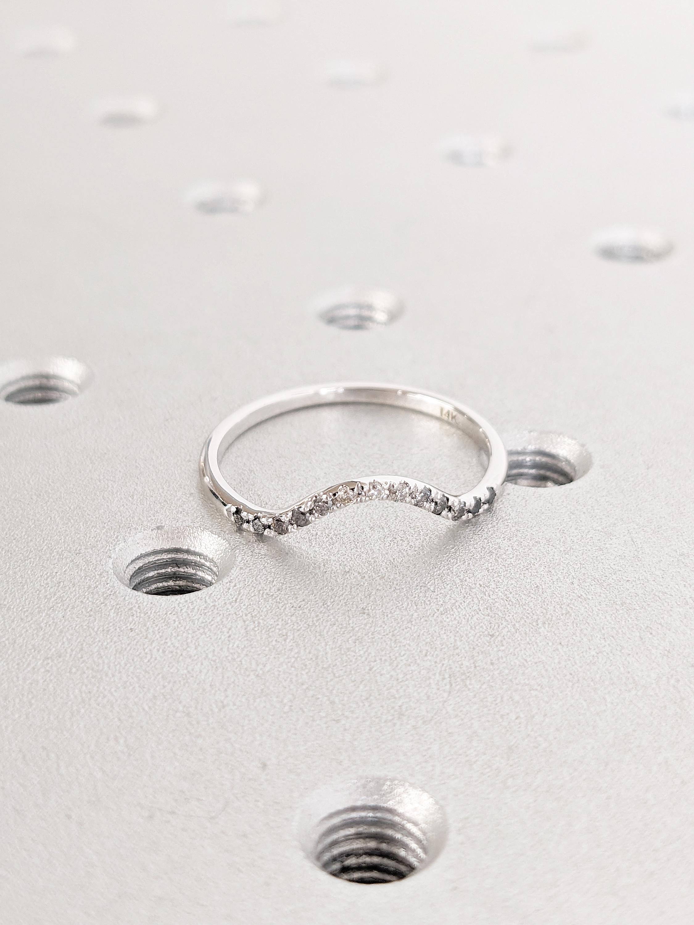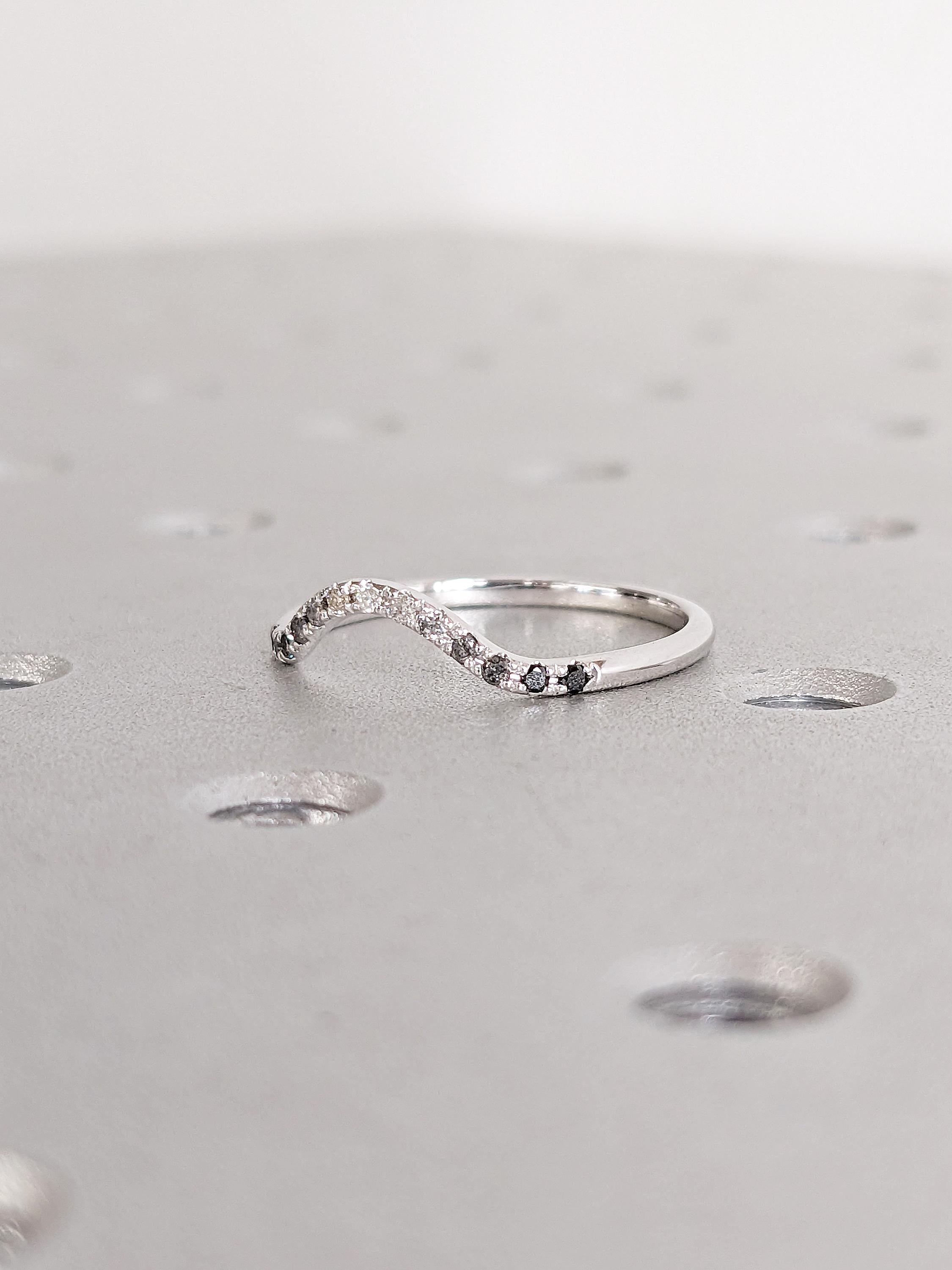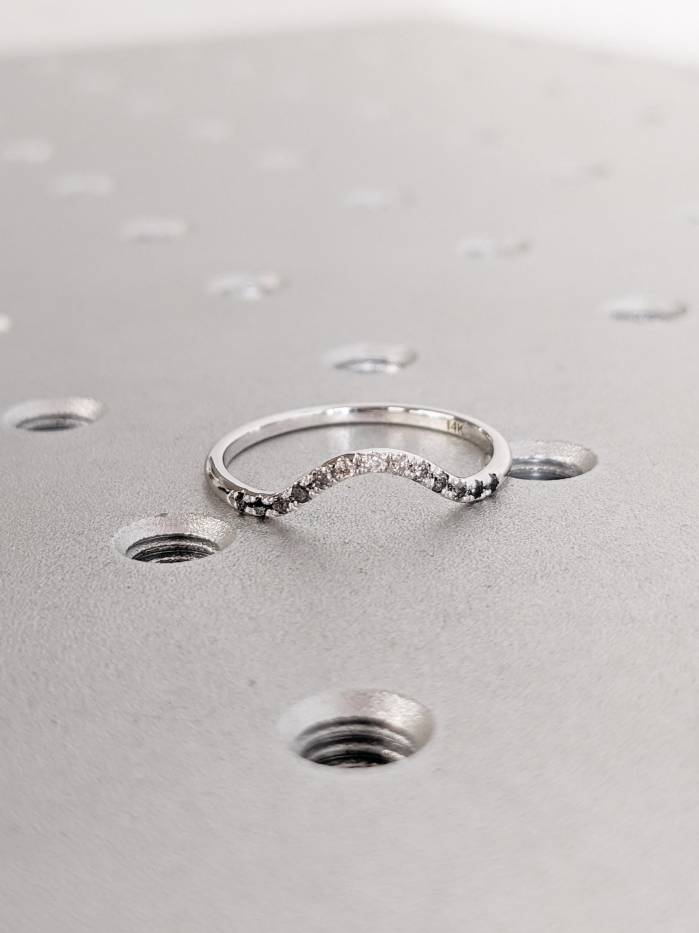 This ring showcases a gracefully curved design, accented with shimmering Ombre Diamonds that flow seamlessly along its arc. Whether worn solo or stacked, it offers a timeless elegance with a touch of modern minimalism, making it perfect for any occasion.