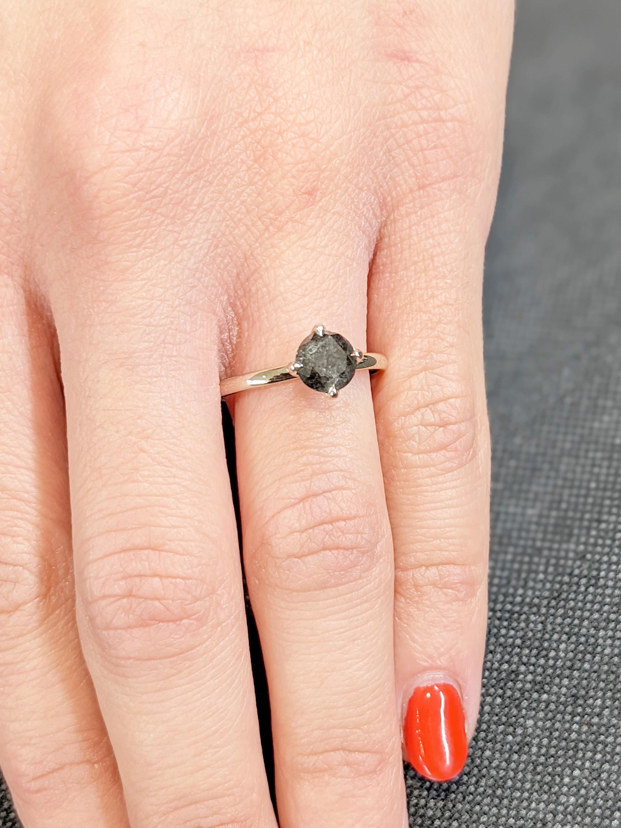 This elegant ring features a Natural Salt and Pepper Diamond in a classic round cut, showcasing its unique inclusions and striking character. The stone is secured in a refined talon prong setting, enhancing its brilliance while highlighting its natural beauty. Designed with a minimalist silhouette, it makes a distinctive choice for an engagement ring, a modern bridal piece, or a timeless ring for everyday wear.