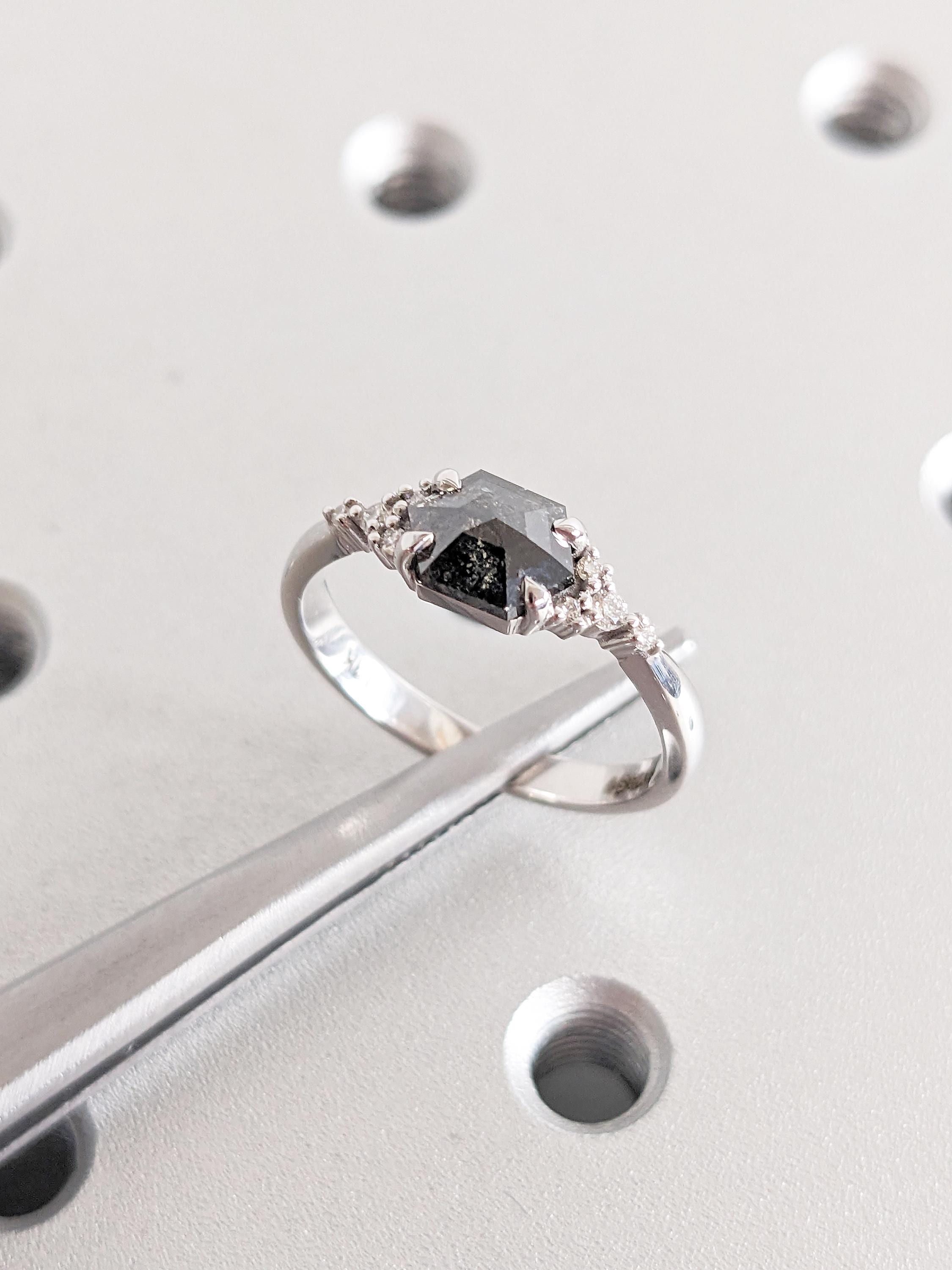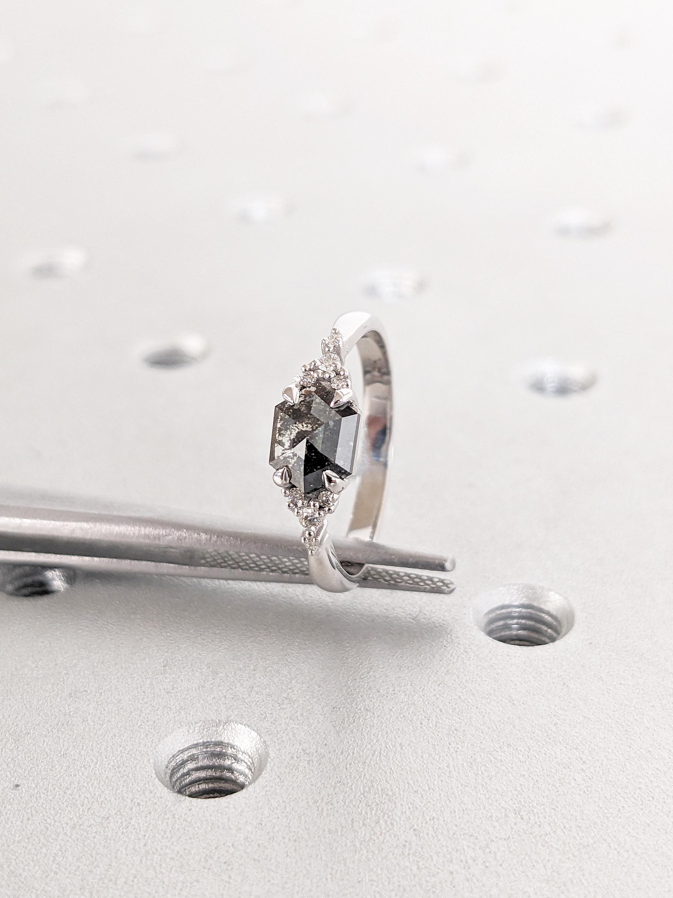14k White Gold Salt and Pepper Diamond Ring, Hexagon Engagement Ring, Diamond Cluster Ring