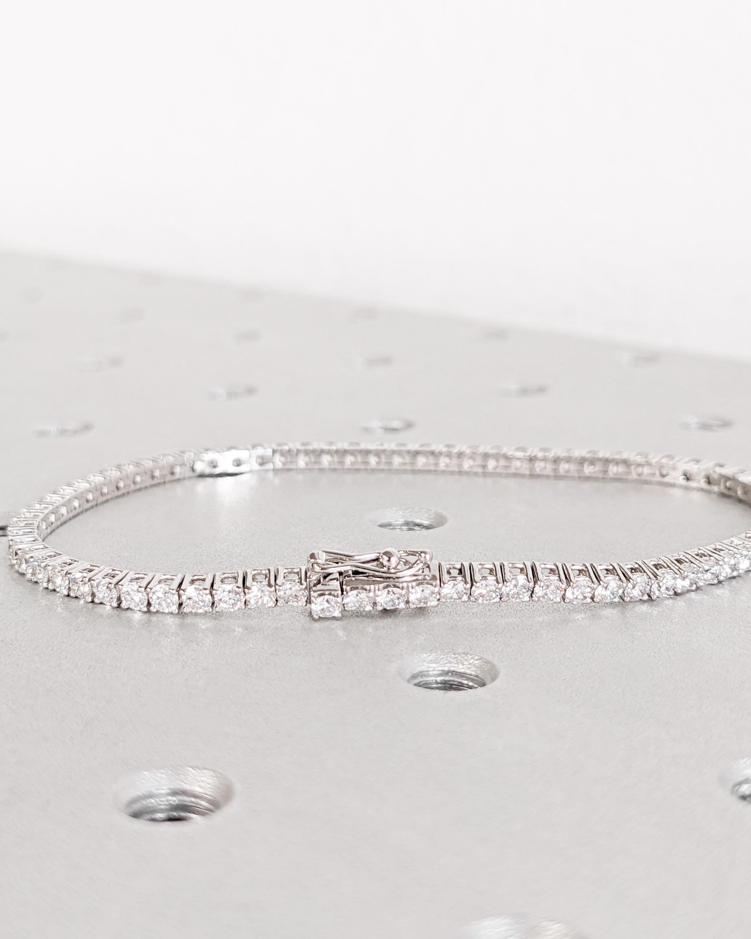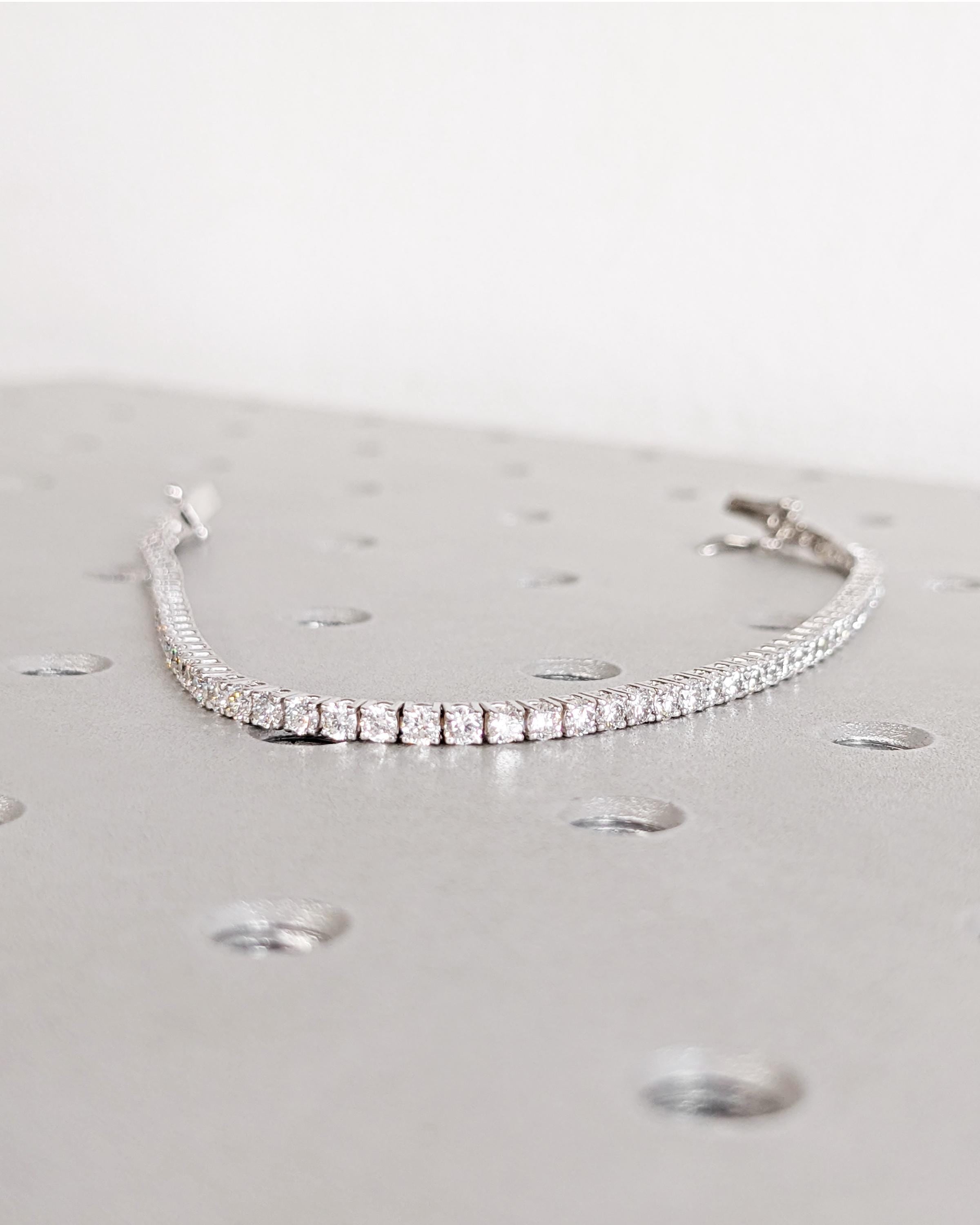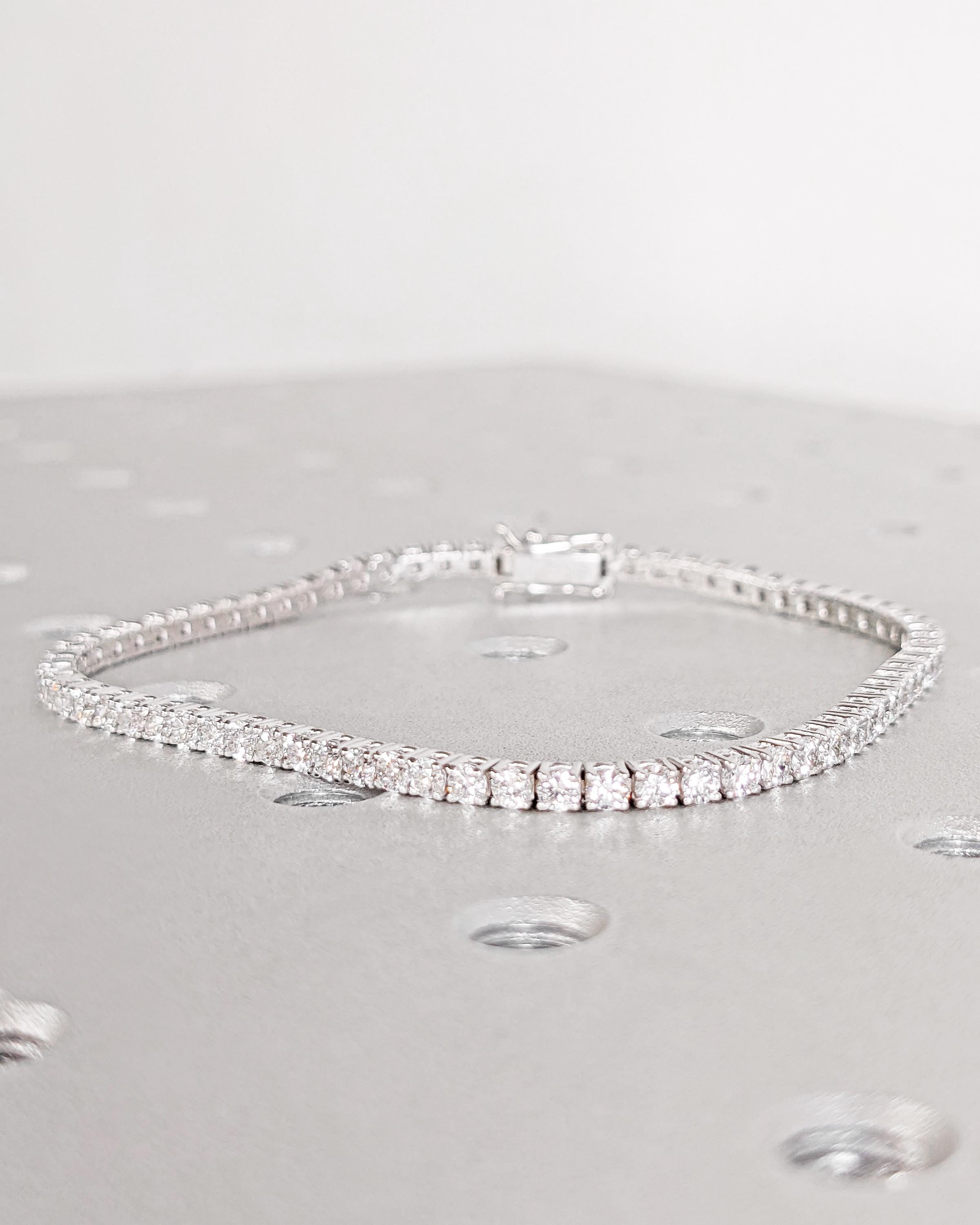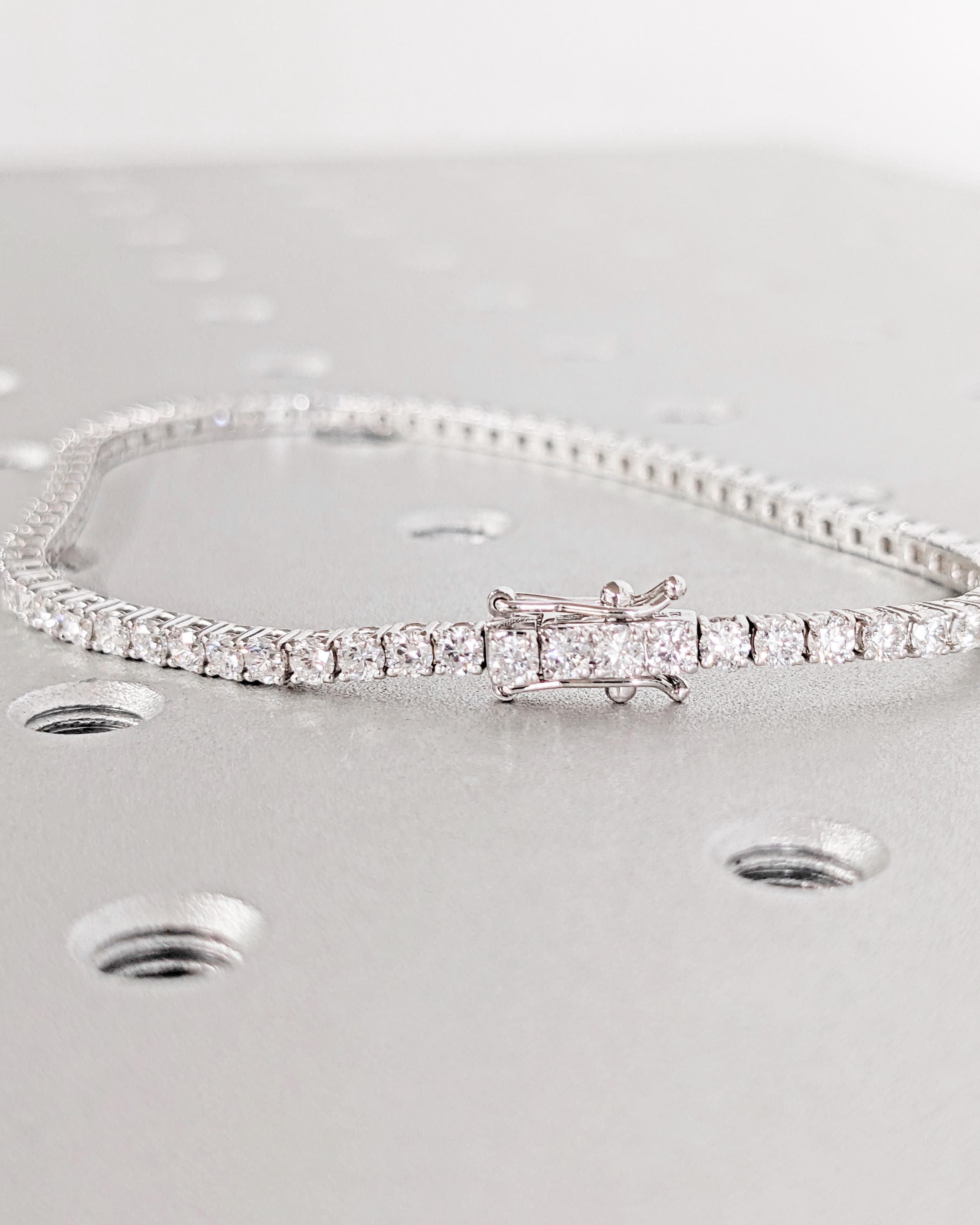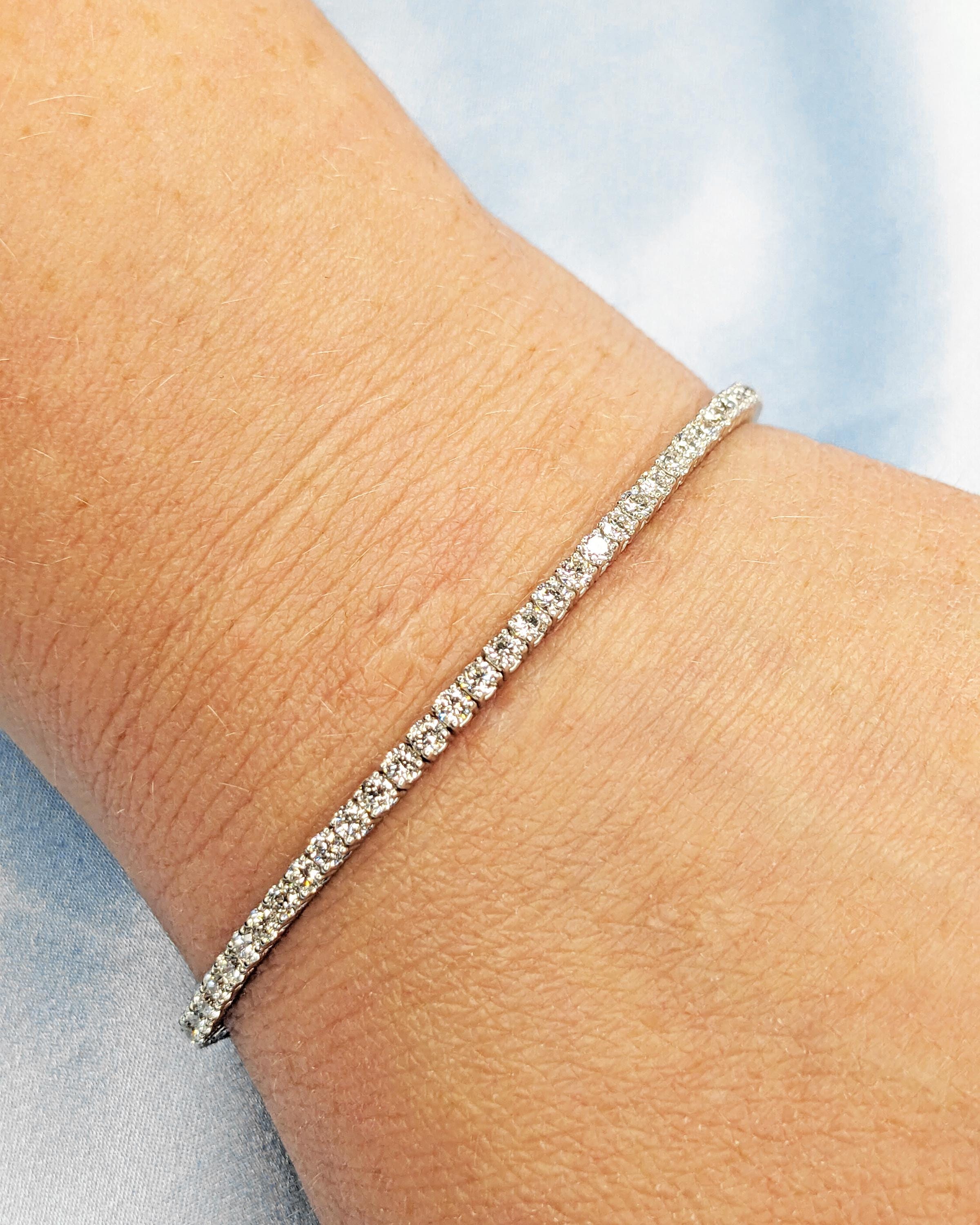 Elegant and timeless, this classic diamond tennis bracelet adds classic charm to any bridal outfit. The prong set round stones sparkle beautifully with every movement. Finished with an open box clasp for comfort and security. Wear it on your wedding day and beyond for lasting elegance. Style it solo for a clean bridal look or stack it for modern glamour.